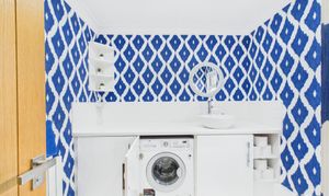 Tiled flooring, hand basin, WC, base units with integrated tumble dryer and washing machine, window with rear aspect, column radiator, oak door