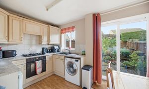 This is situated to the rear of the property and has a pvcu double glazed window looking out over the garden together with an adjacent pvcu sliding double glazed patio door. With ceiling light point, wood effect flooring, central heating radiator and fitted with a range of modern base and wall cupboards, drawers, contrasting overlying worktops with tiled splashbacks, inset one and half bowl single drainer sink with mixer tap, four ring gas hob with extractor hood over and electric fan assisted oven beneath, plumbing for automatic washing machine and under counter Hotpoint freestanding fridge and cupboard housing an ideal gas fired central heating boiler.