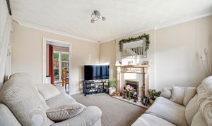 Comfortable and attractively presented reception room which has a pvcu double glazed window looking out over the front garden together with an adjacent composite panelled and frosted double glazed door. To one side a spindled staircase rises to the first floor with useful storage beneath, there is a ceiling light point, ceiling coving, central heating radiator and as the main focal point of the room there is a feature fireplace with timber surround, conglomerate marble inset and home to a coal effect gas fire which rests on a conglomerate marble hearth. From the living room a door opens into the dining/kitchen.