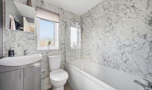 With a ceiling light point, extractor fan, easy clean panelled walls to two elevations which are floor to ceiling in height and fitted with a suite comprising panelled bath with glazed shower screen and electric shower fitting over, vanity unit incorporating wash basin, low w.c and central heating radiator.