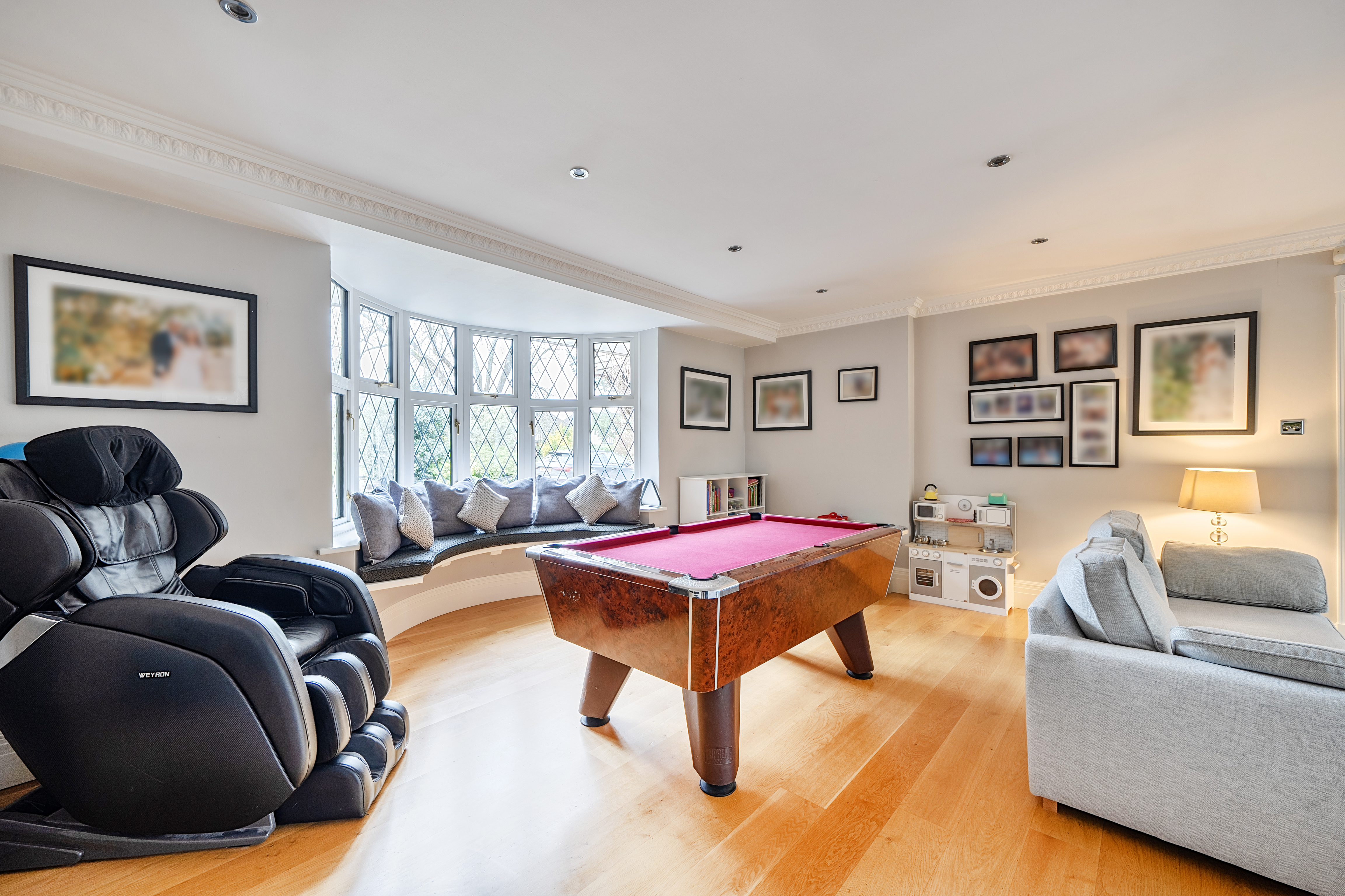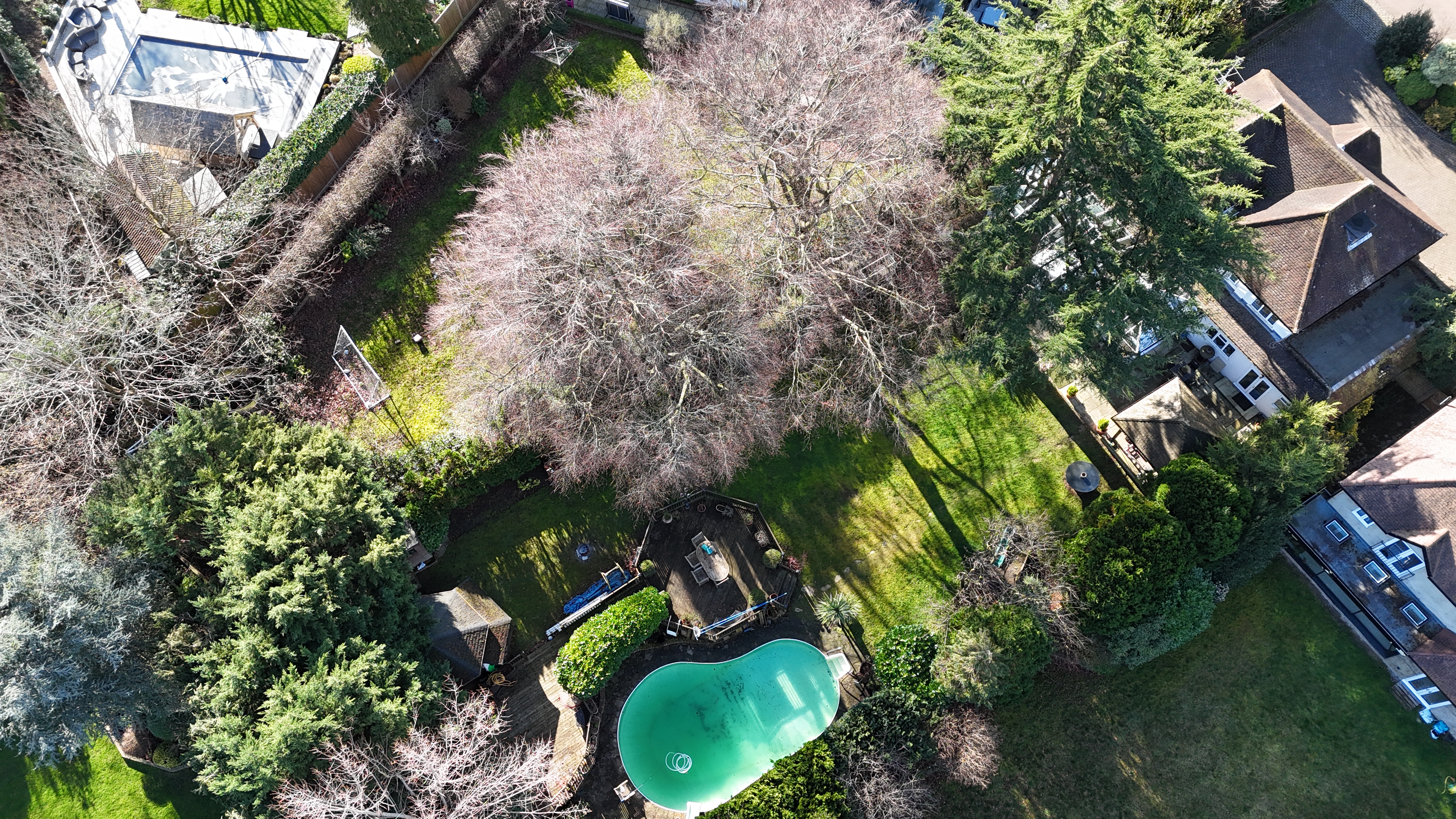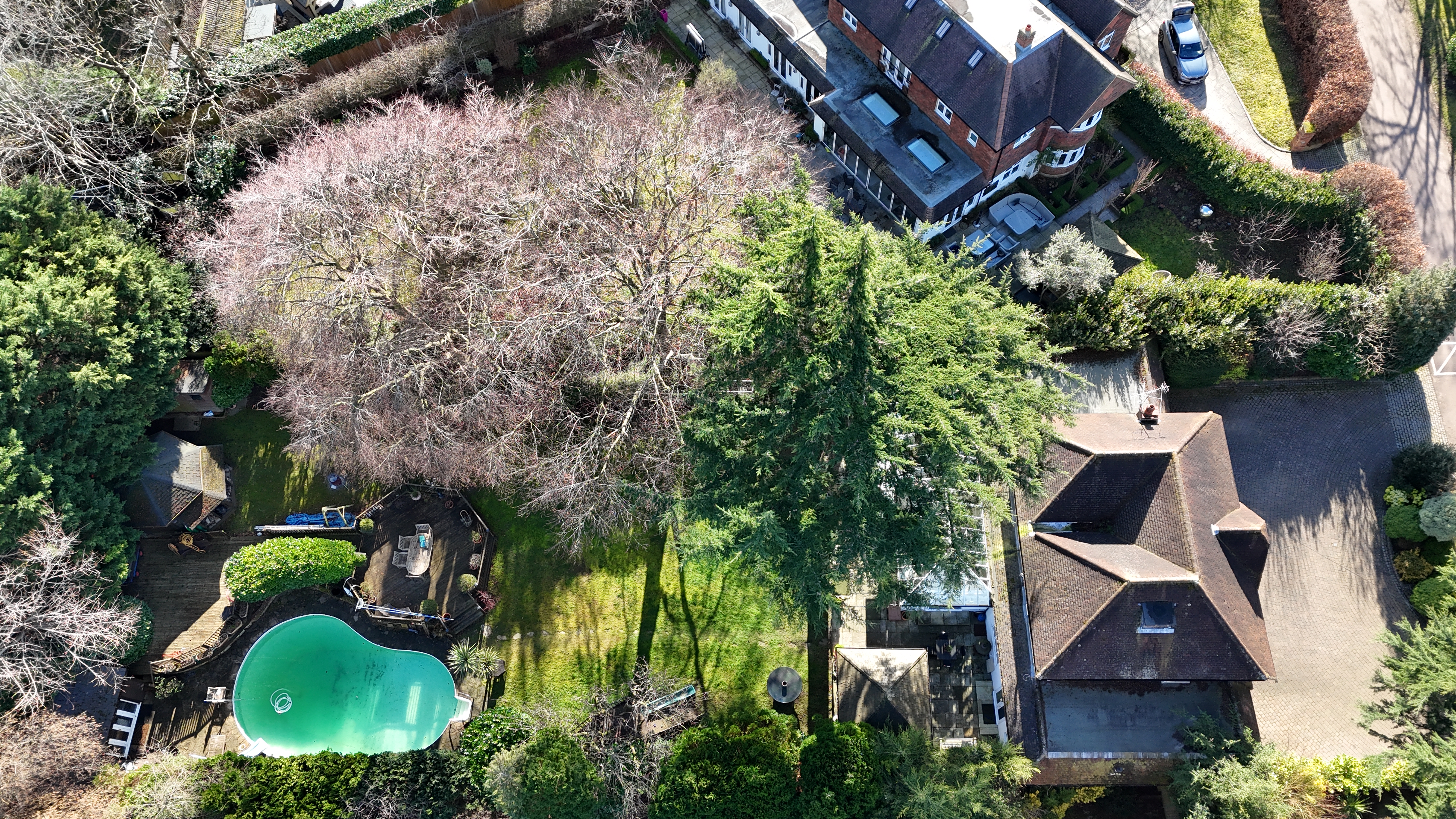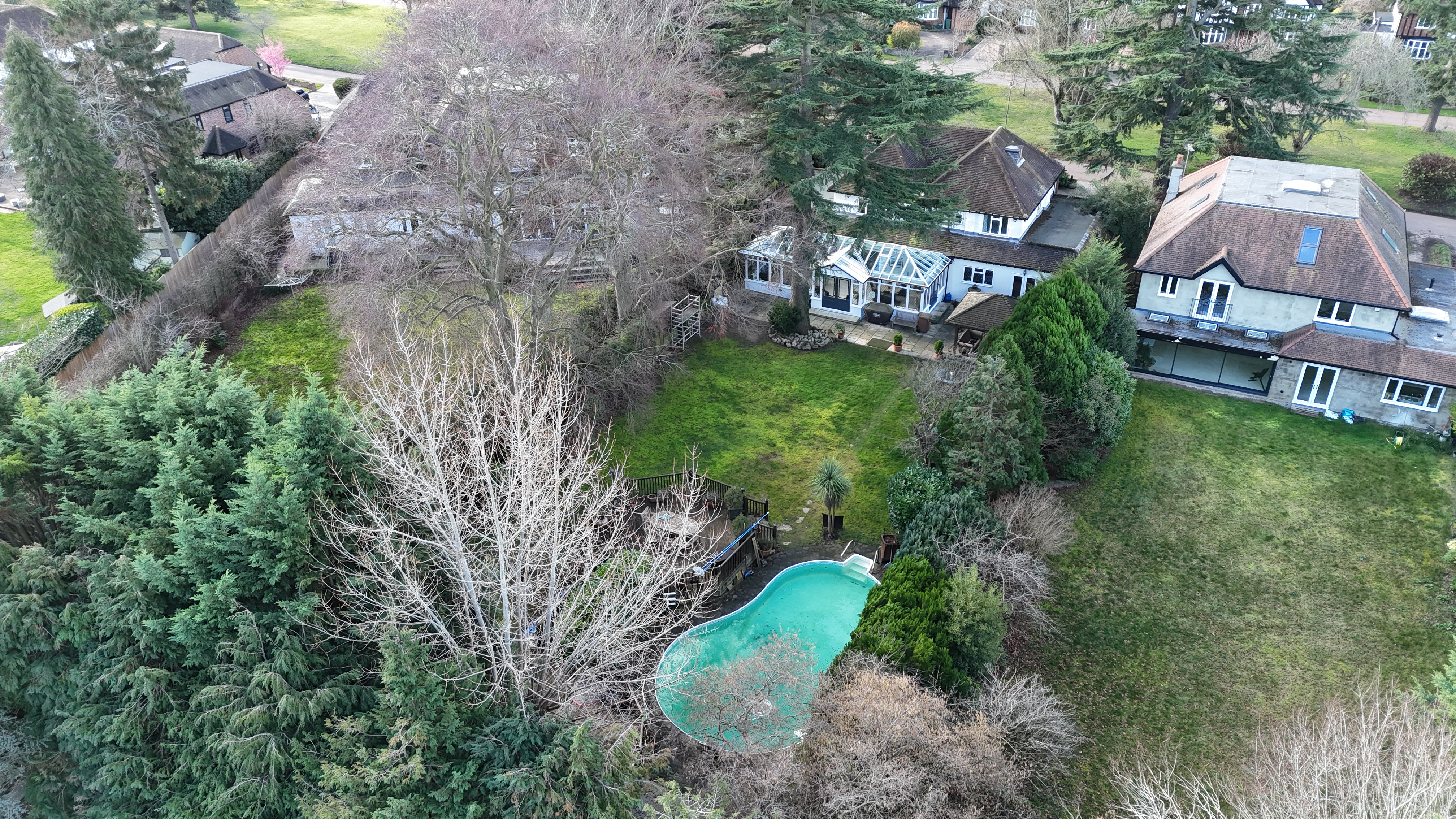 The outdoor space is equally impressive. A beautifully landscaped garden with raised terraces provides the perfect setting for al fresco dining and relaxation. The outdoor swimming pool serves as a standout feature, creating a private retreat for leisure and summer entertaining. A versatile summerhouse offers further adaptable space, ideal as a home office, gym, or tranquil escape. The property is approached via a generous in-and-out driveway, providing ample parking for several vehicles and access to the integral garage, reinforcing the sense of exclusivity. Mature planting and thoughtfully designed exterior lighting enhance both privacy and ambience.