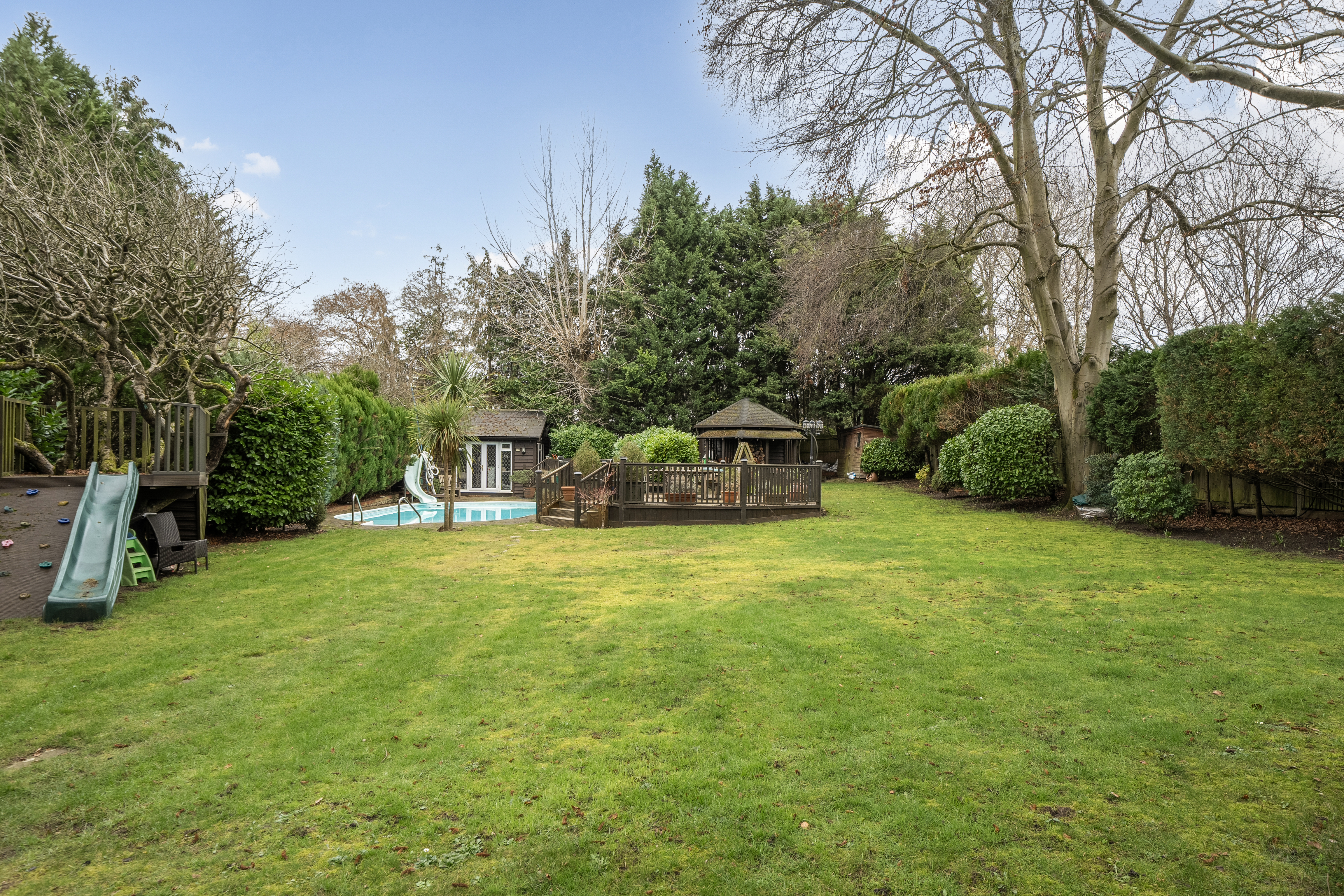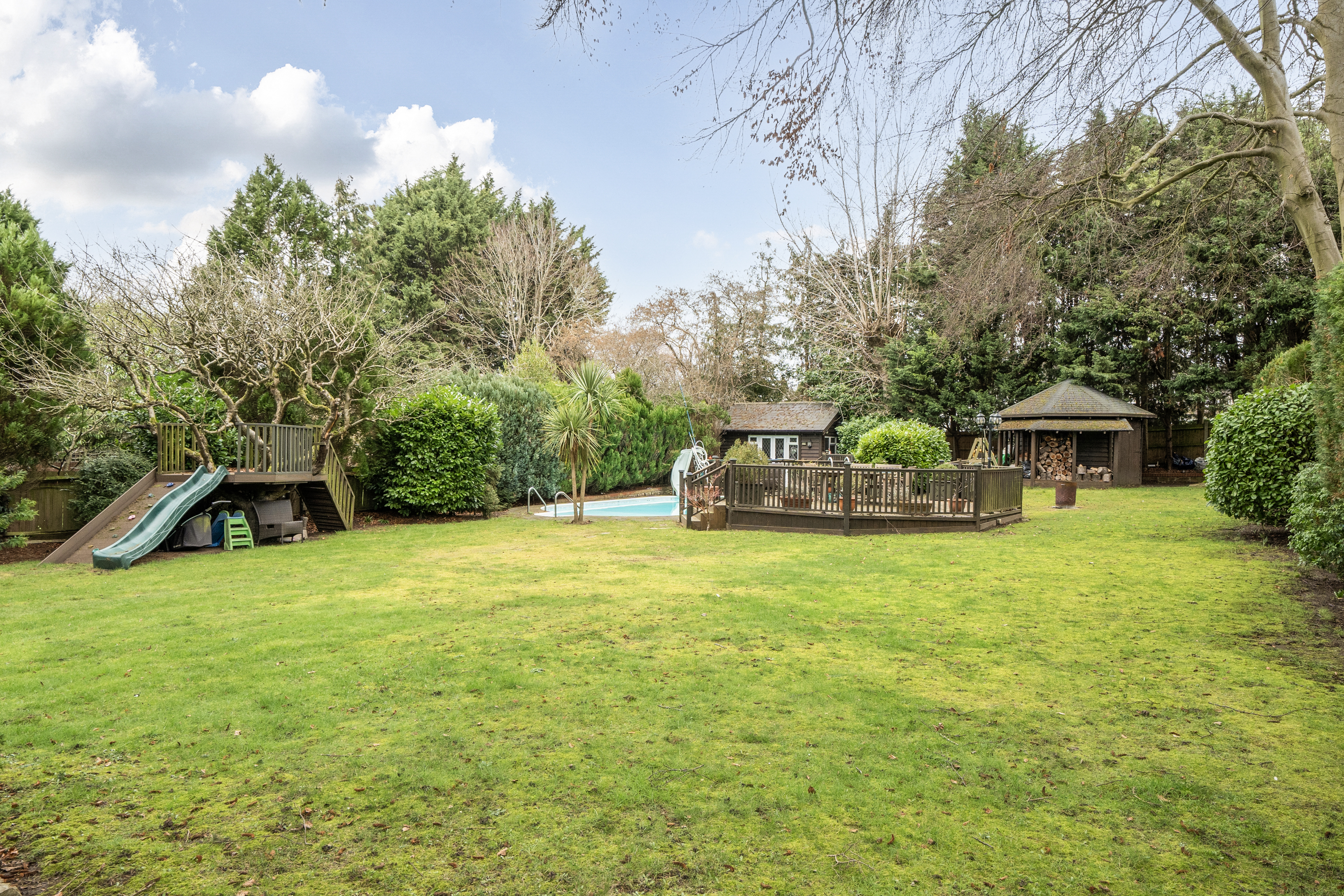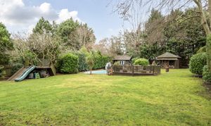 Large garden with outdoor pool, raised terraces and summerhouse. Solid oak gazebo/ seating area with built in heaters. Additional Hexagonal building with outside log store, can be used as a gym/office.