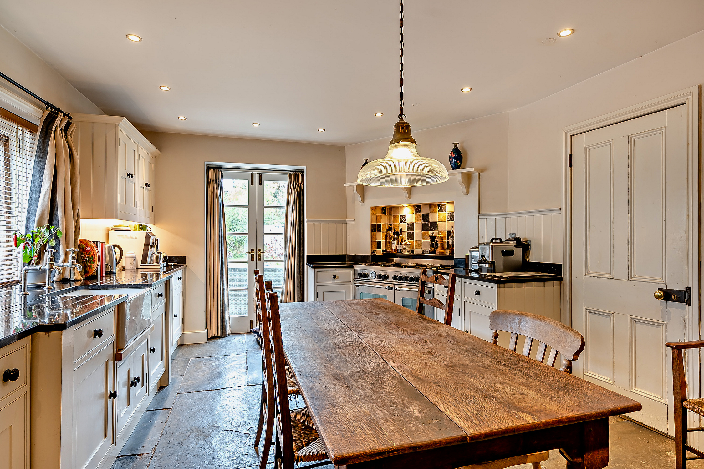 At the far end of the house is the kitchen: bespoke cabinetry under black granite, flagstone floors, and French doors to the patio. There’s also a side door, a courtesy door to the snug, and a downstairs WC and utility room.