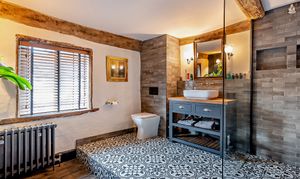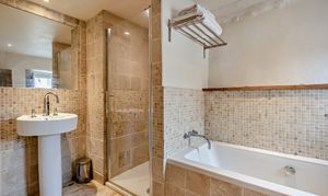 - Principal suite with Travertine tiled en suite - bath, shower cubicle, built-in storage and stone finishes a luxurious retreat.
