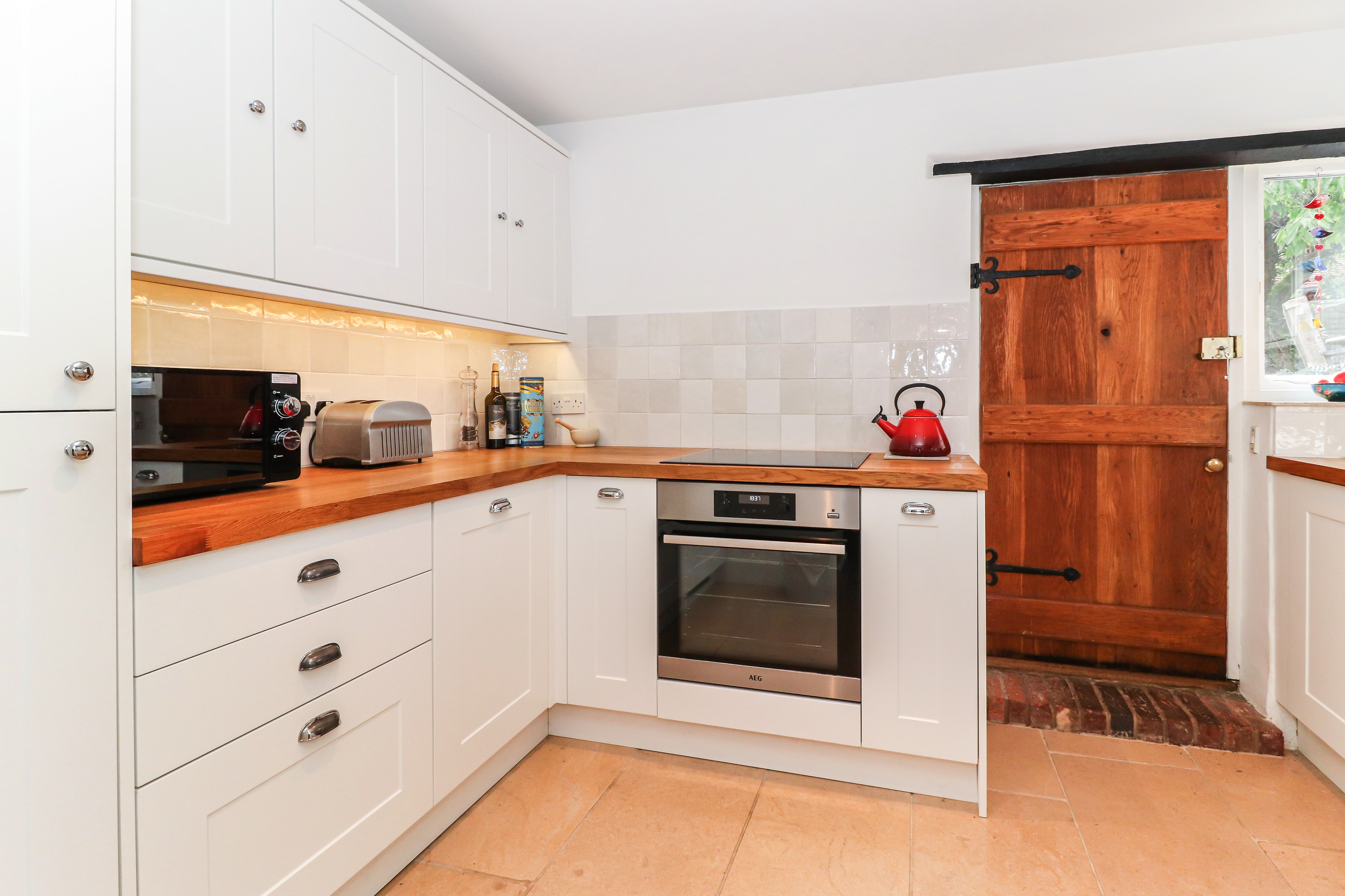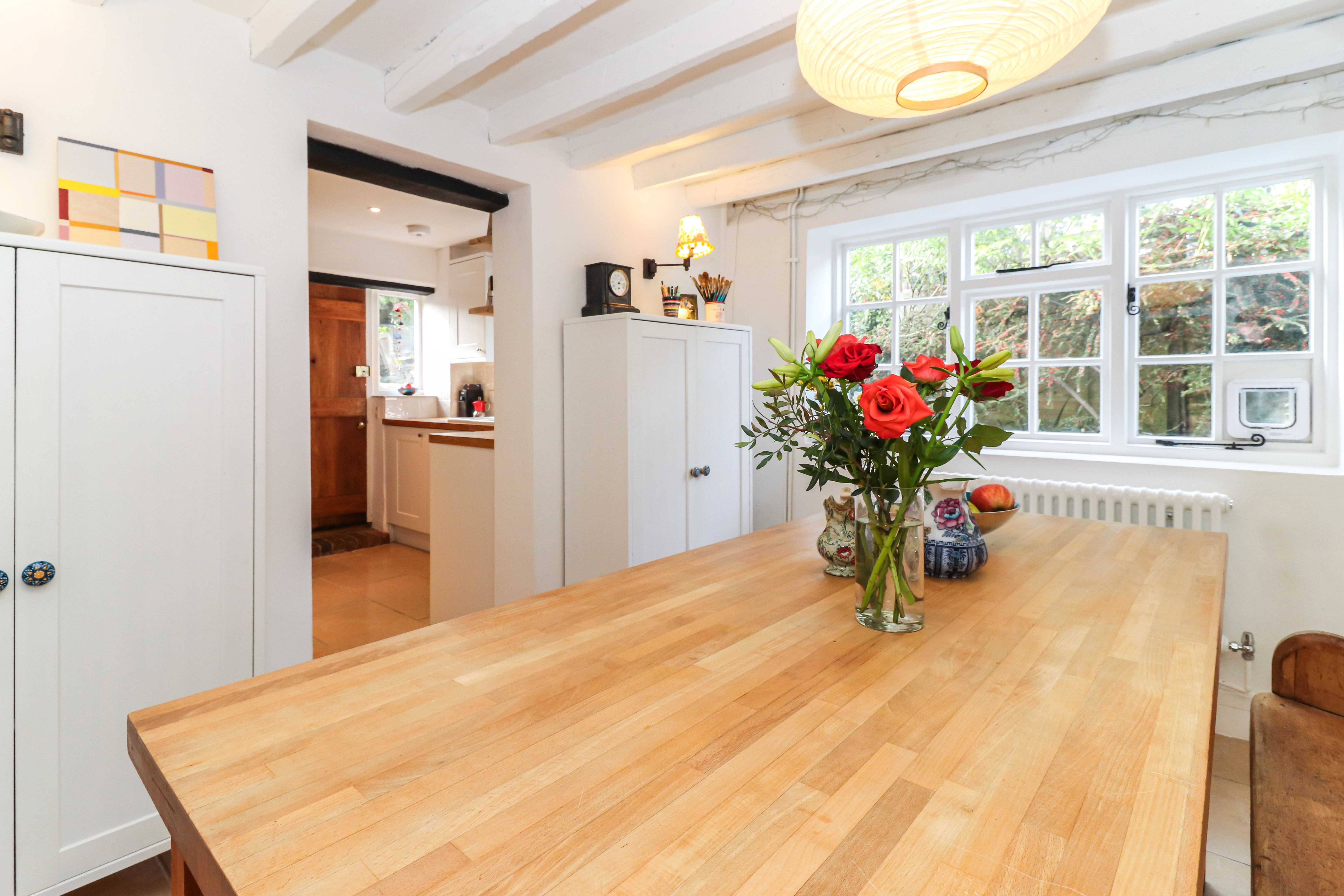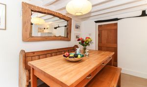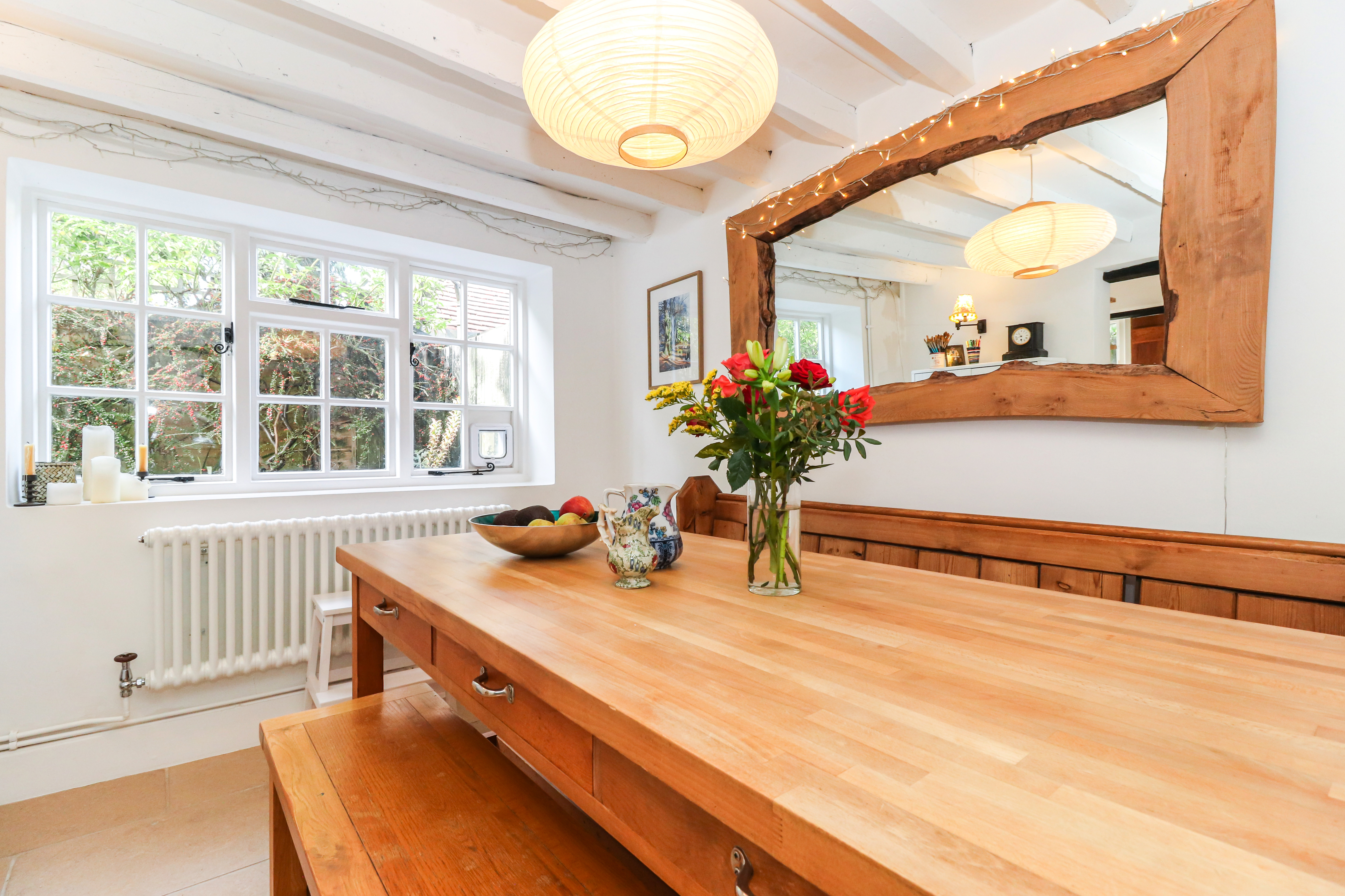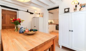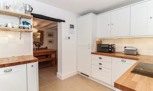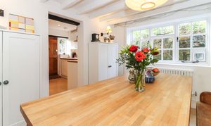 Entering on the ground floor, you are welcomed in to a warm and inviting sitting room, with leaded windows, wooden flooring and a lovely Inglenook fireplace. This spacious room offers plenty of space and flows directly in to a dining room - a Victorian addition - and then on to the refitted kitchen. The kitchen itself has been tastefully refitted in a classic shaker style, with wooden worktops and a limestone tiled floor - whilst also offering modern elements, such as underfloor heating and a range of integrated appliances.