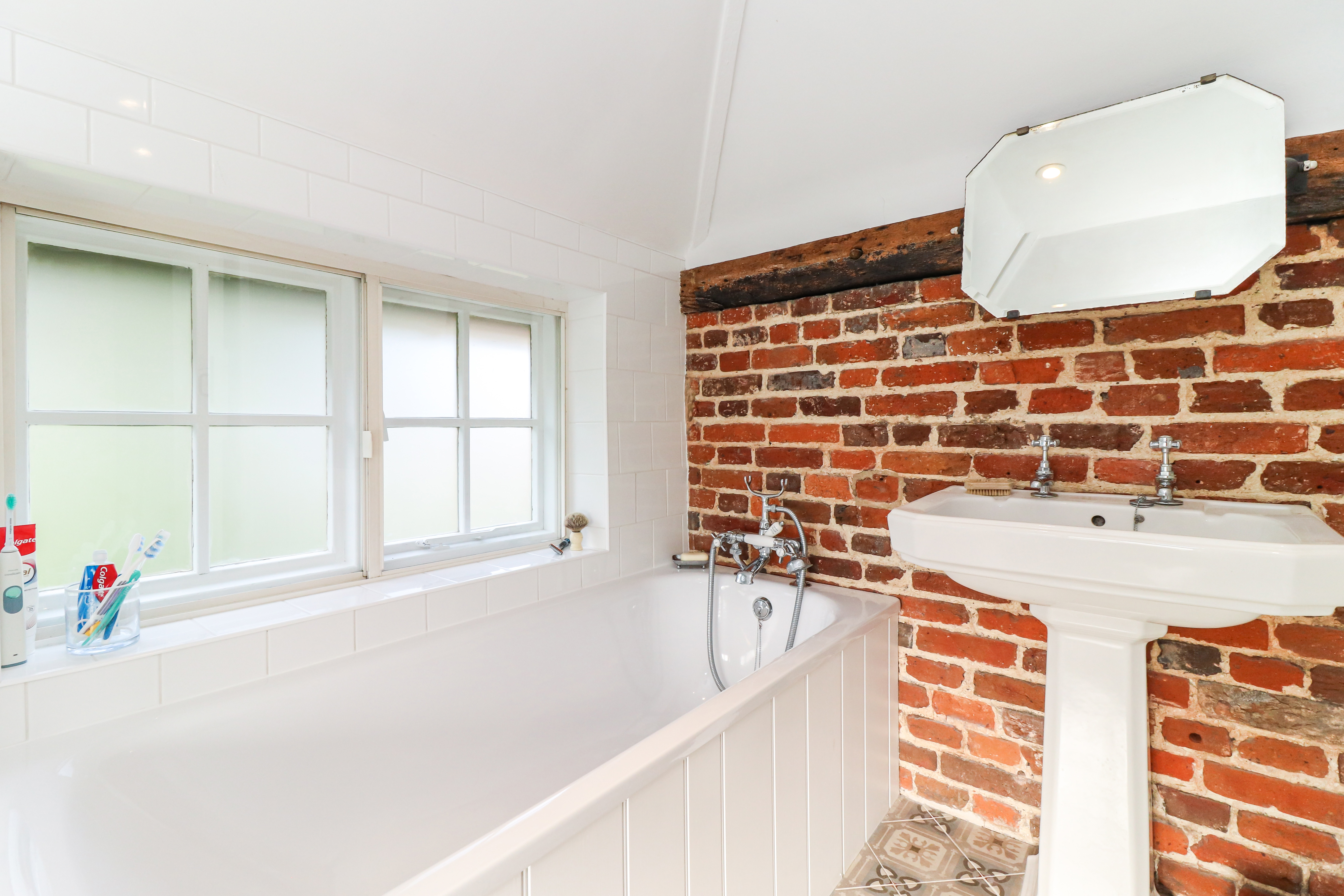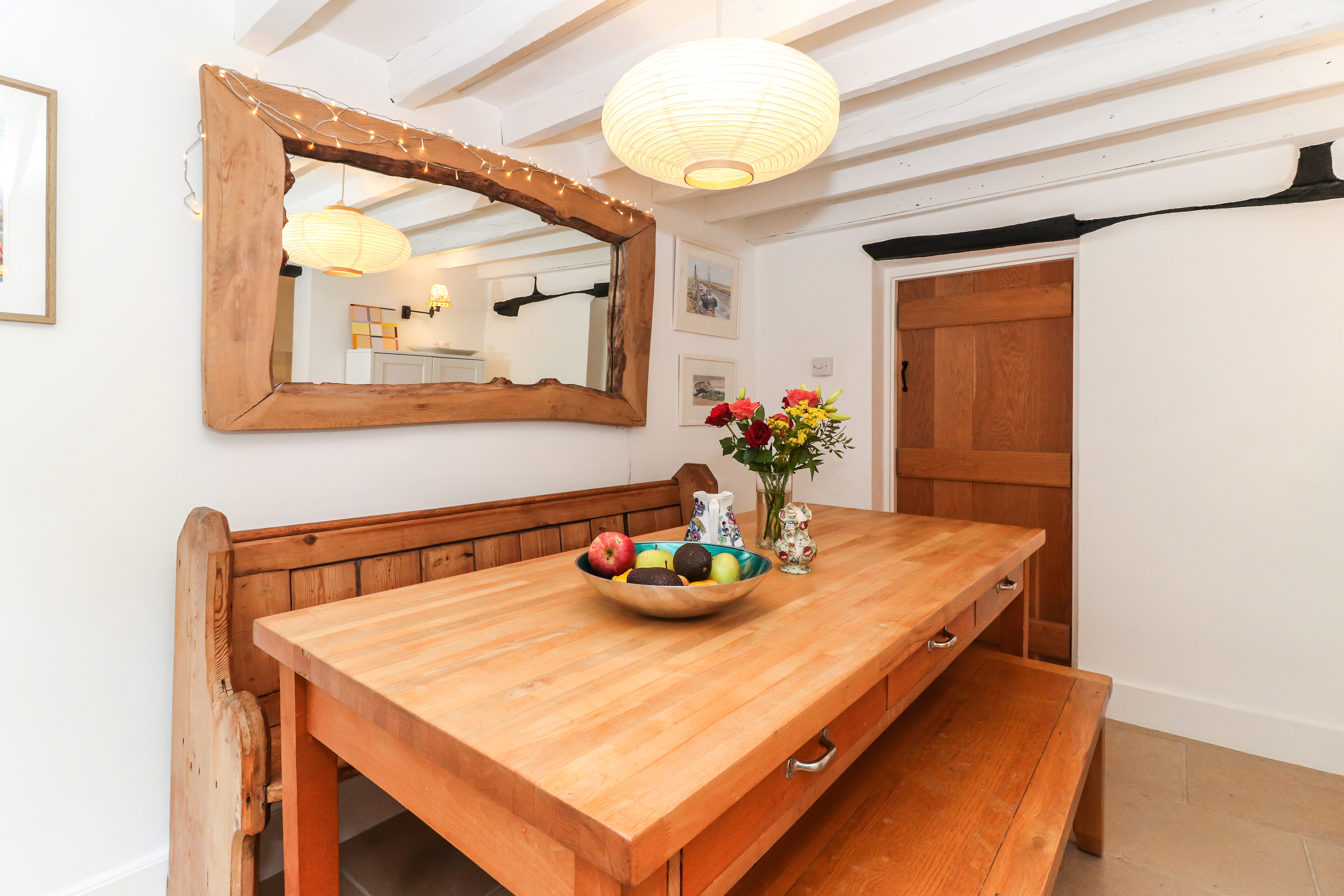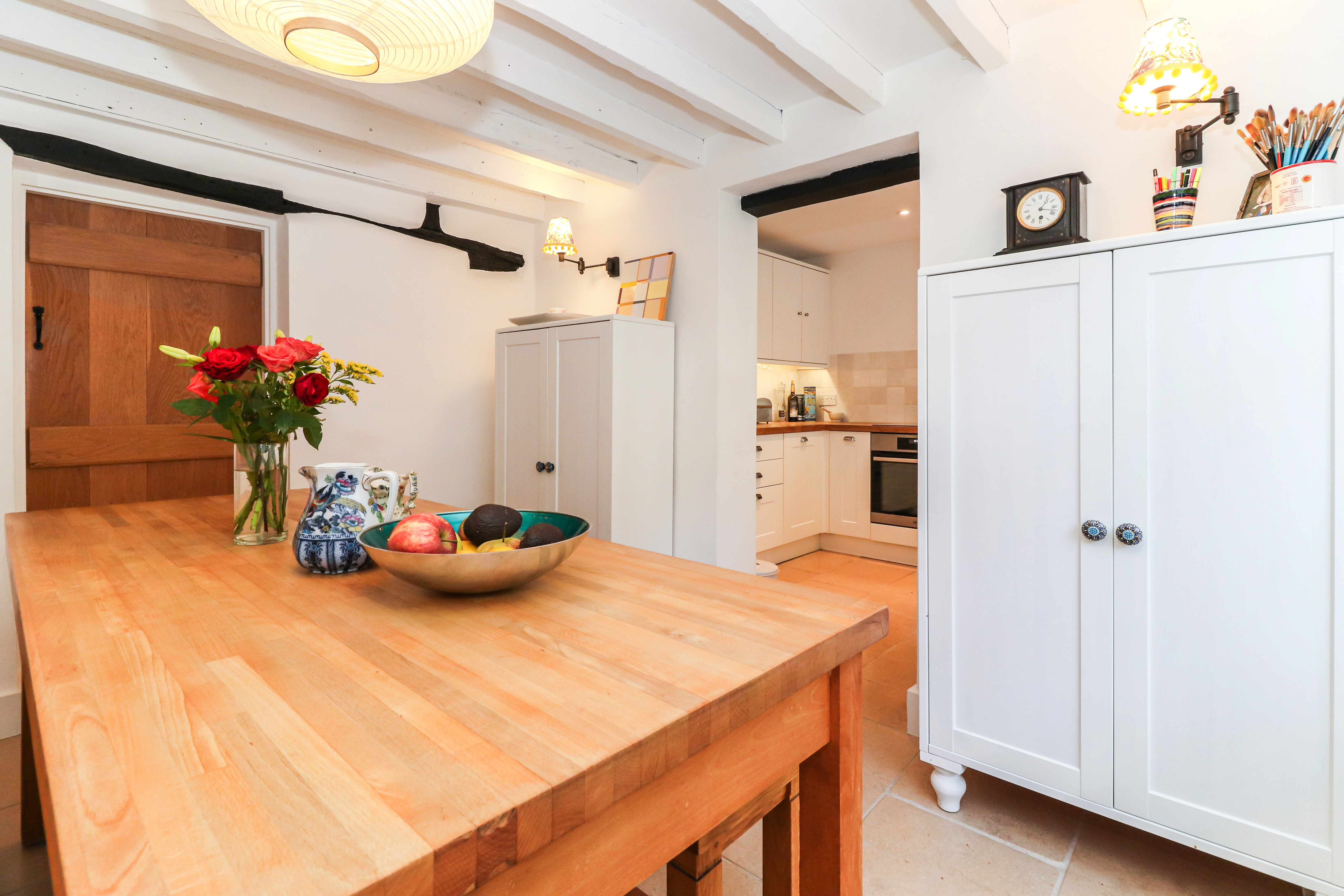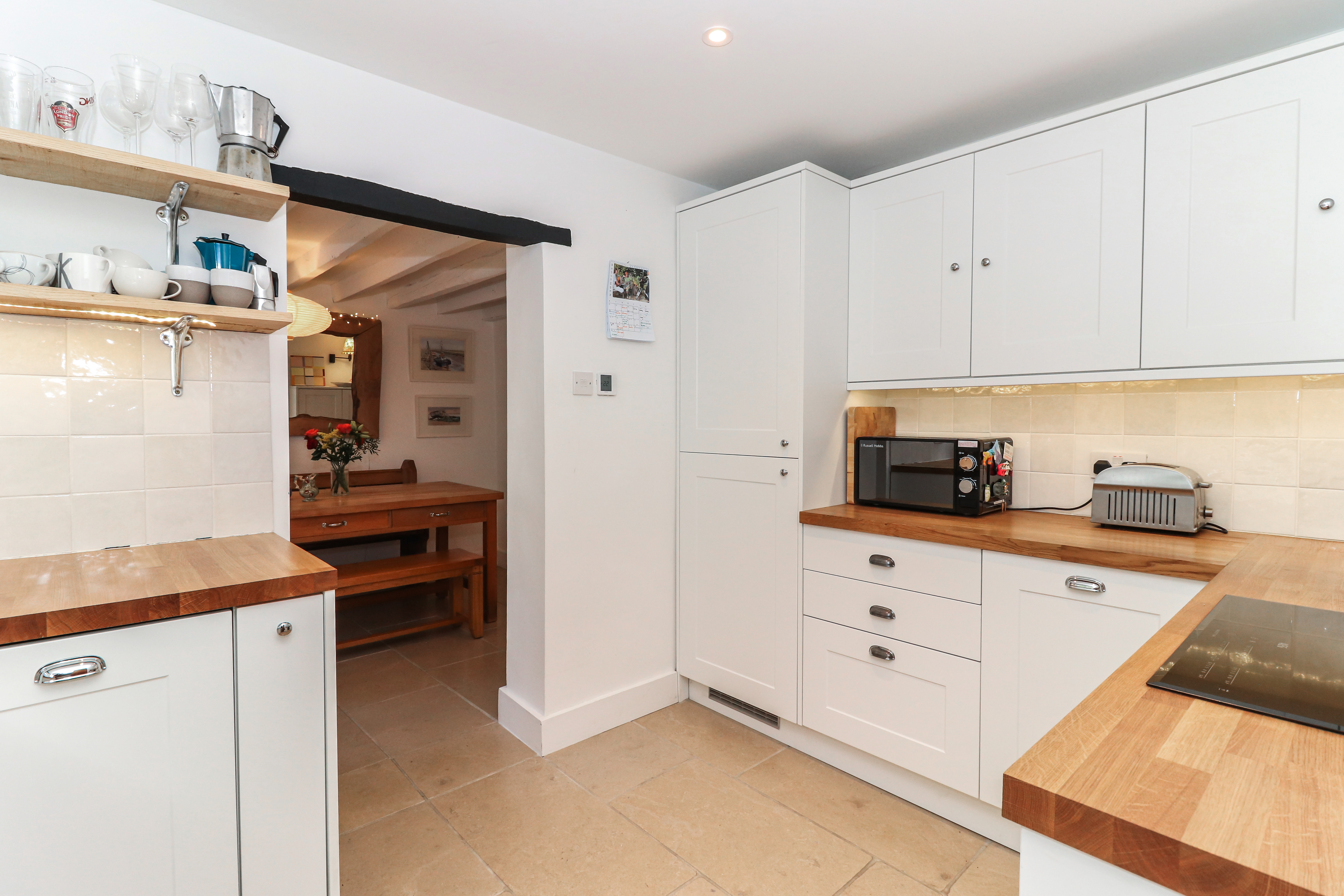Entering on the ground floor, you are welcomed in to a warm and inviting sitting room, with leaded windows, wooden flooring and a lovely Inglenook fireplace. This spacious room offers plenty of space and flows directly in to a dining room - a Victorian addition - and then on to the refitted kitchen. The kitchen itself has been tastefully refitted in a classic shaker style, with wooden worktops and a limestone tiled floor - whilst also offering modern elements, such as underfloor heating and a range of integrated appliances.