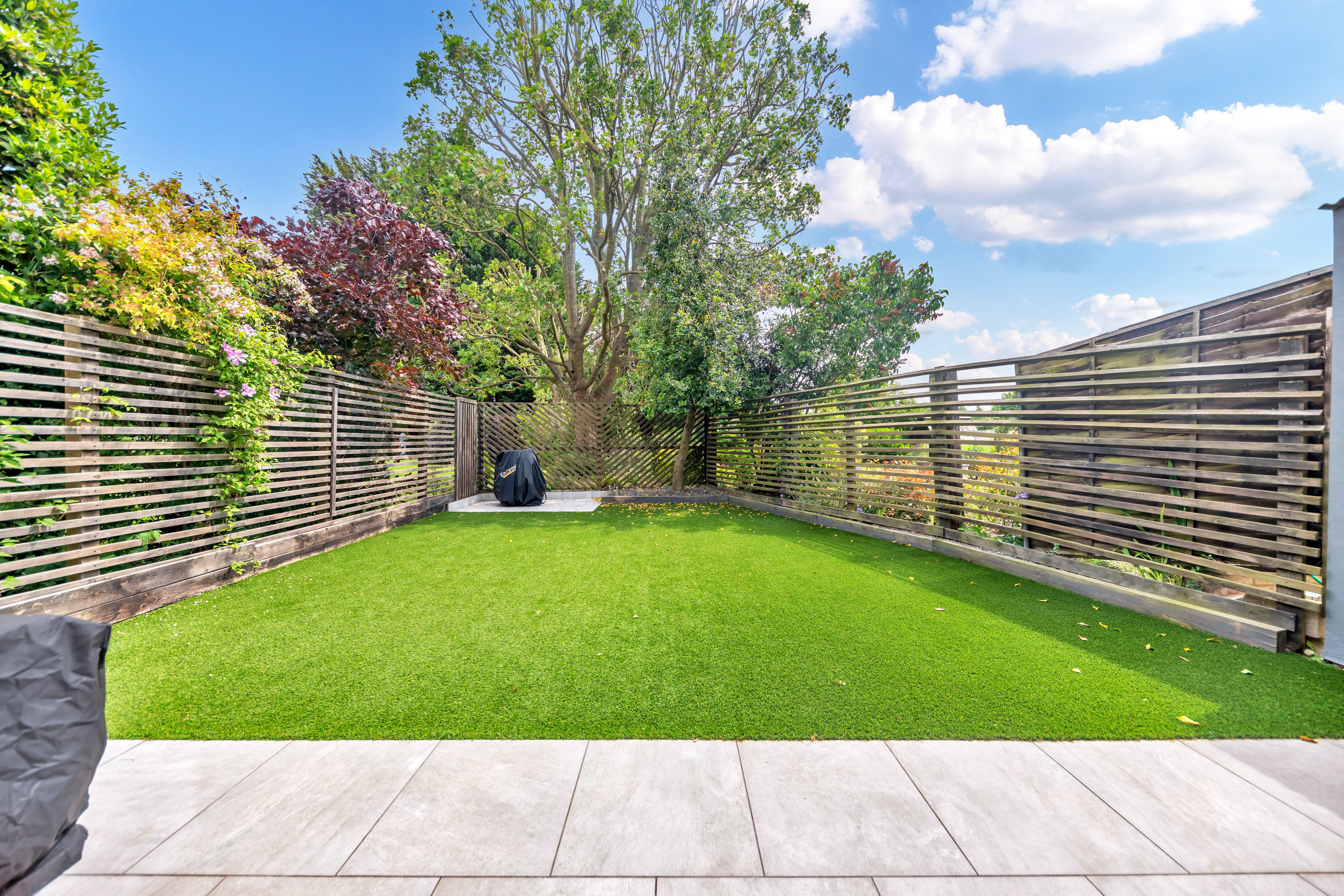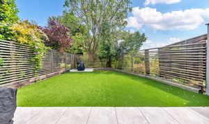 Outside, to the rear, the landscaped garden is a beautifully maintained space, fully enclosed by fencing and offering a private spot to sit and relax in the sun. The gardens are laid mainly to artificial lawn, with a large paved patio area by the house, providing ample space for garden furniture, cooking meals al fresco, and entertaining guests. There are lovely raised planters with plants, flowers and mature trees, and plenty of scope for new owners to put their own stamp on things.