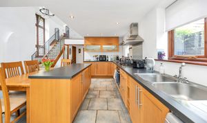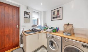 The open-plan kitchen/dining/living room is truly a magnificent space and enjoys bi-fold doors out onto a lovely garden terrace, making it fantastic for entertaining. There are further windows to a side aspect, stairs to the first floor with an eye-catching galleried landing, tiled flooring, inset lighting and shelving, and vast amounts of space for lounge, dining and storage furniture. In the kitchen area, there is a wide range of modern base and wall units, laminate worktops, a large island/breakfast bar, an integrated oven, gas hob and extractor hood, and space for a dishwasher and other small kitchen appliances. The utility room provides further storage, access to the side of the property, and space for large laundry appliances.