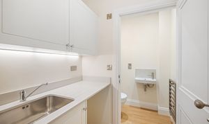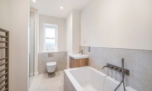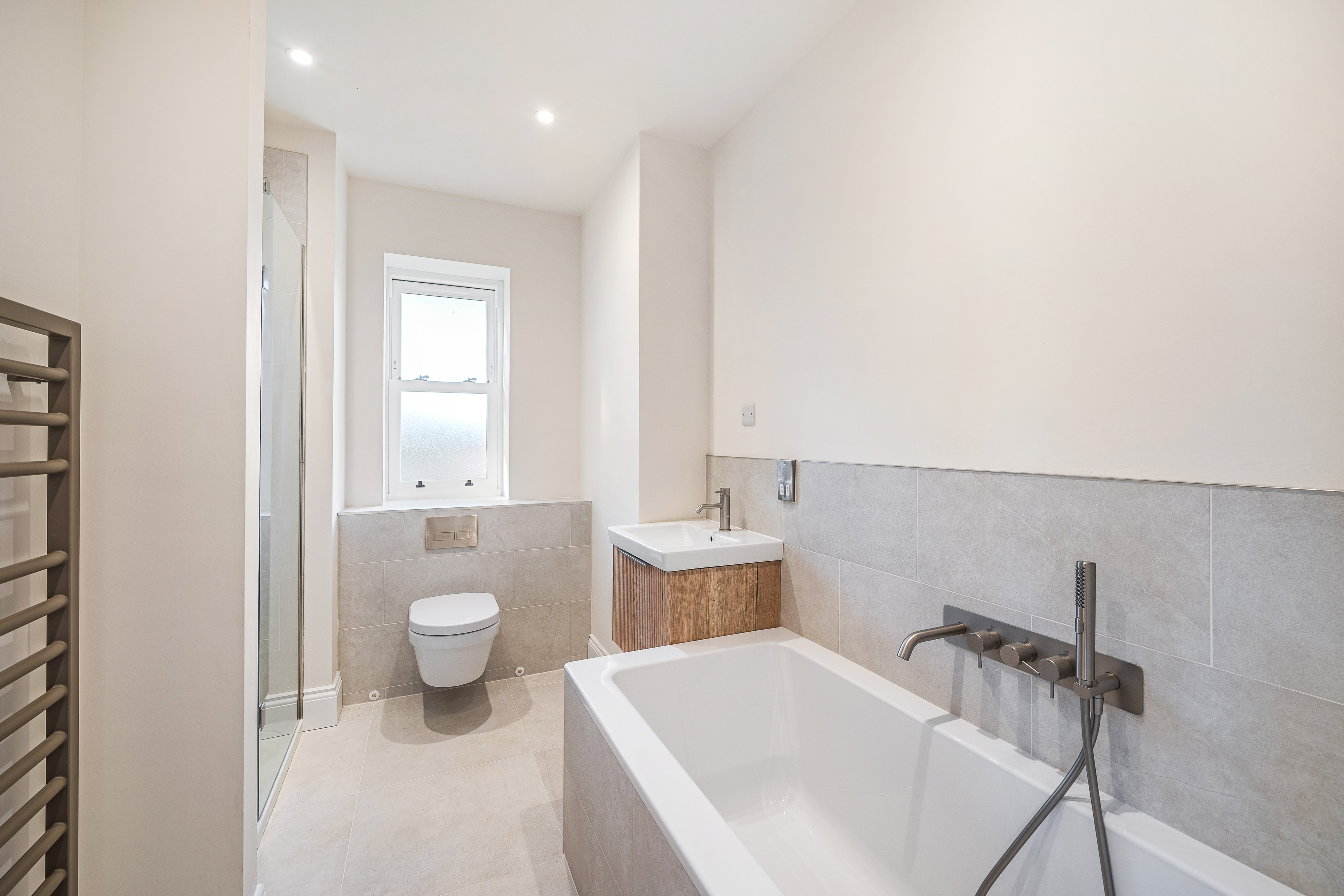 Offered For Sale with No Chain, high ceiling cornices, gas fired central heating and arched double glazed sash windows the property comprises in brief. Reception hall with a guest wc. Open-plan dining kitchen, complete with Amtico parquet flooring, white Shaker-style wall and base units, Silestone worktops, and integrated appliances by AEG and Zanussi, along with a built-in wine chiller. Generous sized living room with Amtico parquet flooring and carpet inset. At the rear, a stairwell provides access to a raised decked sun terrace, with steps leading down to the lawned garden and adjacent allocated parking spaces. First floor landing, the property offers a spacious dual-aspect principal bedroom with a modern en-suite shower room finished in porcelain tiling, bedroom two and a smart house bathroom with a separate walk in shower. Second floor landing, two further bedrooms, as well as a modern shower room.