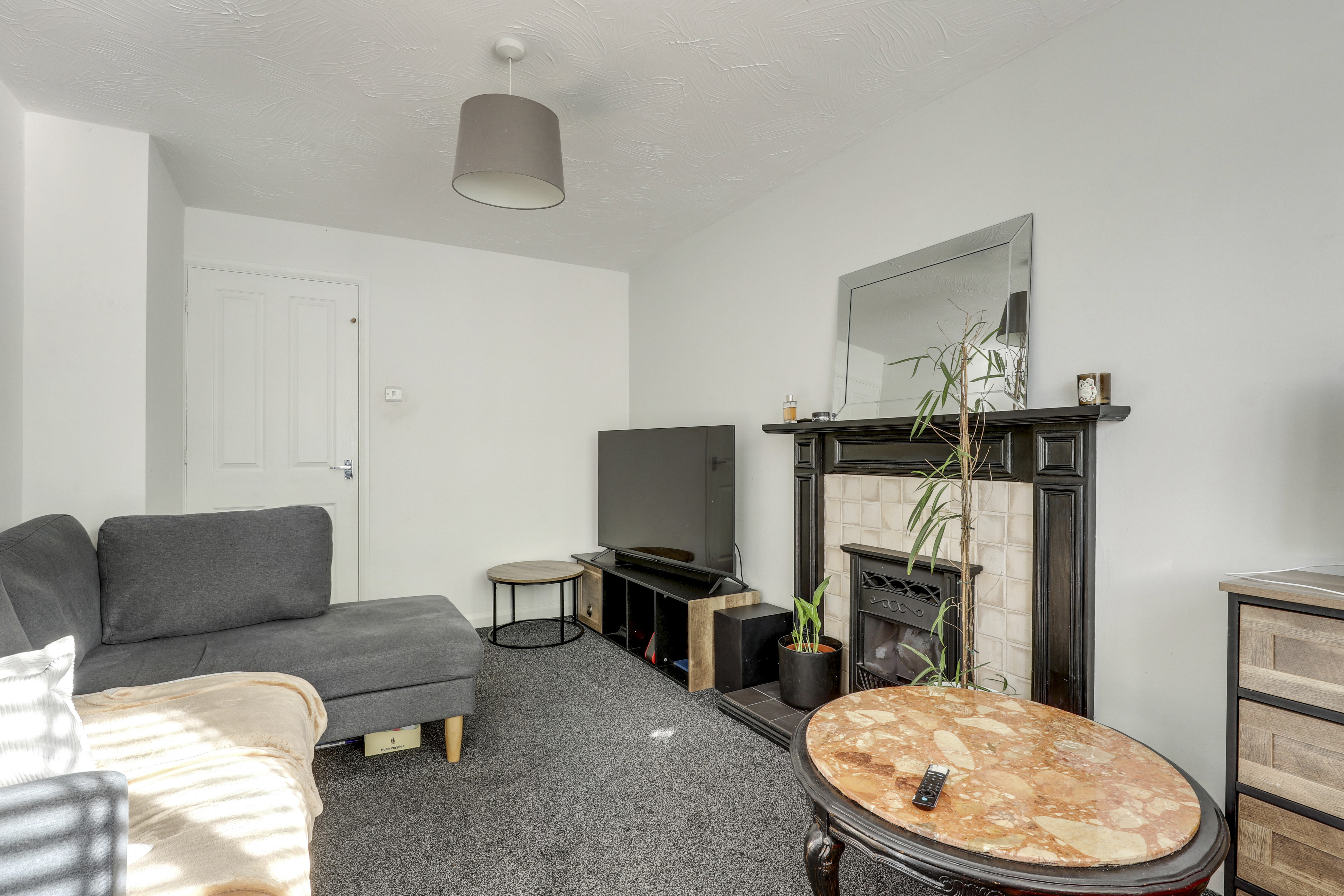 The living room has carpeted flooring, a radiator, a feature fireplace and a window to the front elevation.