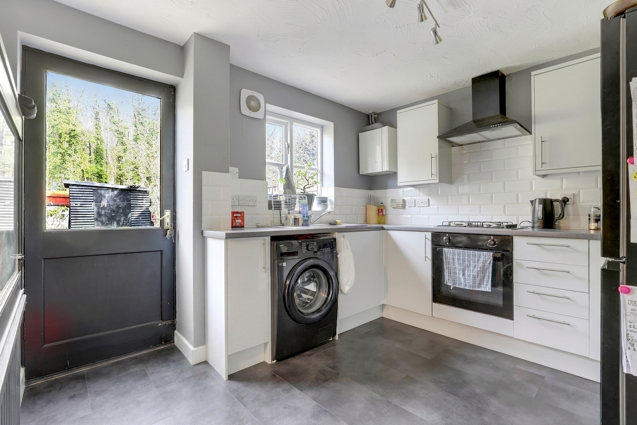 The kitchen has a range of fitted base and wall units with rolled-edge worktops, a stainless steel sink with a drainer and a mixer tap, an integrated oven, a gas hob and an extractor hood, space and plumbing for a washing machine, partially tiled walls, a radiator, vinyl flooring, a window to the rear elevation and a single door providing access to the rear garden.