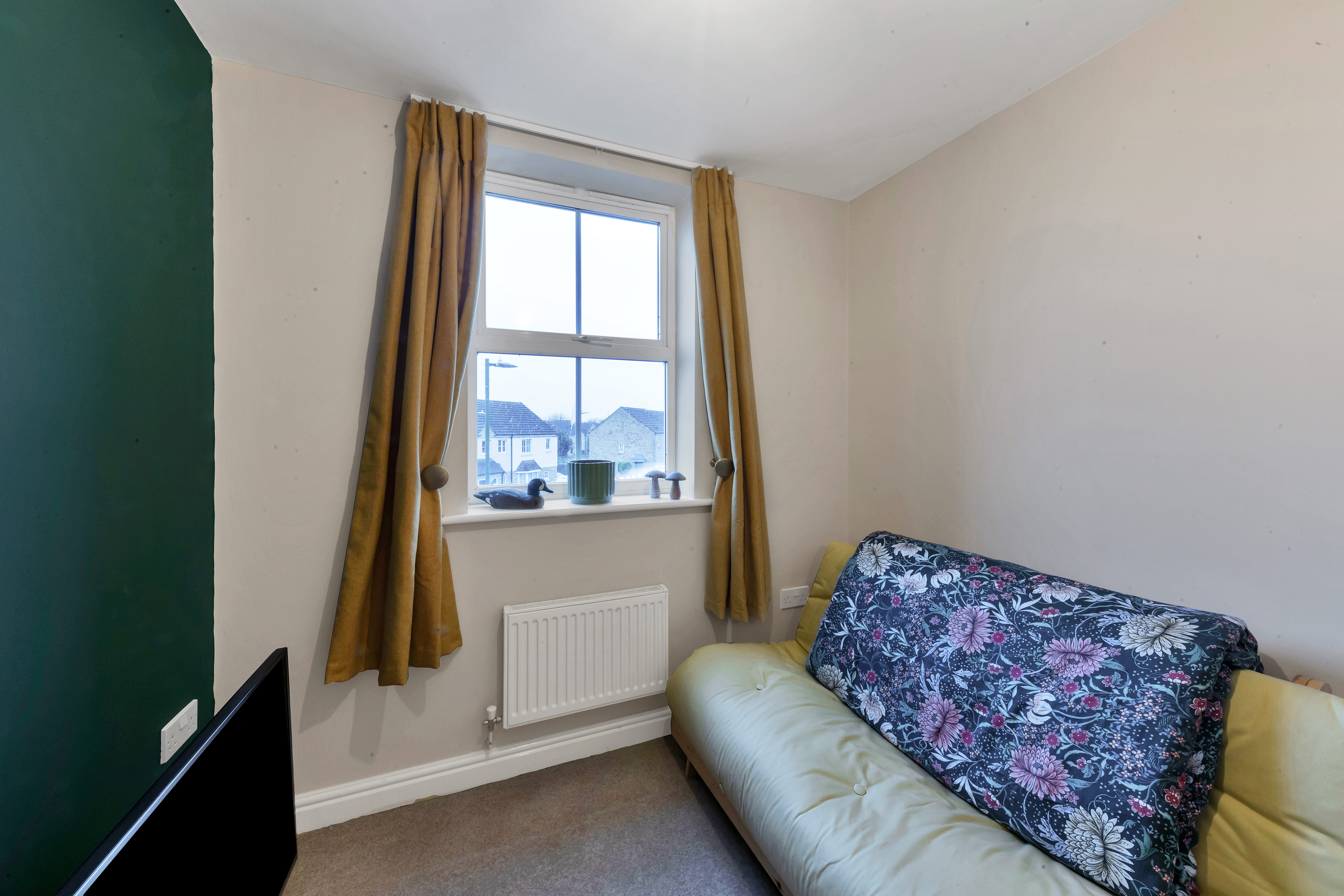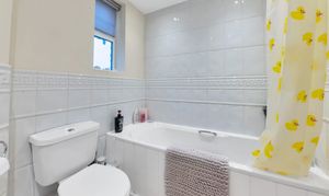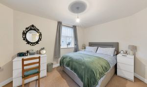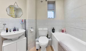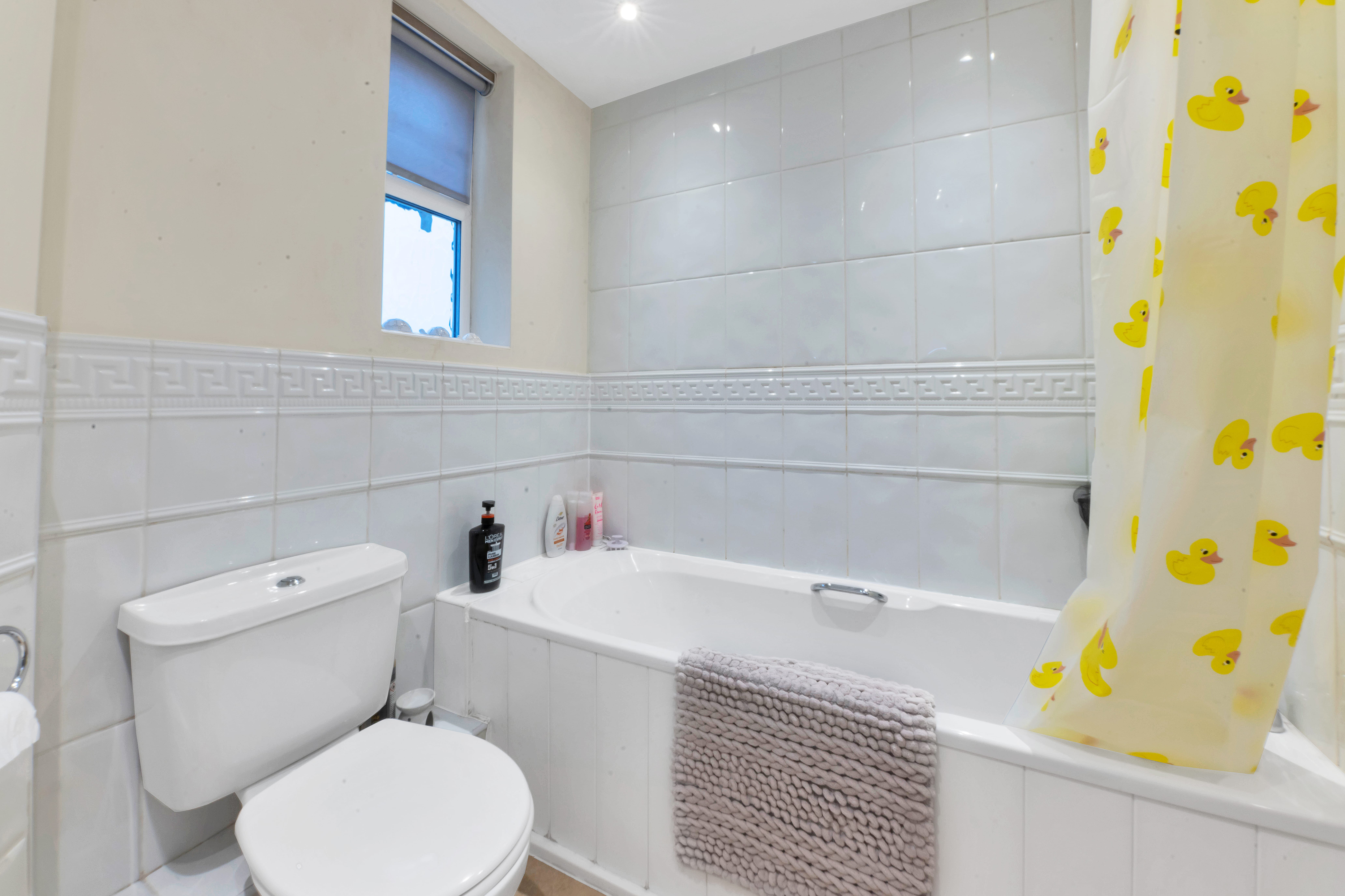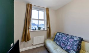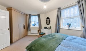 In the sleeping quarters, there are 2 generously sized bedrooms and a family bathroom, comprising a bath with an overhead shower, a WC, and hand wash basin. The master bedroom is particularly large, enjoying integrated wardrobes, thick cream carpets, and 2 windows to a dual aspect.