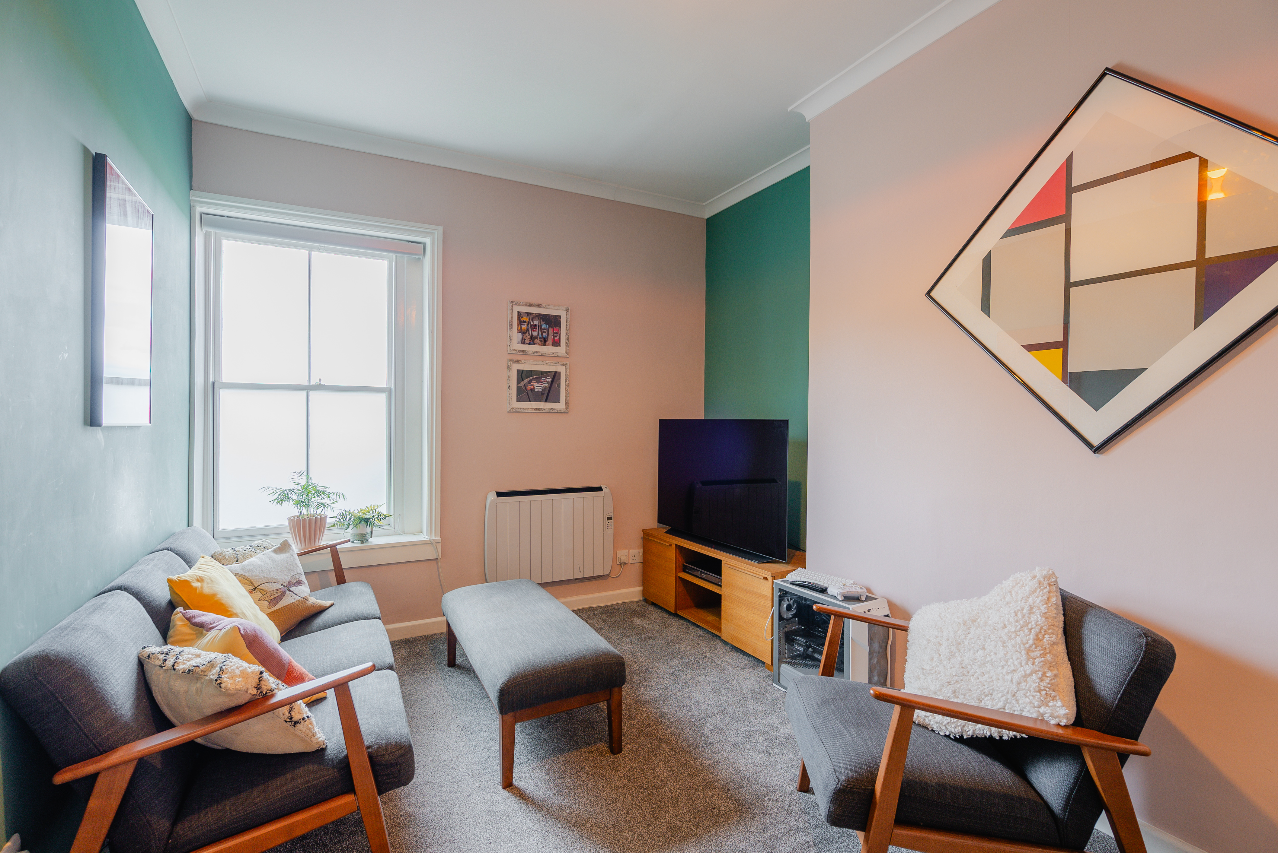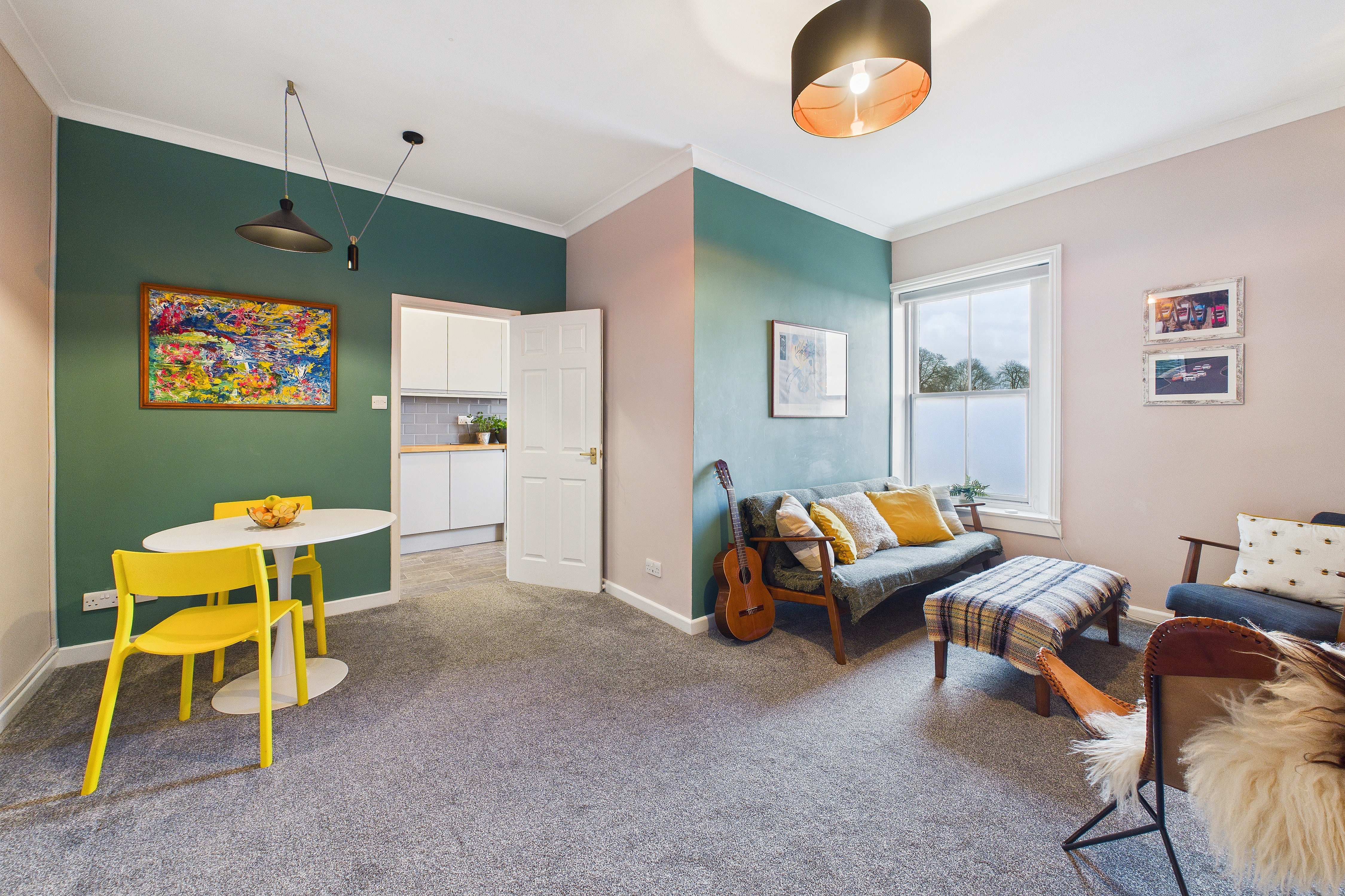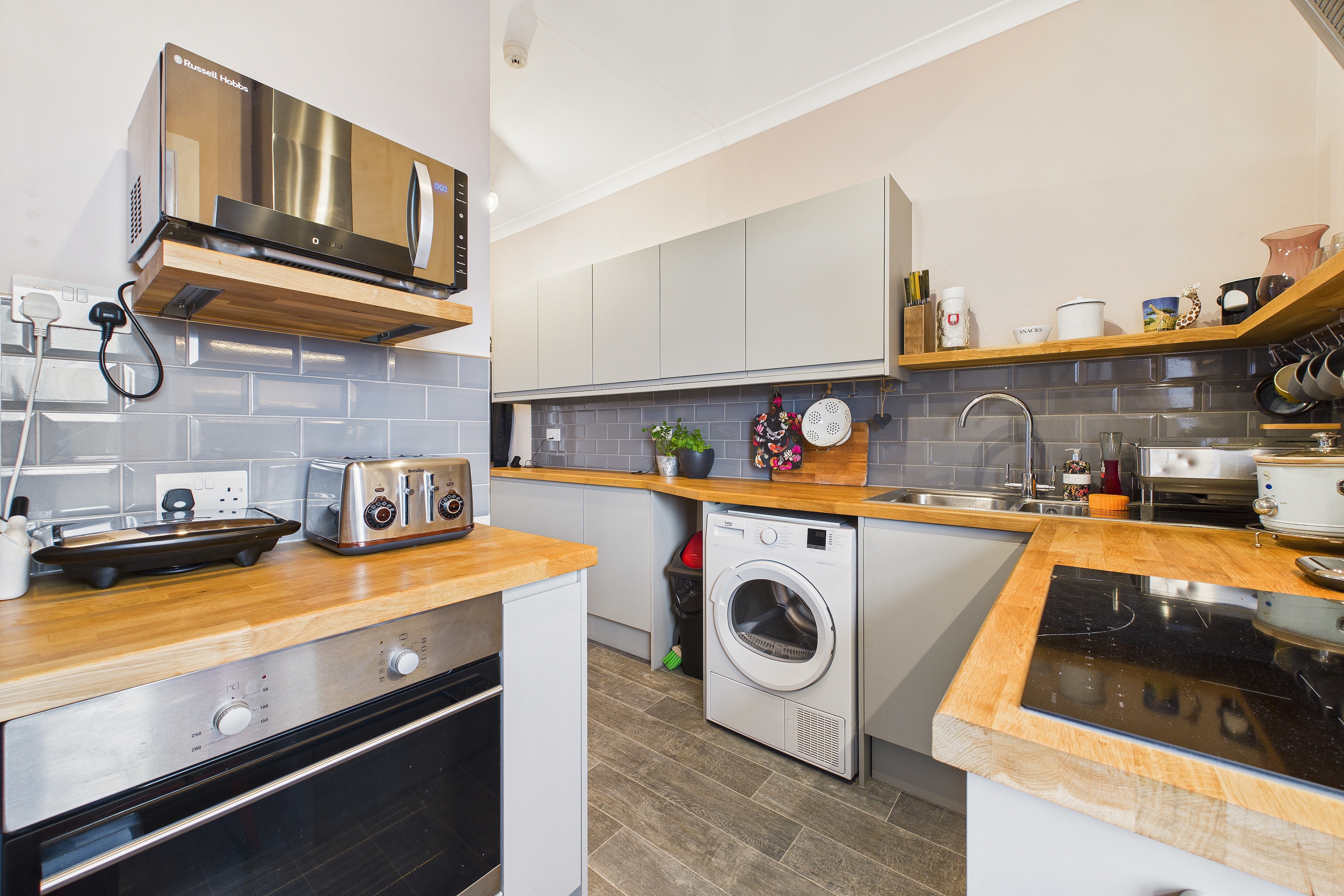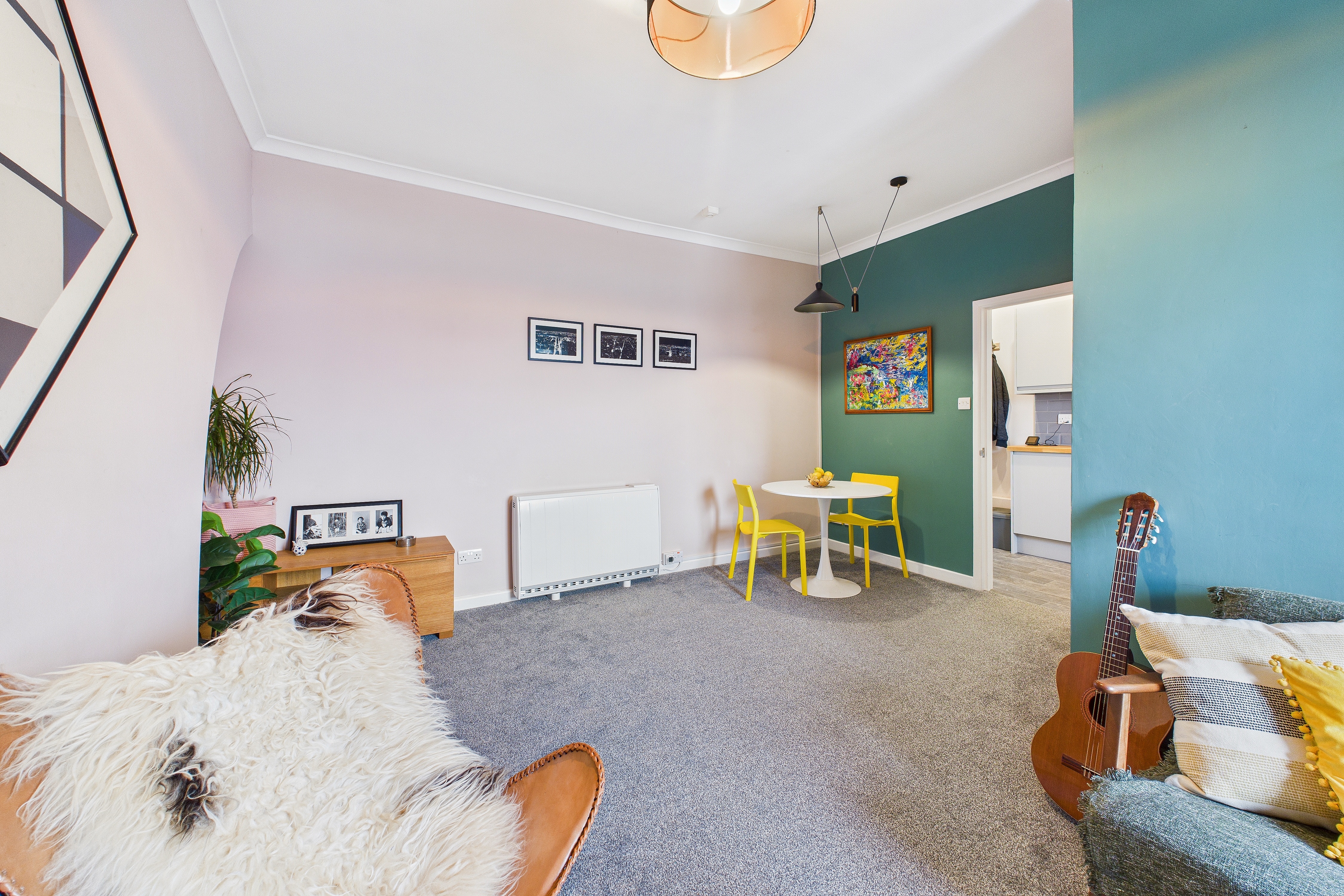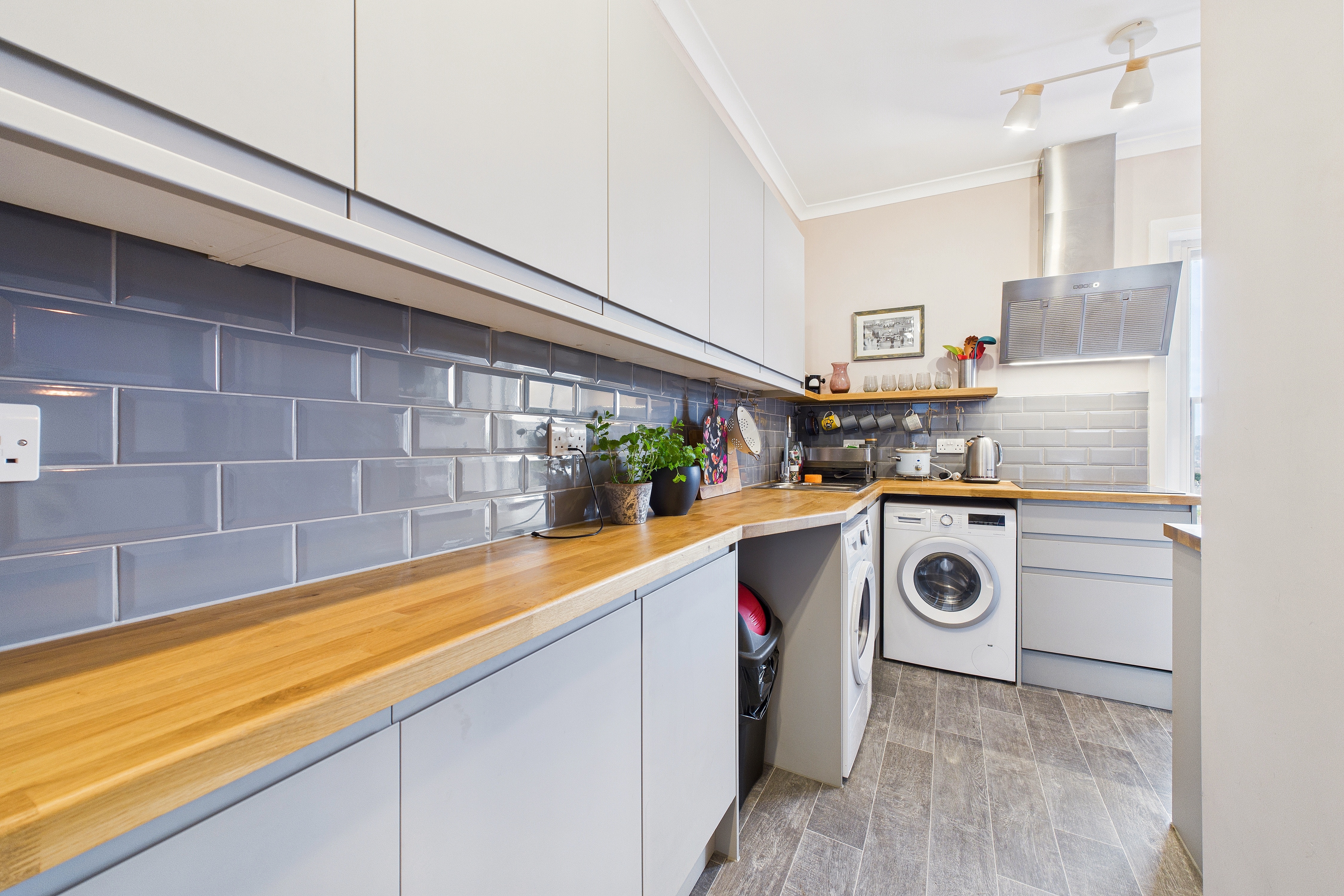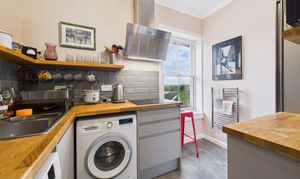The flat itself is on the top floor and is very spacious totalling 72sqm (775sqft) with a communal, wide staircase access from the ground entrance door to the front door of the flat on the third floor. Being on the top floor, there’s no one above you and the views from the flat are beautiful over the town’s rooftops with the sun into the kitchen and living room in the morning and it swings to the rear and into the bedrooms towards the end of the day.