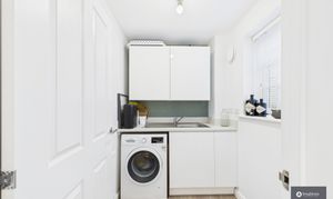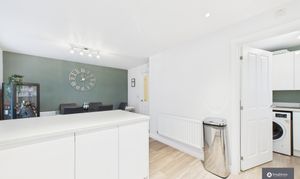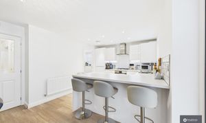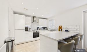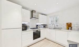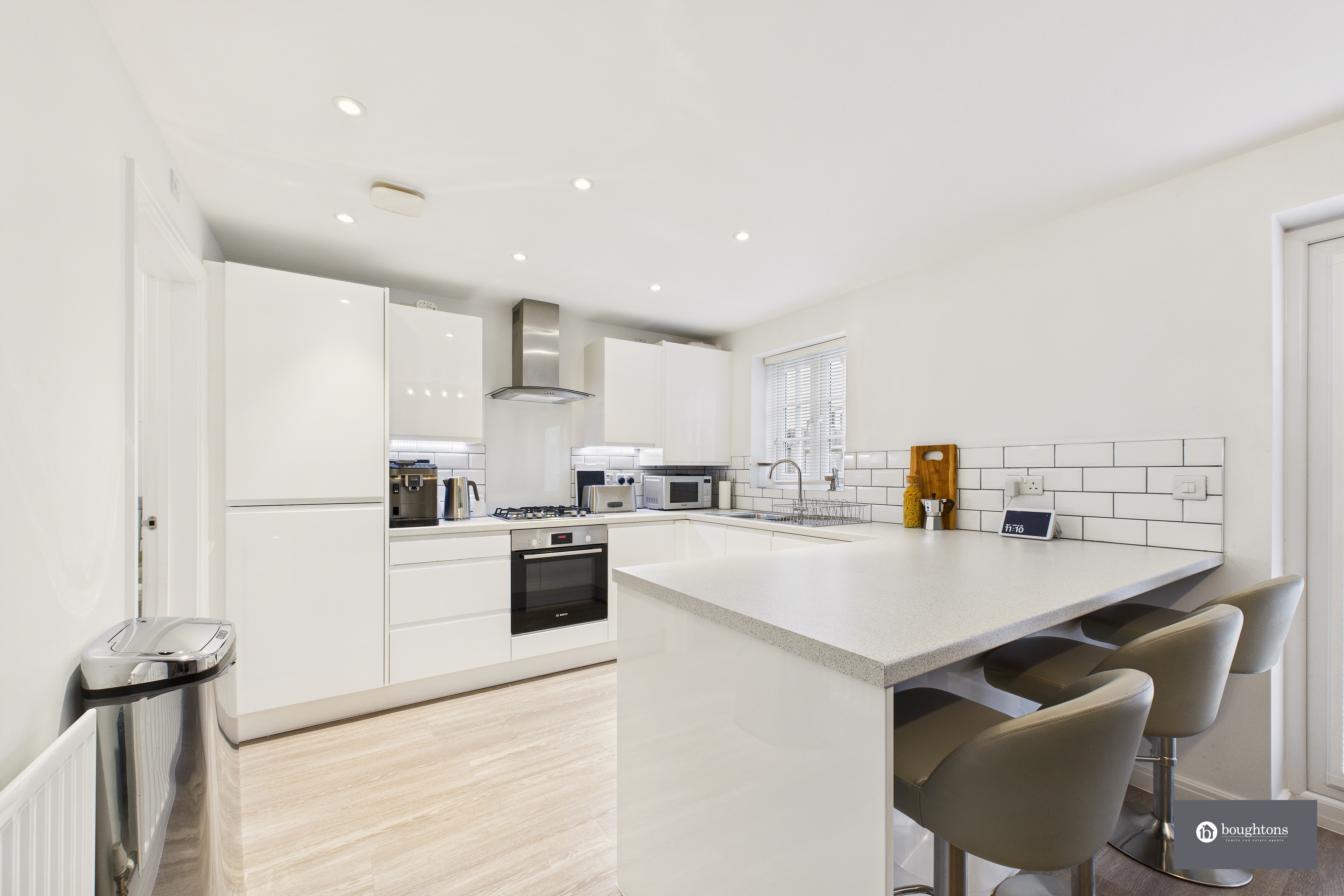 - Sleek white kitchen with integrated appliances & breakfast bar