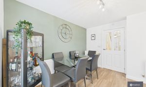 The heart of the home is the sleek white kitchen/dining room, finished with contemporary cabinetry, tiled splashbacks, recessed spotlights, integrated appliances and an extractor fan. A breakfast bar offers additional seating, while there is ample space for a dining table, making it ideal for everyday family life and entertaining. French doors open directly onto the rear garden, seamlessly blending indoor and outdoor living.