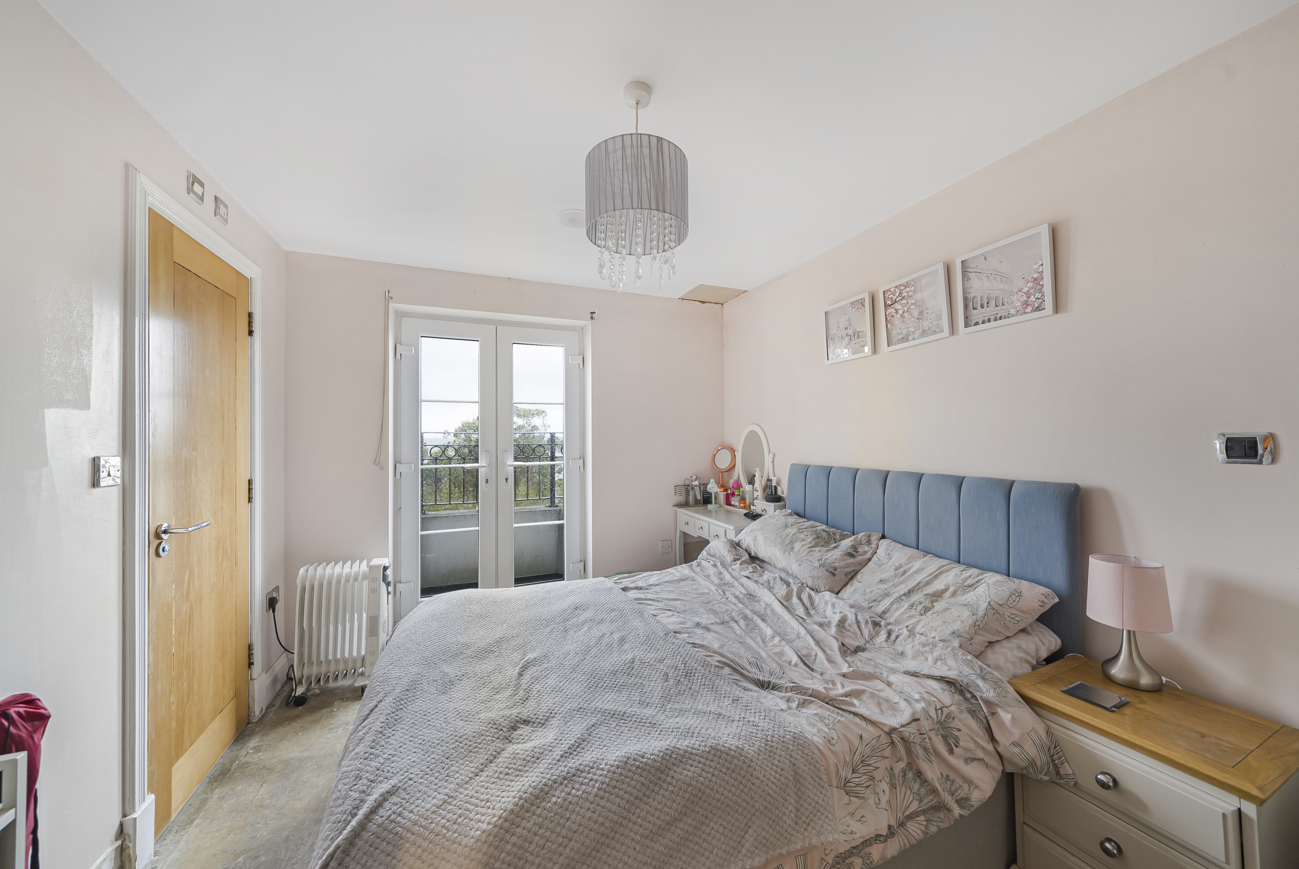 A spacious double bedroom with French doors opening directly onto the sunny south-facing balcony, perfect for enjoying the view.