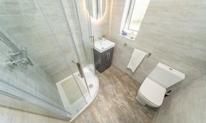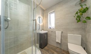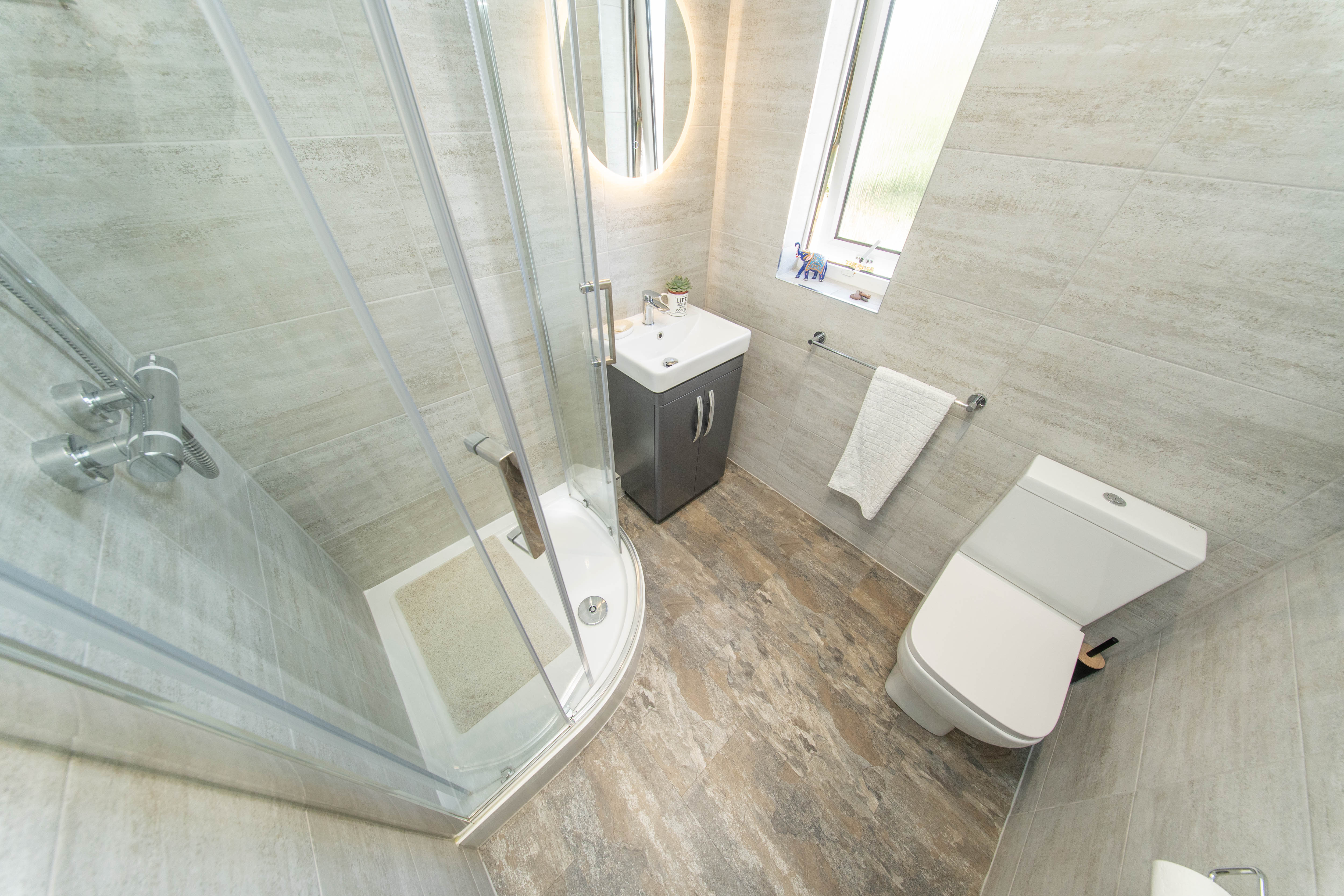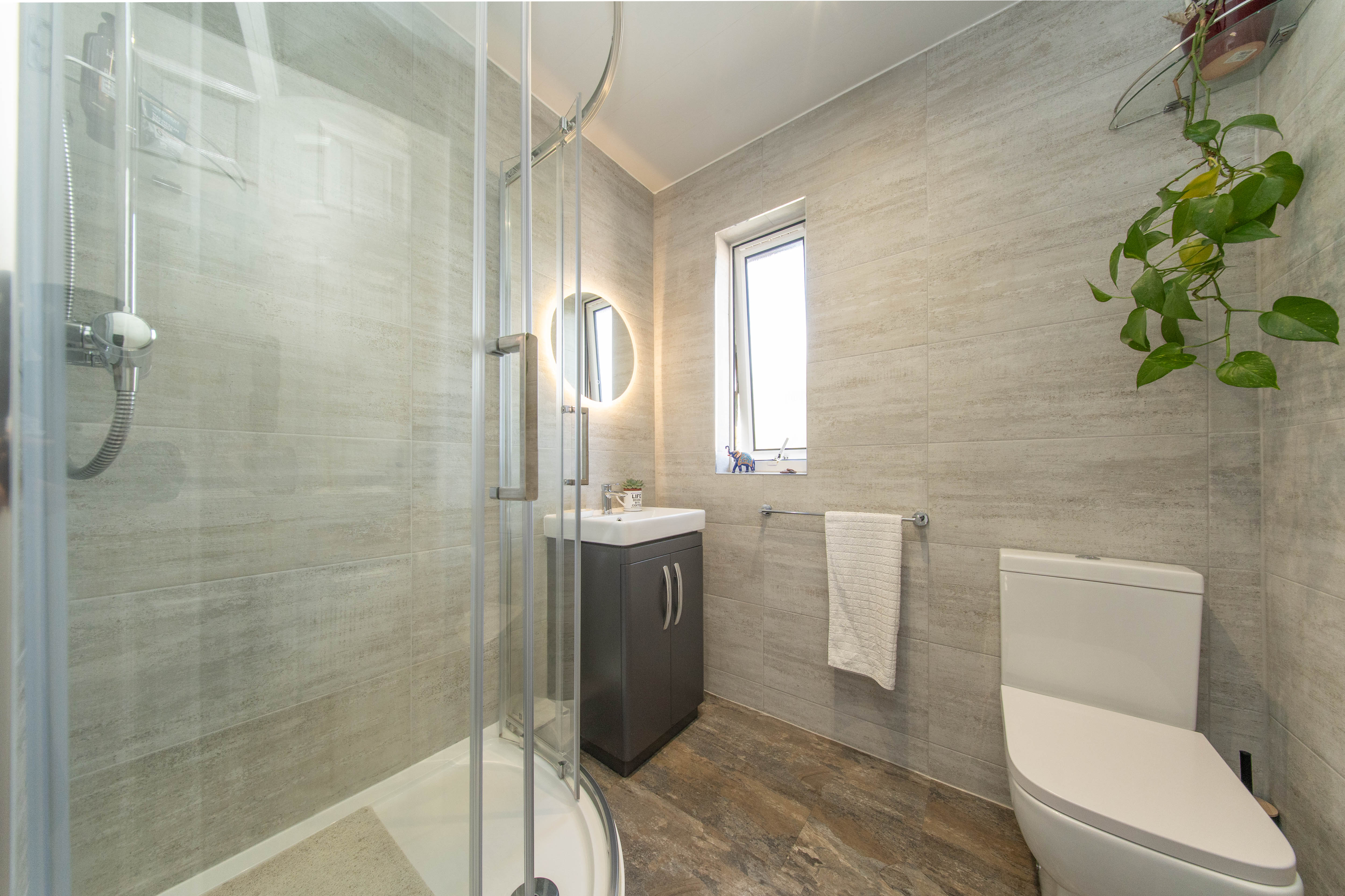 1.861m x 1.722m (06’01” x 05’08”) Recently renovated, this room has a boutique-feel to the décor, with wipe tiling to the walls and laminate tiling to the floor. The white suite comprises of a vanity sink, with storage beneath, a close coupled toilet and a wall mounted shower, with a rainfall shower head plus a handheld shower hose, set in a shower cubicle. A window to the rear brings in natural light and there are recessed ceiling downlights. A wall mounted, heated, back-lit mirror and a chrome ladder radiator completes the room.