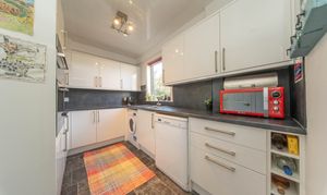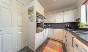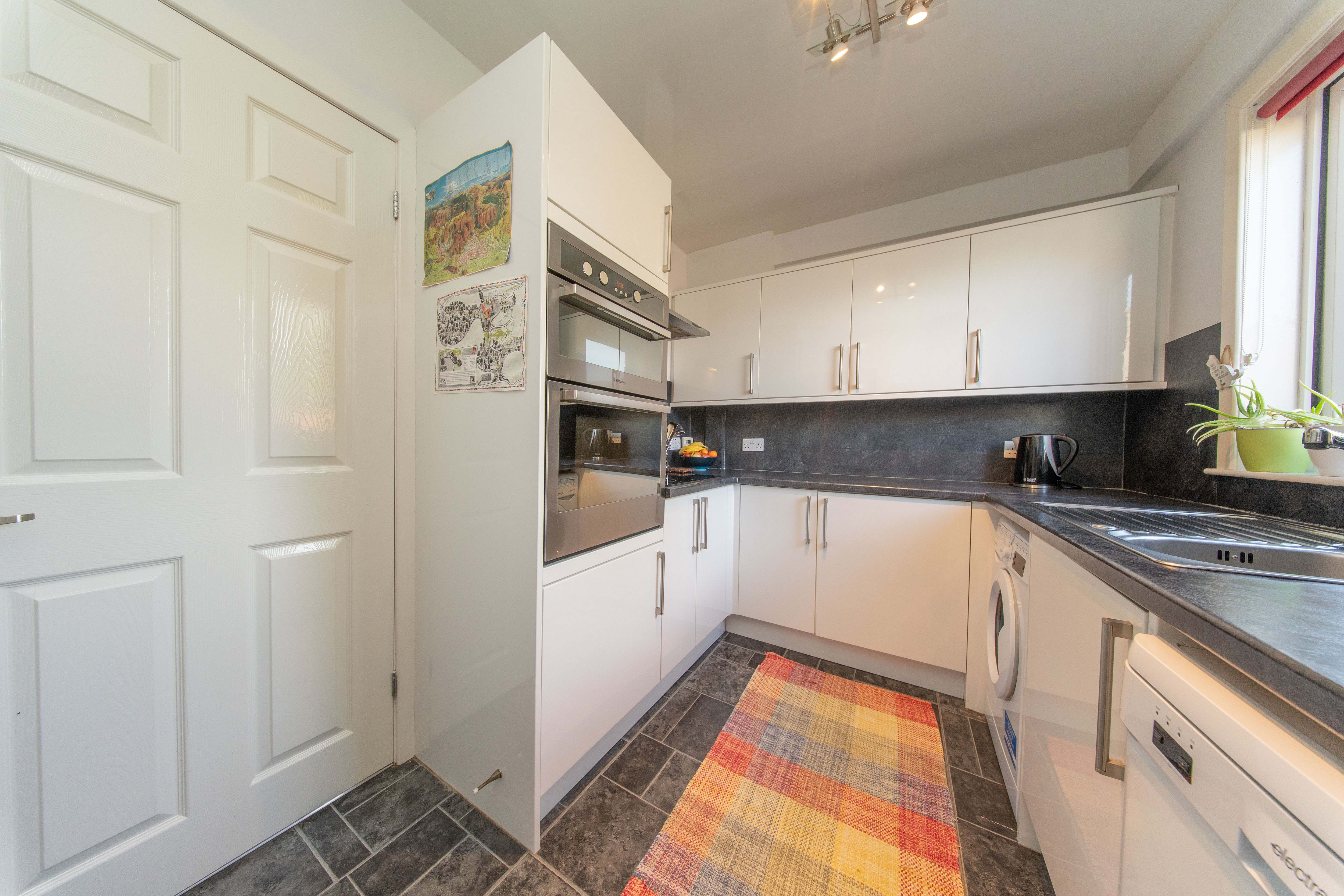 3.226m x 2.283m (10’07” x 07’06”) In keeping with the contemporary décor, this room has lots of modern white fronted units. An integrated 4 ring electric hob, eye level double oven, cooker hood, will all be included in the sale. There is space for a washing machine and dishwasher. The stainless-steel sink with drainer and mixer tap co-ordinate with the dark work surfaces and matching splashbacks. The décor continues with tile effect vinyl to the floor and neutrally finished walls. A window, with views over the fabulous rear garden, brings in natural light and there is ceiling lighting. Power points and a heat detector are provided.