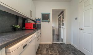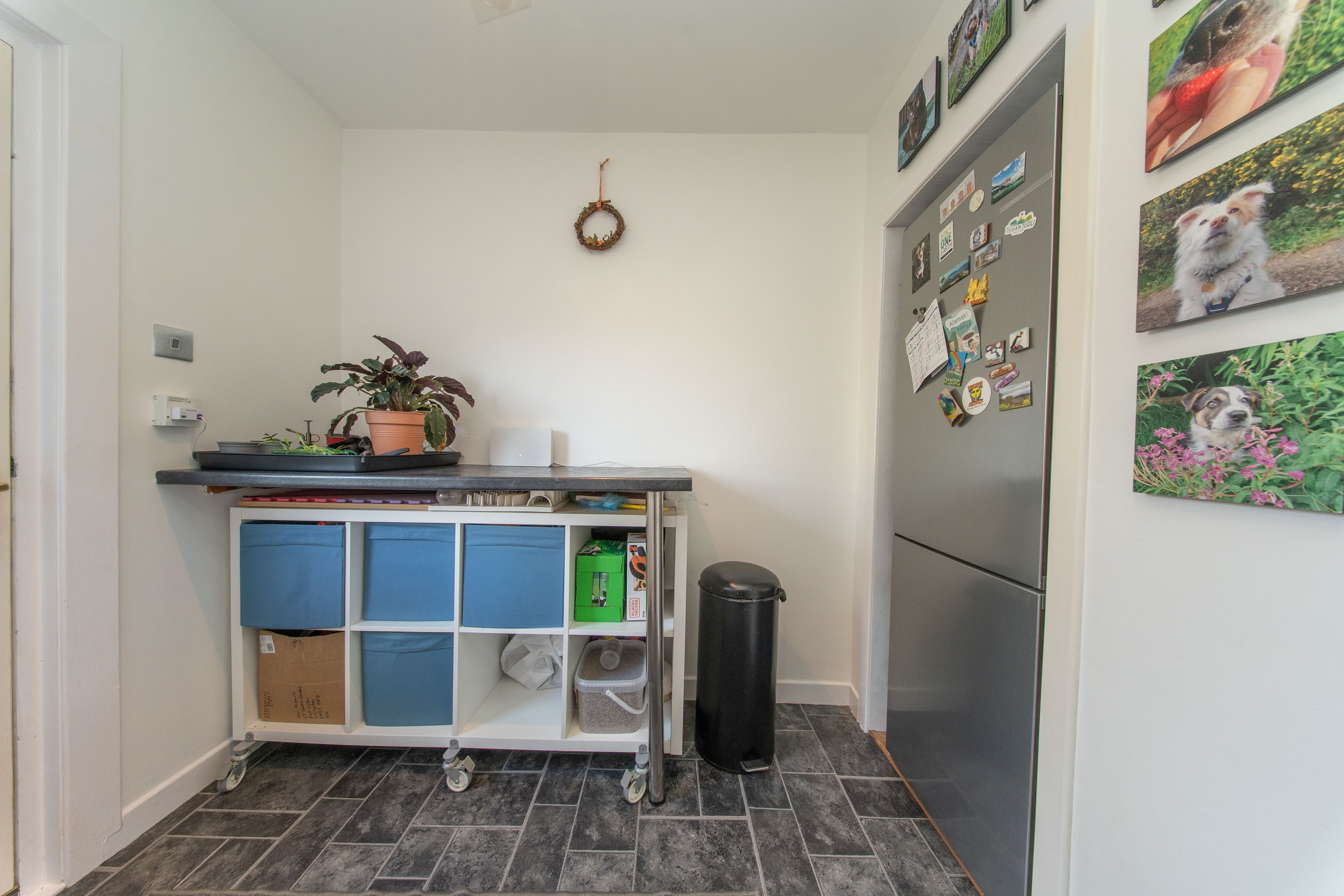 2.259m x 1.698m (07’05” x 05’07”) Continuity is created by the tile effect vinyl flowing seamlessly from the kitchen. This useful area could fulfil various needs. It has been decorated with white painted walls and there is a work surface to match the kitchen. Further storage space is available under the work surface and in the cupboard behind the fridge-freezer, which will not be included in the sale. A half-glazed door leads out to the rear garden. Ceiling lighting and power points are supplied.