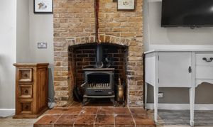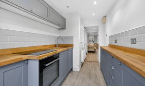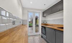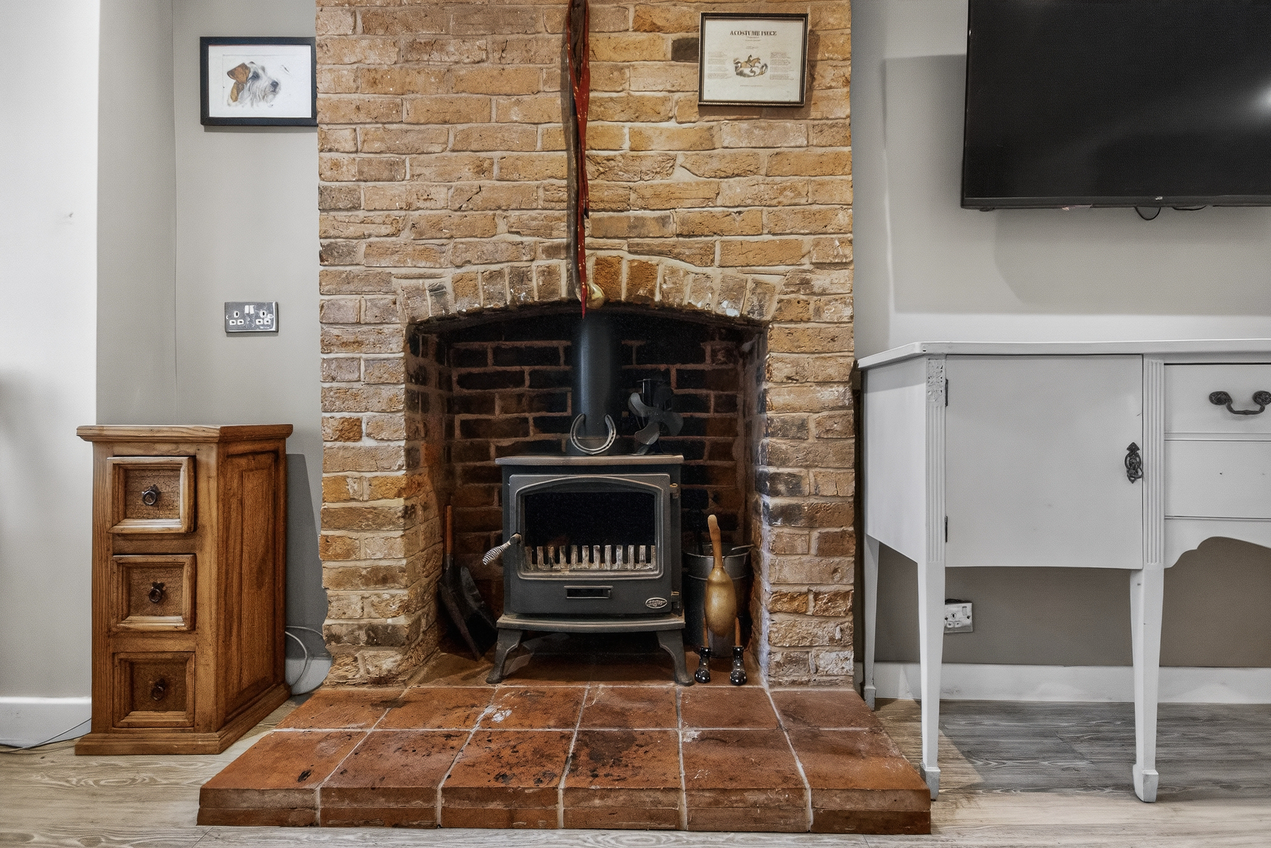 The accommodation is thoughtfully arranged and begins with an inviting lounge/dining room, where a log burner set within an attractive brick-built fireplace creates a warm and welcoming focal point. The adjoining kitchen is both stylish and practical, featuring solid oak work surfaces, integrated appliances including fridge, oven, electric hob and extractor, and French doors opening directly onto the rear garden, allowing for seamless indoor-outdoor living.