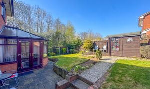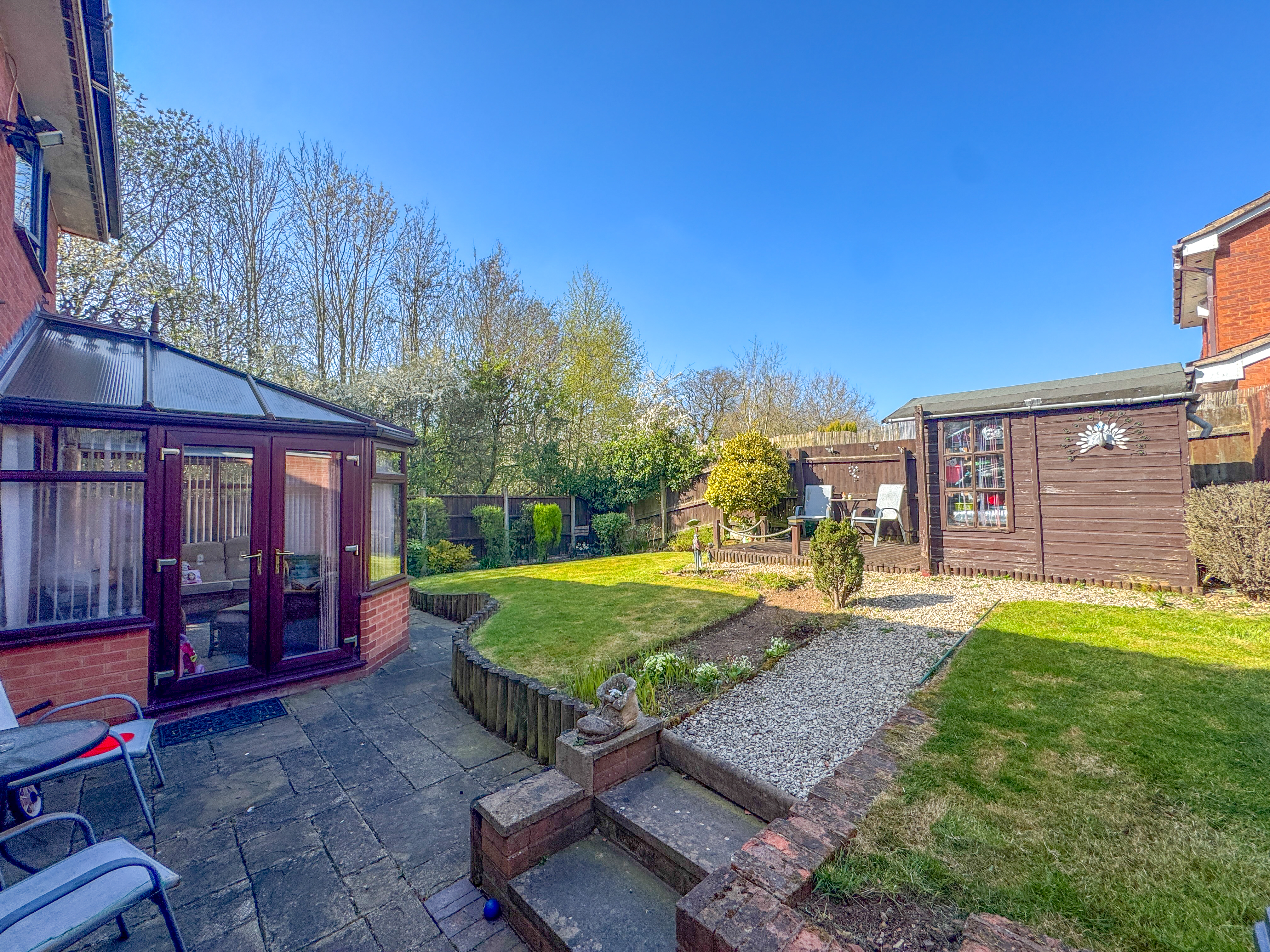 The rear garden has been landscaped for both style and practicality, beginning with a paved patio ideal for seating and outdoor dining. Steps lead up to a well maintained lawn, bordered by a pathway that extends to a raised decking area—perfect for relaxing on summer evenings.