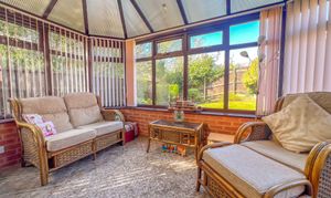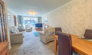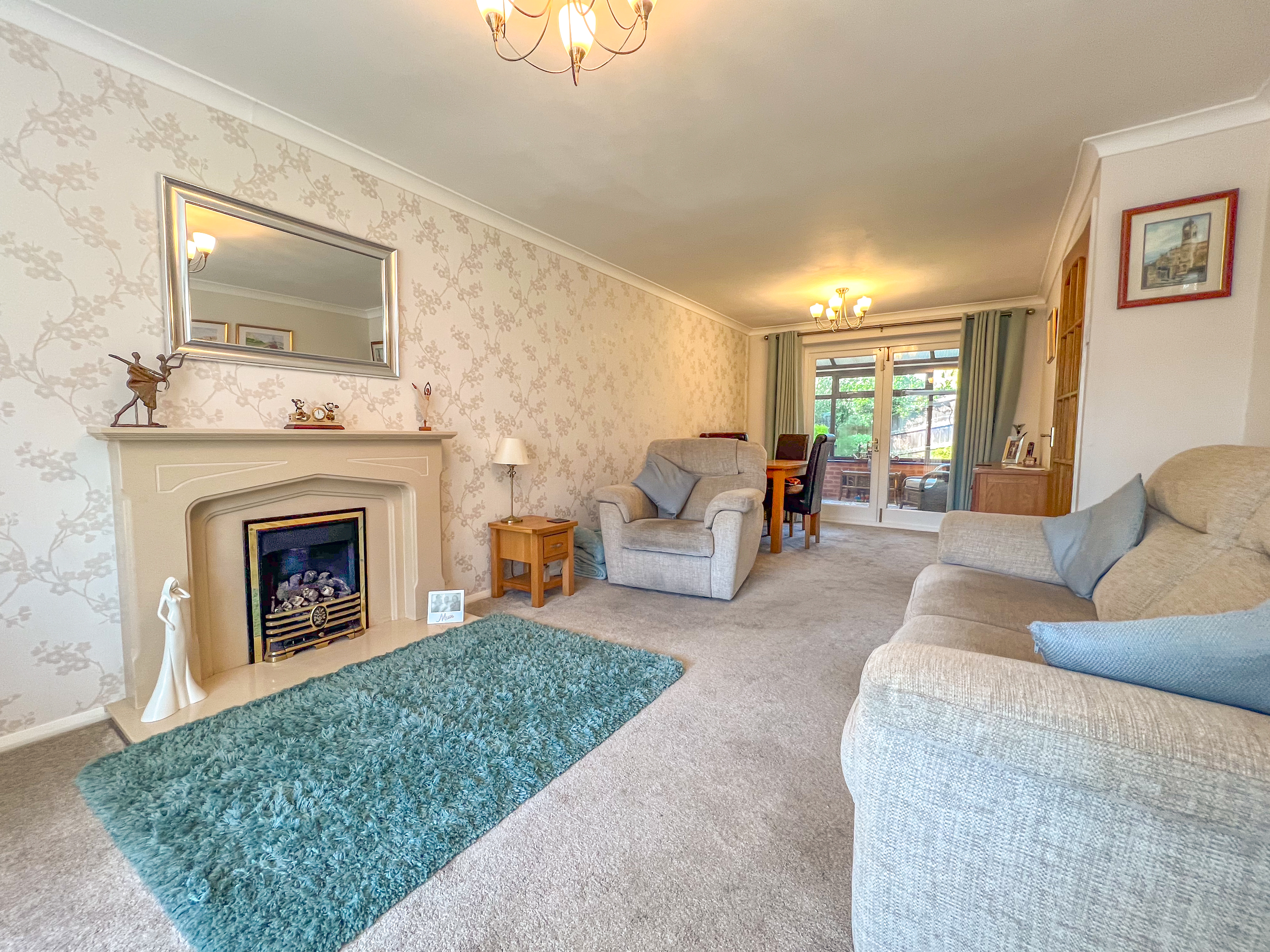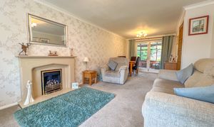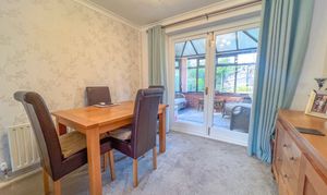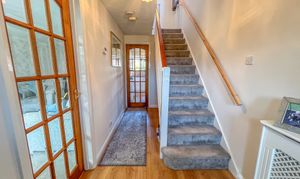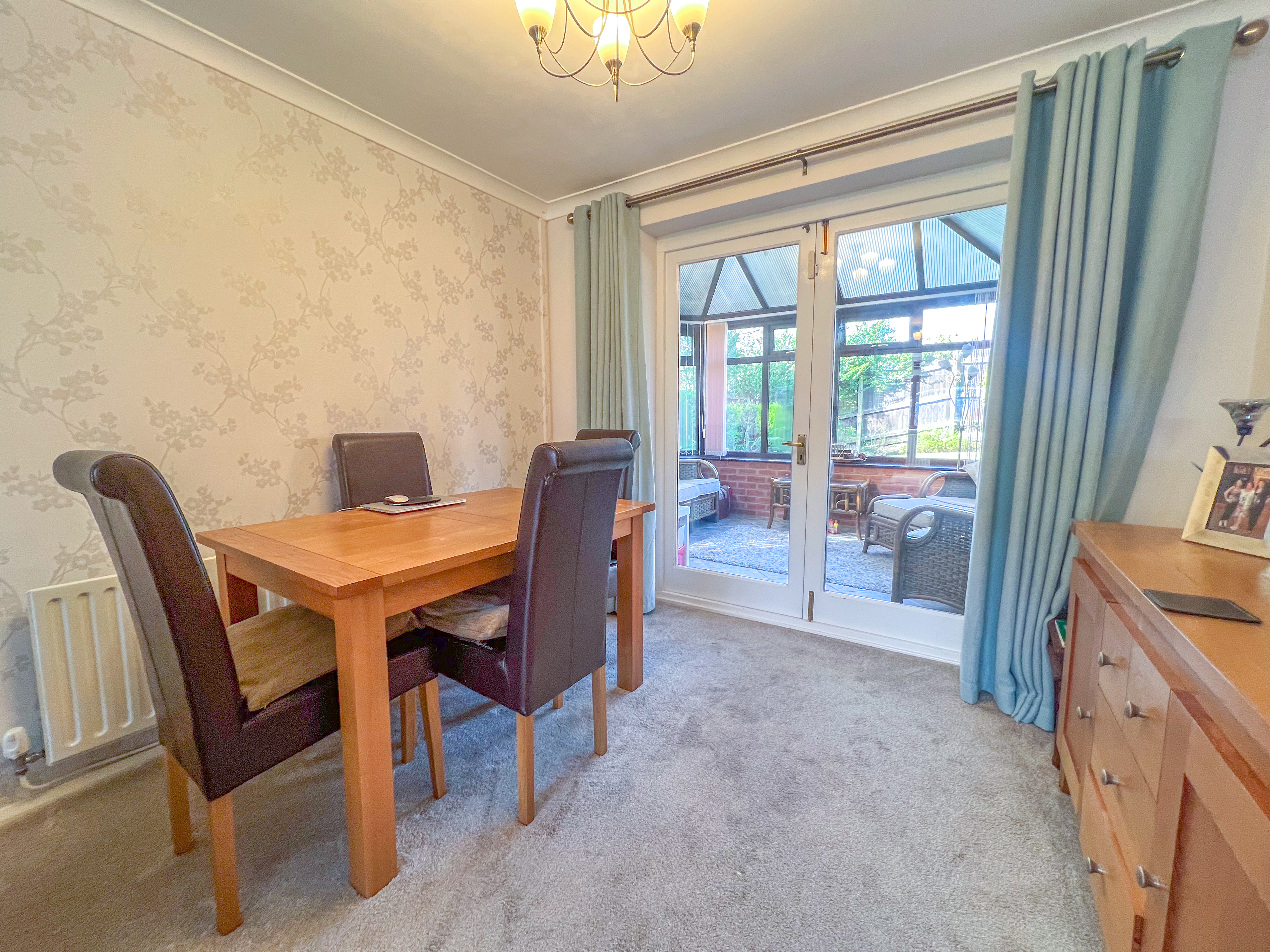 The property is approached via a shared driveway that leads to two designated parking spaces and a neat lawned frontage. Upon entering, you're welcomed into a bright and inviting hallway with stairs rising to the first floor. The main living space combines lounge and dining areas to create a cosy yet sociable setting—ideal for family life or entertaining guests. At the rear of the property, a conservatory provides a peaceful retreat with French doors opening onto the garden, seamlessly connecting indoor and outdoor spaces during the warmer months.