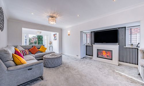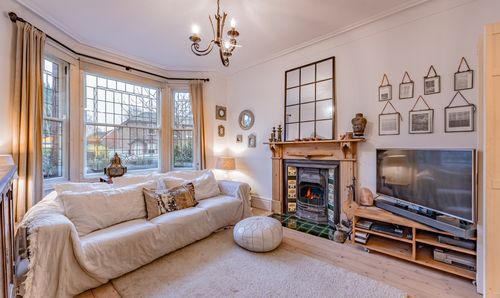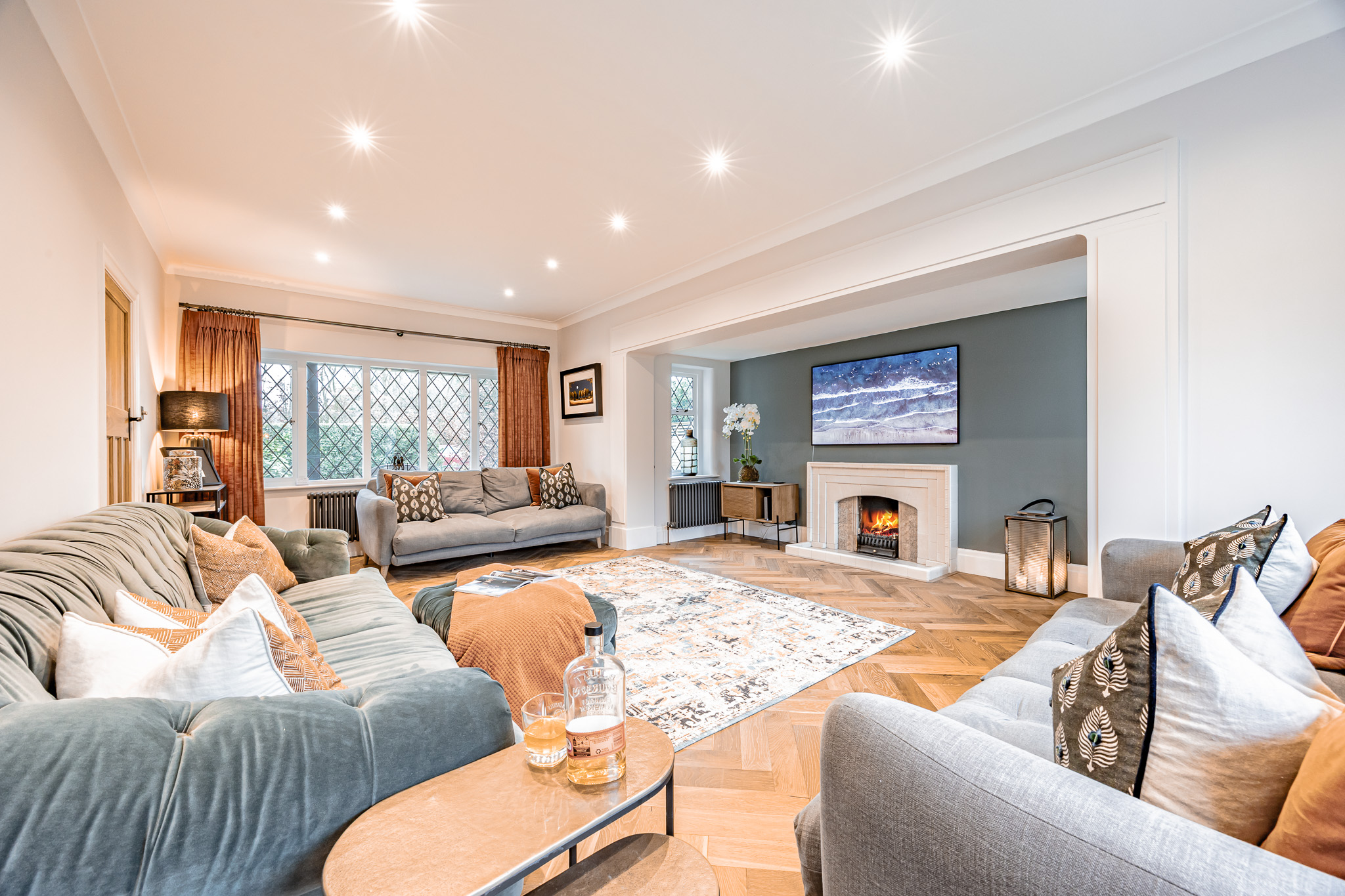 Heading back through the lovely hall, two sumptuous reception rooms follow. The first is a handsome and generously proportioned formal drawing room. The beautiful, solid wood, floor is both warm and stylish, and an original 1920s fireplace adds a focal point. This room runs the length of the original house yet retains a delightful cosiness. Leaded windows at either end, and either side of the vast inglenook keep the space light and bright, while old school radiators add warmth in winter - with no compromise on style. French doors lead out into the garden to the rear. The spacious garden is beautifully secluded and not remotely overlooked. It’s south facing, ensuring light for most of the day, and is perfect for a large family. The neighbouring Pownall Hall school fields add to the feeling of a rural idyll, without being too far out of the way.