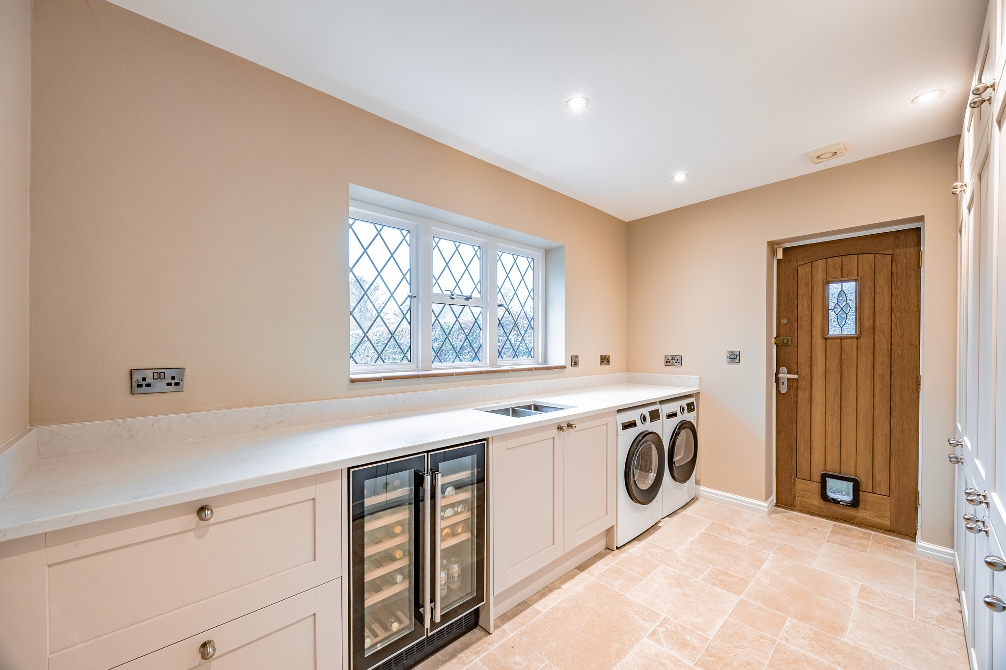 With a similarly high-quality finish, a discreet and perfectly formed utility room, accessed via a sliding door, provides oodles of extra storage and keeps the workhorse appliances out of sight. There is a further handy downstairs loo, and, for yet more storage, a useful cubby, and a spacious garage with void space above.