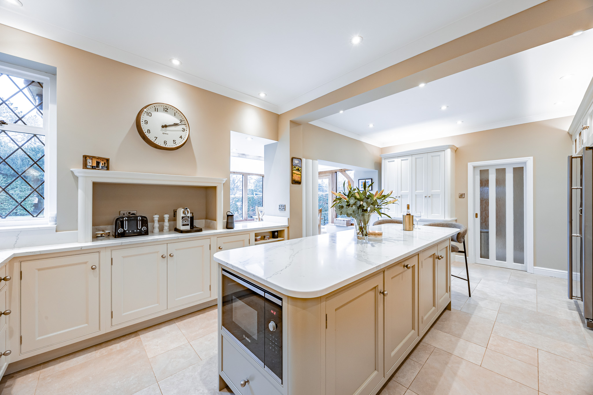 - Stunning bespoke Shaker kitchen with quartz worktops, island, and range cooker
