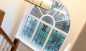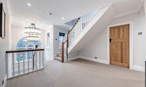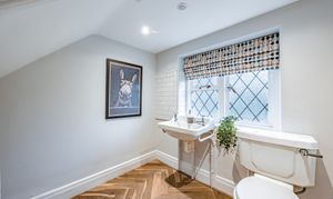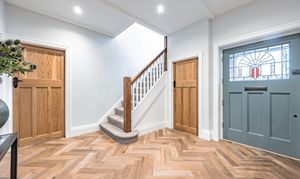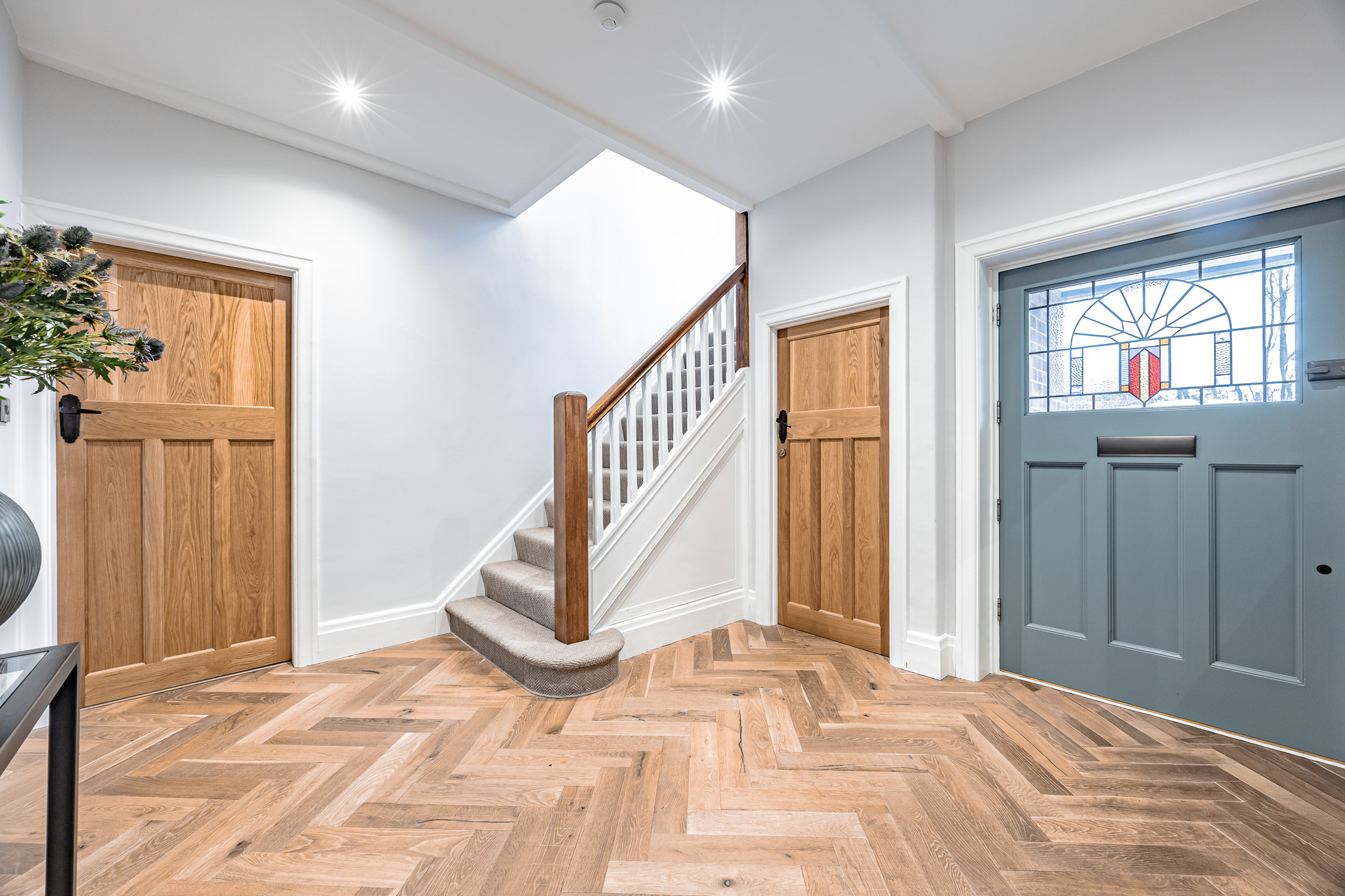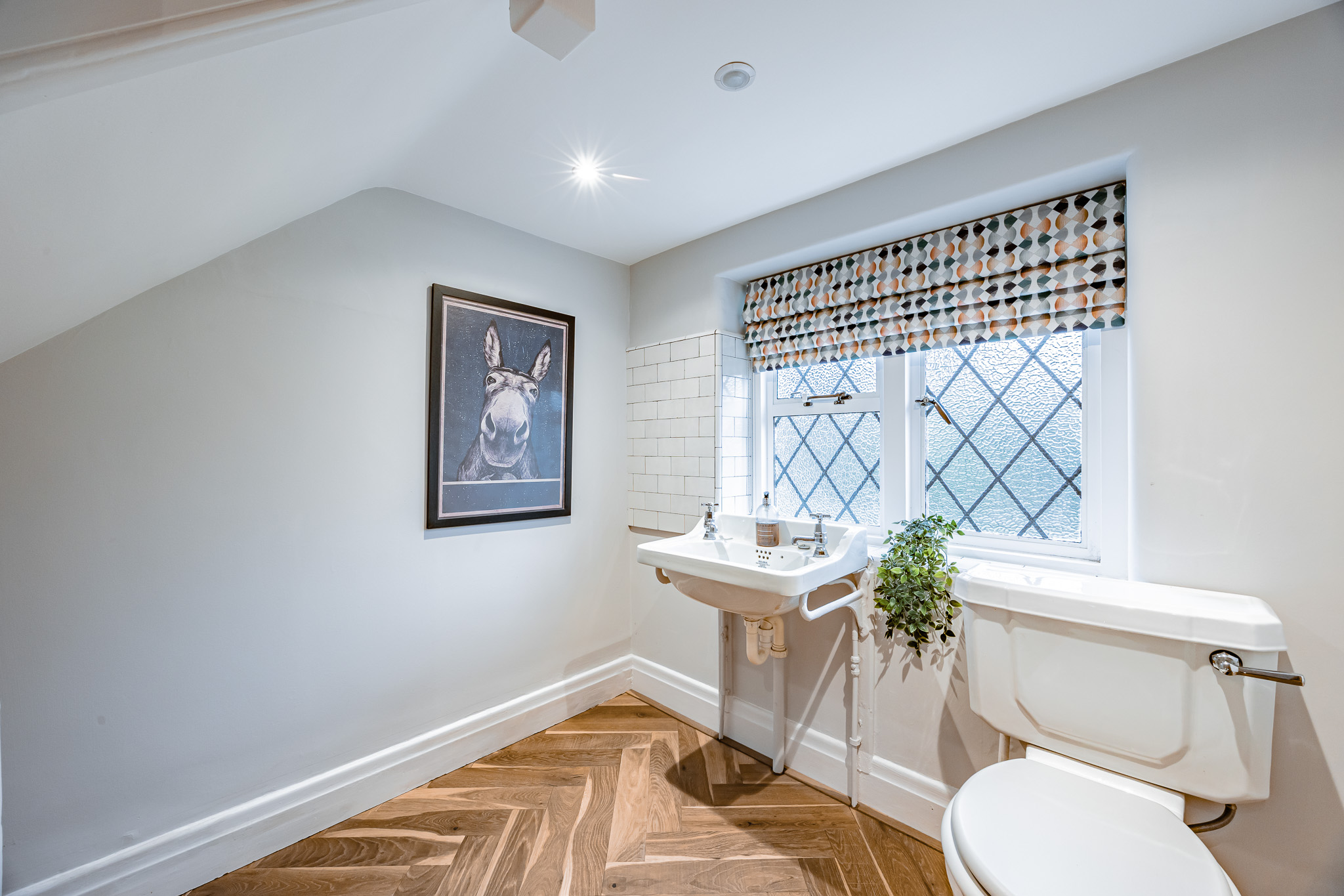 The imposing hardwood front door – custom-made to match the original stained glass – opens into a bright, airy, and welcoming entrance hall. The décor throughout focuses on natural yet warm and calming tones. The next owners can choose to put their own stamp on the house with their art and furnishings, with no need to rush into decisions on design schemes and colourways. The hall, with its attractive and robust herringbone-laid wooden floor, leads invitingly to the rooms beyond, and upwards, including a handy downstairs WC and cloakroom, furnished with art deco porcelain-ware and tiles.