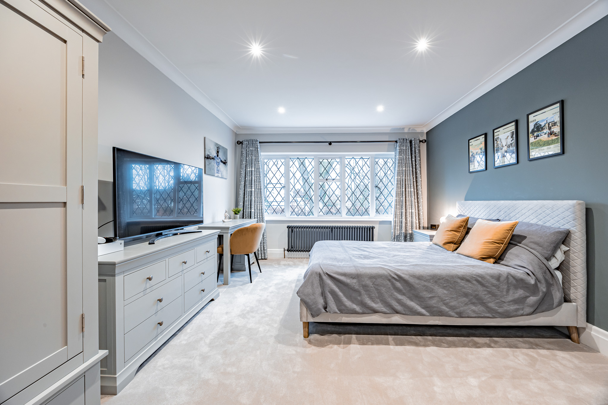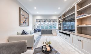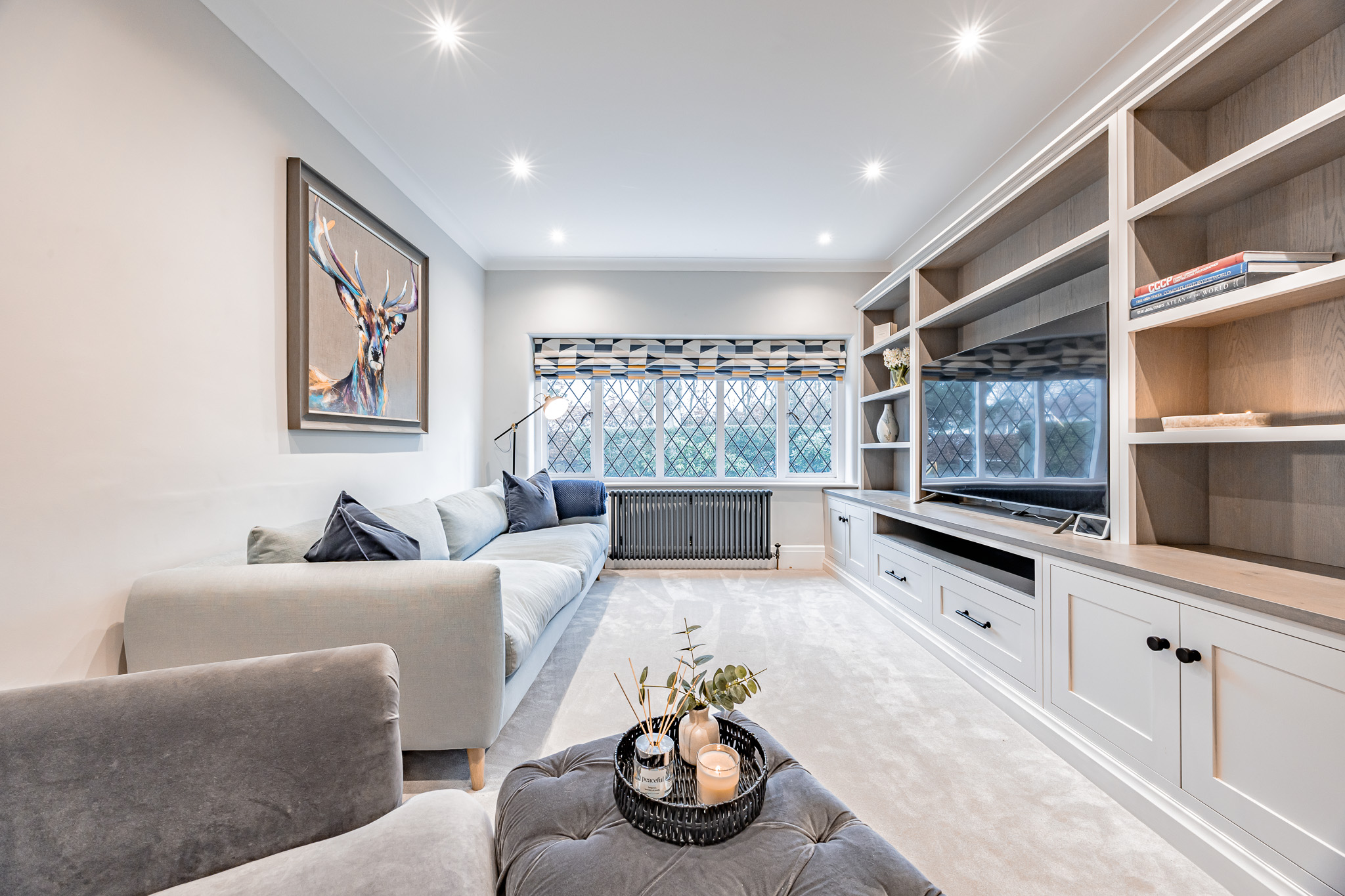 Across the hall, another reception room is plushly carpeted and boasts a craftsman made-to-measure entertainment unit, in a wooden shaker style echoing the kitchen. This looks stunning and also houses a sizeable television and all its connected games and peripherals. This room is tremendously versatile; it could easily double as a study or office space.