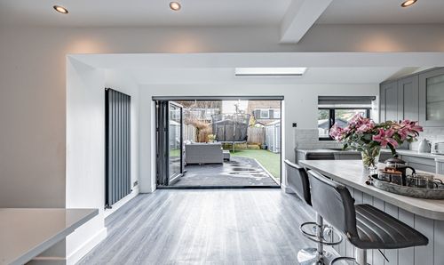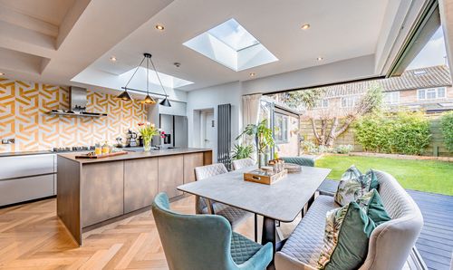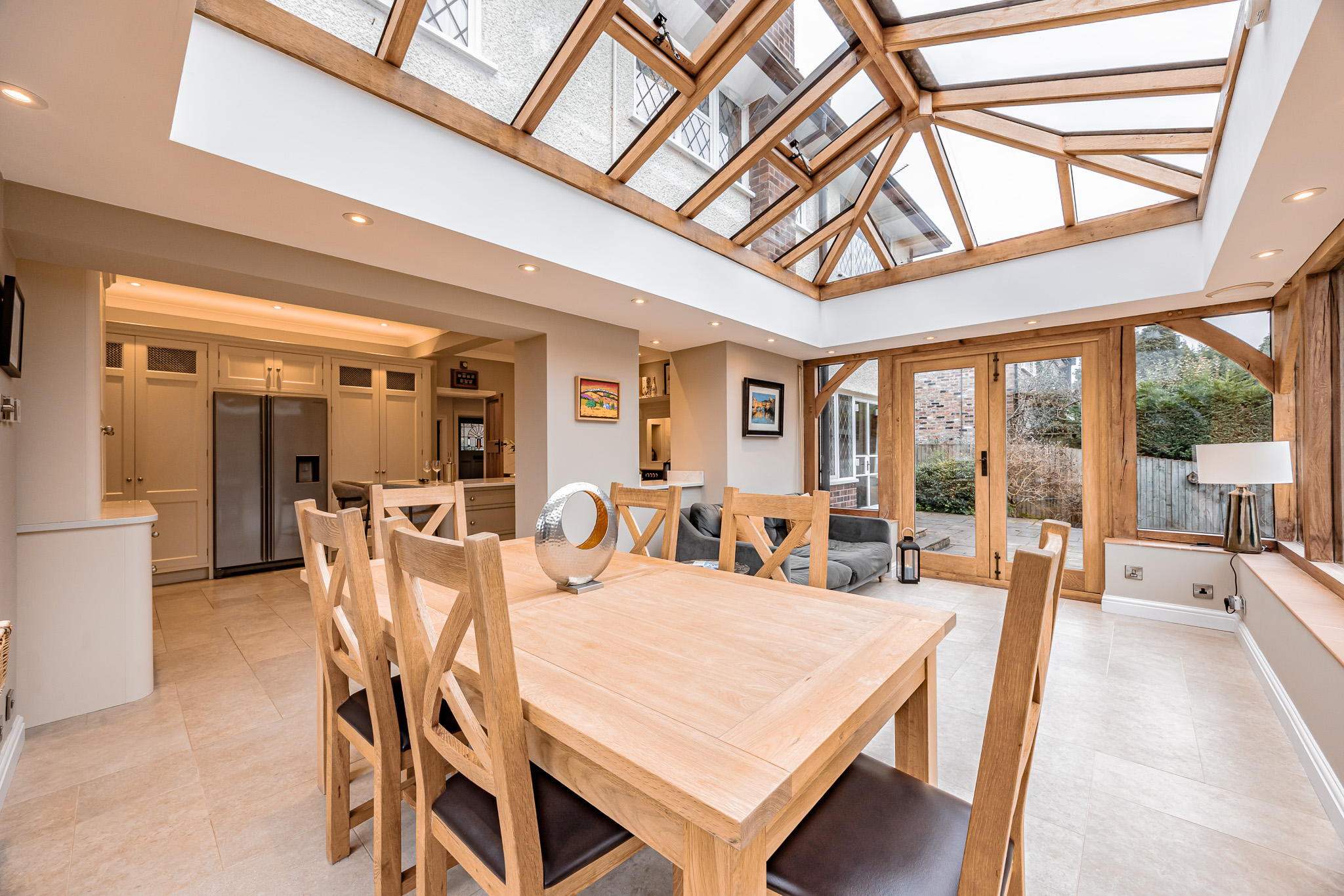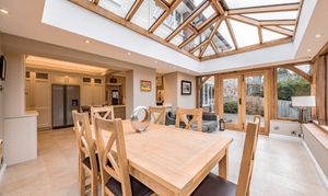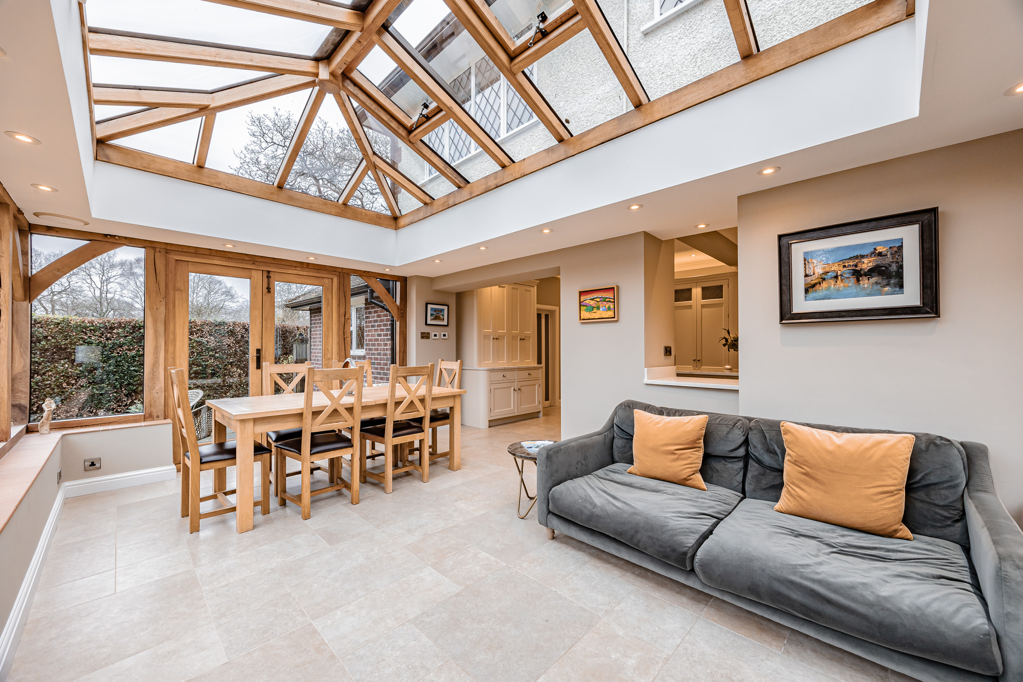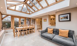 - Oak-framed orangery with underfloor heating opening onto the garden