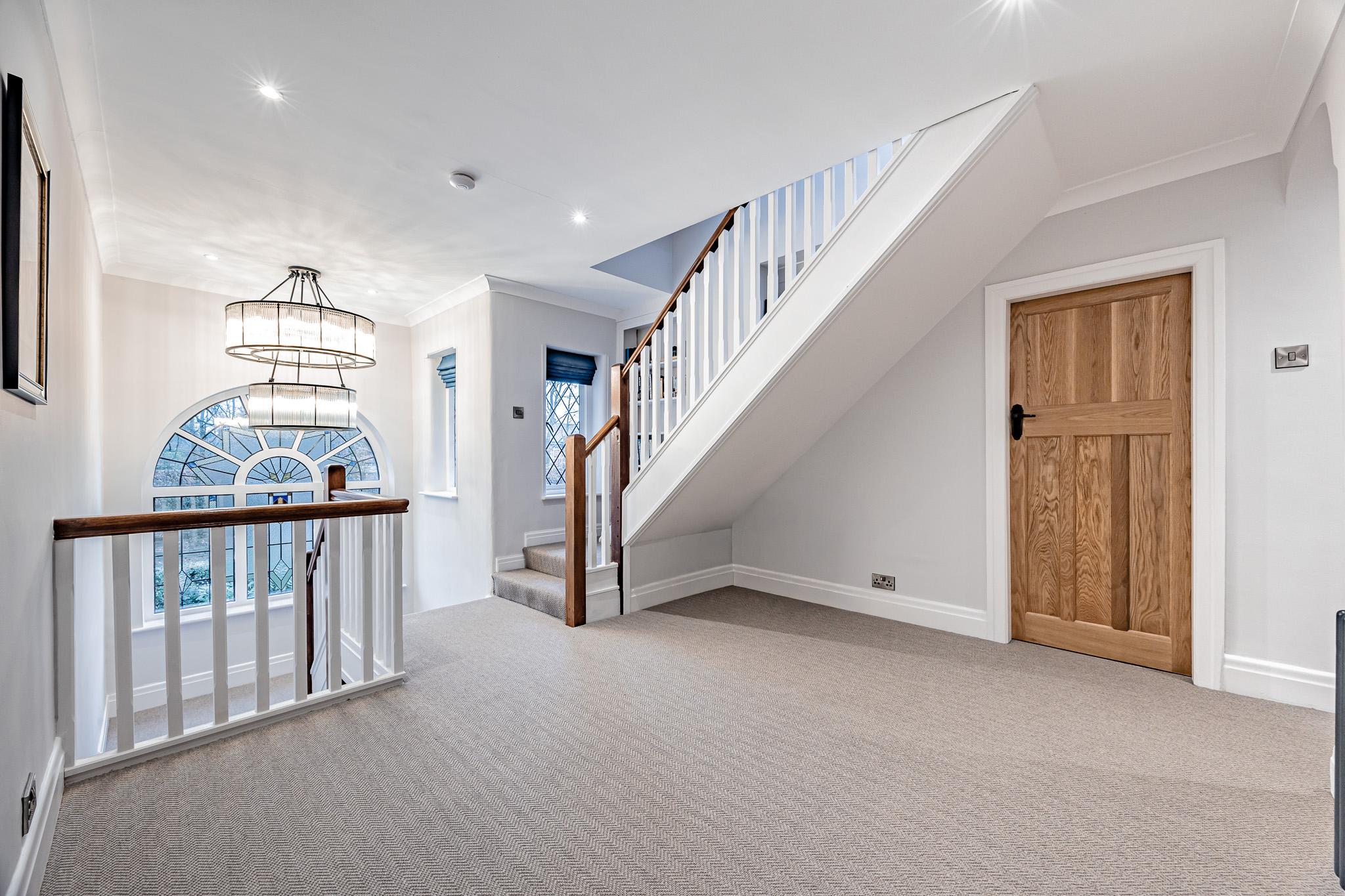 That same sumptuous carpet continues onto the stairs heading from the hall to the first floor and throughout the bedrooms. Original arts and crafts spindles and banisters echo the attention to detail seen throughout this beautiful and impressive house.