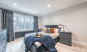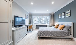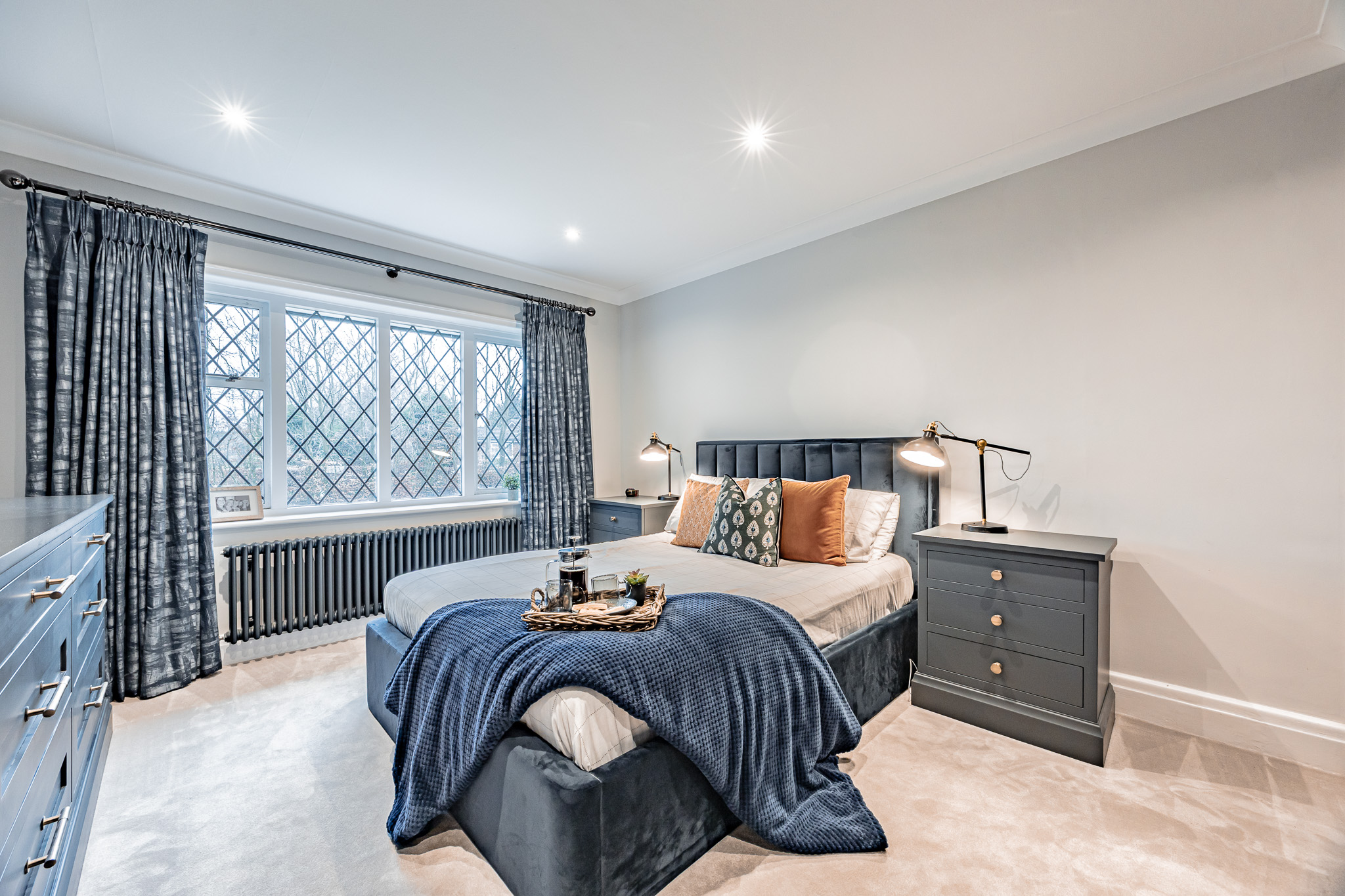 A reassuringly sturdy, traditional staircase with original spindles winds up from the hallway. The first floor accommodates four of the five bedrooms. Firstly, we find a generously proportioned king-sized double, with plenty of space to add an en-suite. Deep carpet cushions every step, and the window looks out over the tree-lined and pleasant front. The peace and quiet here is tangible. A second spacious double boasts attractive fitted furniture and enjoys views over the secluded rear garden.