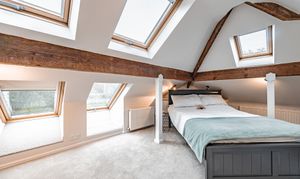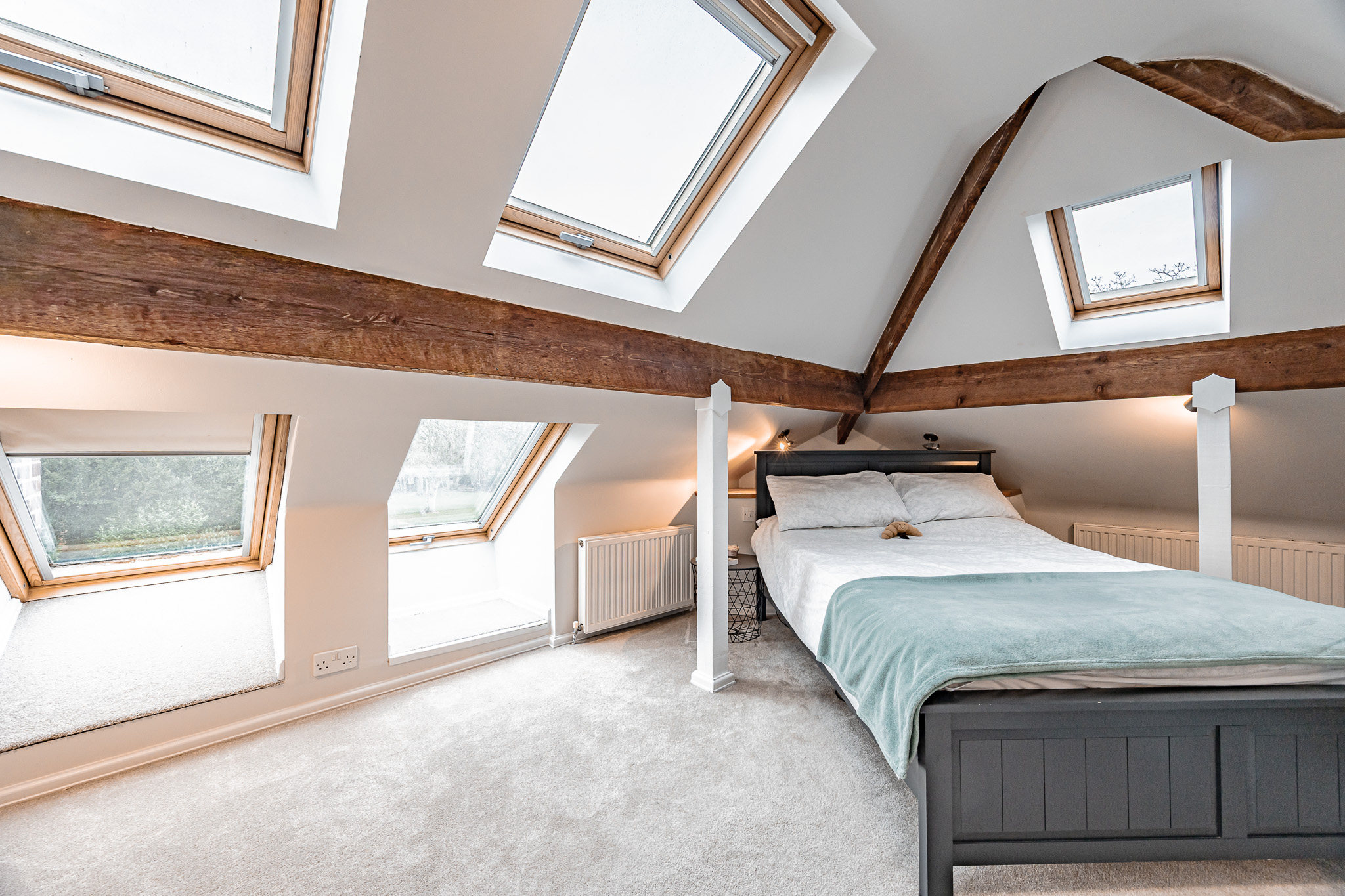 A further staircase heads from the landing, into which is built an attractive bookshelf. Every inch of this house works – but always seamlessly and beautifully. The second floor is home to a perfectly proportioned suite which any teenager or student would simply adore. With – again – exceptional storage space, there is a double bedroom, study space, and en-suite. The room spreads easily into the eaves and exposed beams give a country feel. This floor would also be a wonderful studio – the light is wonderful, invited in via Velux windows.