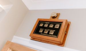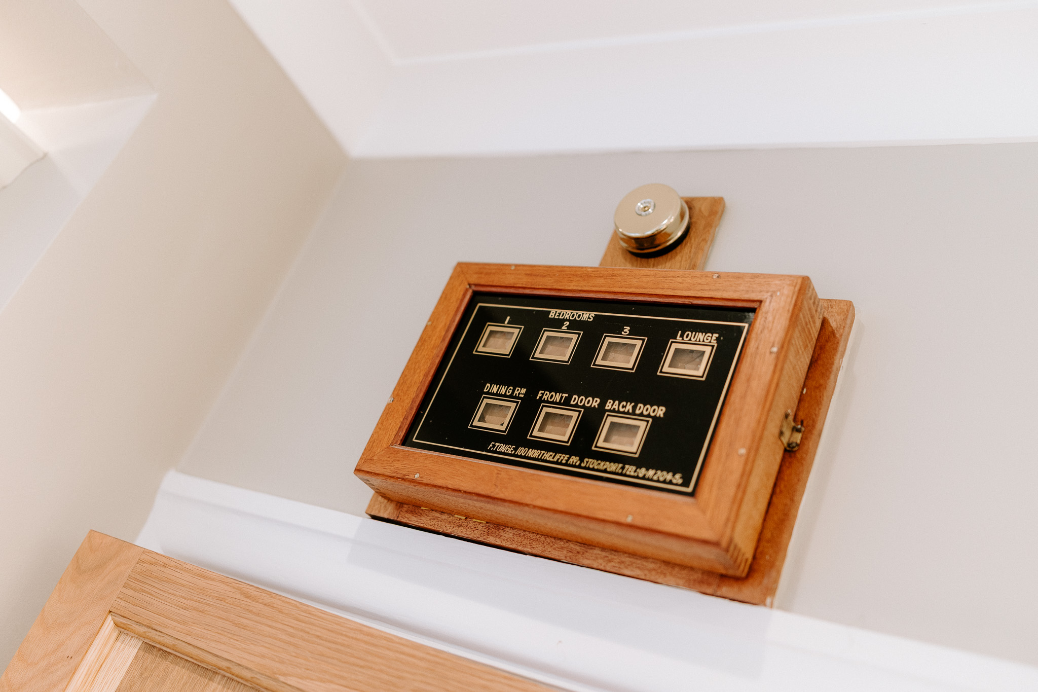 Downstairs is flooded with natural light and full of warmth. Leading straight from the hall is the kitchen, and what a kitchen. Solid wood framed Shaker units, custom-made by Jamie Robins Bespoke Interiors of Pott Shrigley, Cheshire, and only recently hand-painted, are complimented by stylish and robust quartz work surface and splash backs. The same continues across the vast island unit, made to maximise storage – and, cleverly, housing a discreet integrated microwave. A mantel frames the impressive Stoves range cooker which combines traditional looks with the cook’s favourite induction hob. The attention to detail here shines from every handle, every trim, and every finish. Original features have been embraced and highlighted, including a charming print of the initial house plan, and even the servants’ bell indicator box.