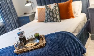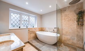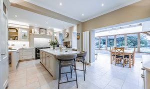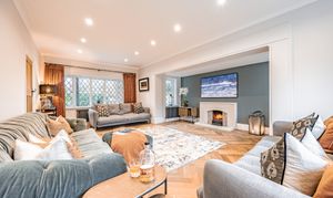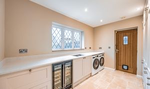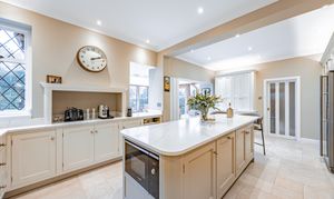 Sleek and high-end built-in appliances offer convenience without detracting from the exquisite kitchen. The kitchen benefits from capacious storage, all with the same artisanal finish, including a stunning larder - or bar - unit as well as cleverly backlit tall cupboards. A Quooker boiling water tap minimises countertop clutter. The tiled floor boasts the welcome warmth of underfloor heating, which, with convenient zoning, continues into an incredible and substantial oak-framed orangery. This space, and the showstopping kitchen, are ideal social spaces. Perfect for parties and entertaining year-round this space opens into the large garden, so summer gatherings can spill outside, too. The orangery is also the perfect place for the family to gather with ample room for the most generous of squishy sofas. This is a space seemingly made for movie nights.
