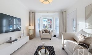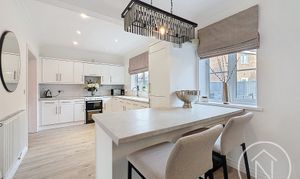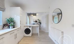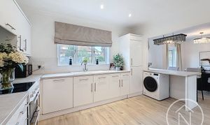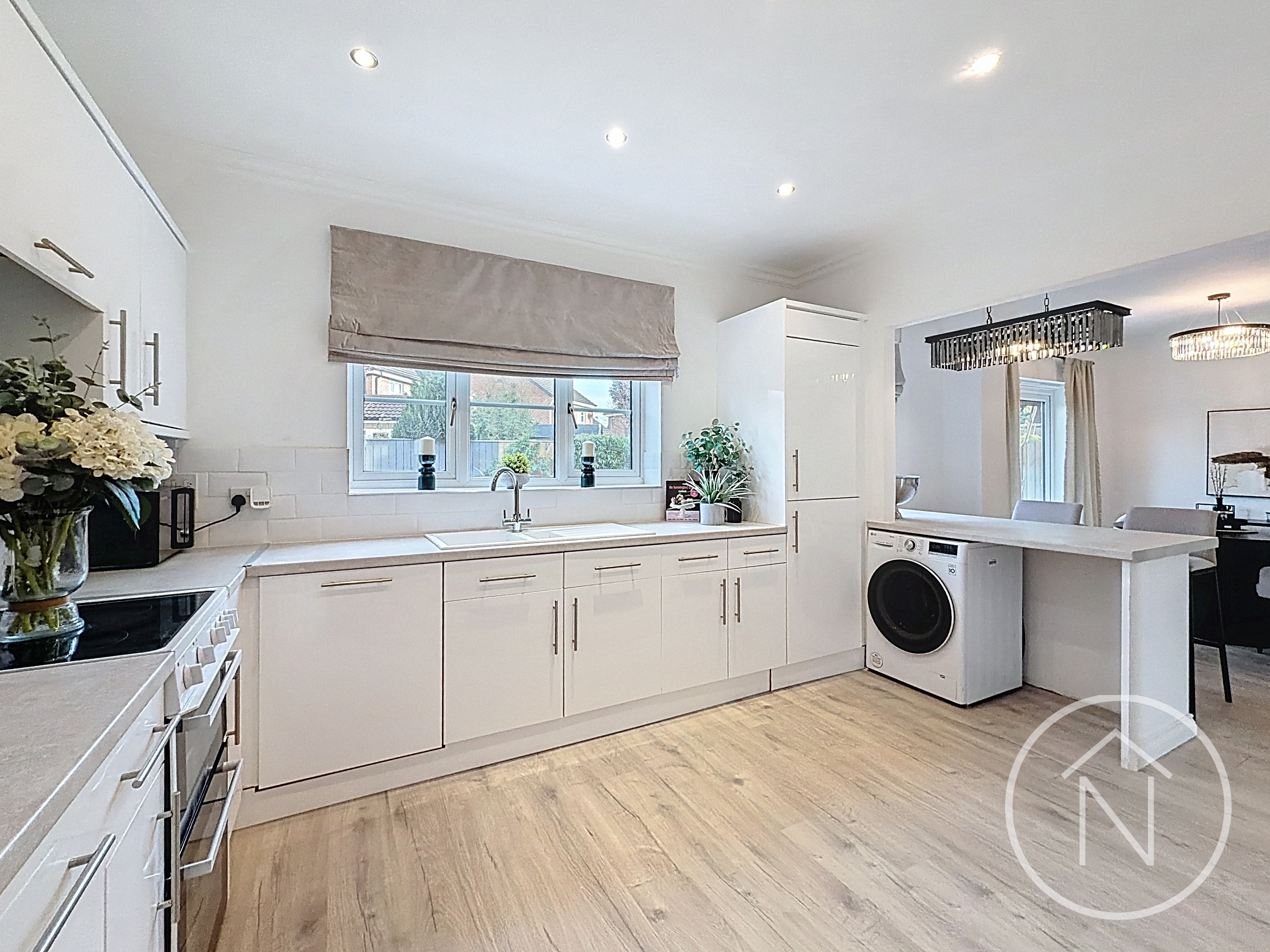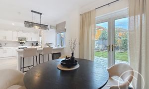 This exceptional four-bedroom, three-bathroom detached house offers an impressive blend of contemporary style and functional family living. Upon entering, a spacious hallway with light laminate flooring and a modern staircase provides a welcoming introduction, flowing seamlessly into the lounge filled with natural light. The property features two generous reception rooms, each with neutral décor, creating bright, inviting spaces ideal for both relaxation and entertaining. The heart of the home is a striking open plan kitchen and dining area, equipped with sleek white units, a stylish breakfast bar, and a central island. Expansive windows and French doors flood the space with light and lead directly onto a patio and into the rear garden, perfect for indoor-outdoor living.