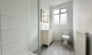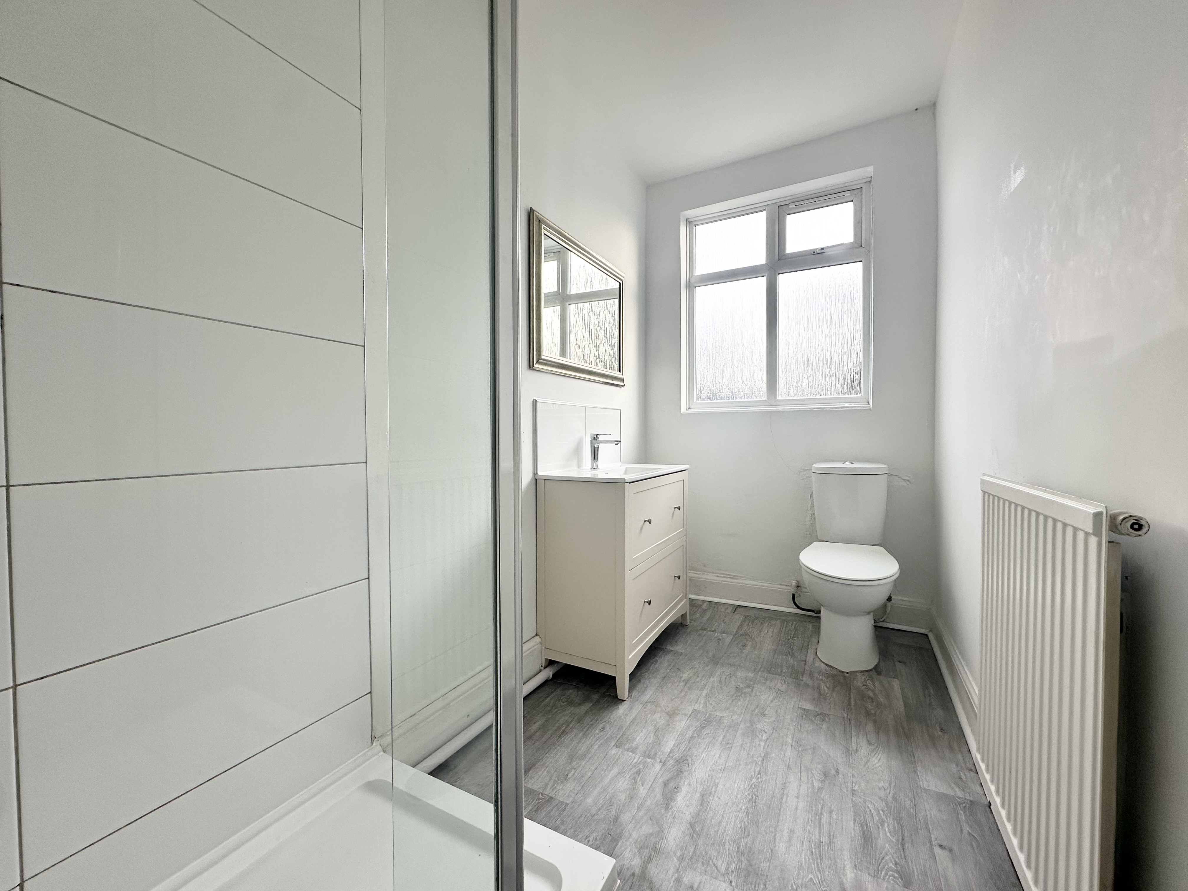 Double enclosed shower cubicle, wash basin with storage, WC, radiator, obscured glassed window, laminate flooring.