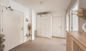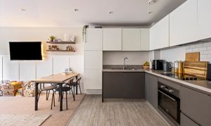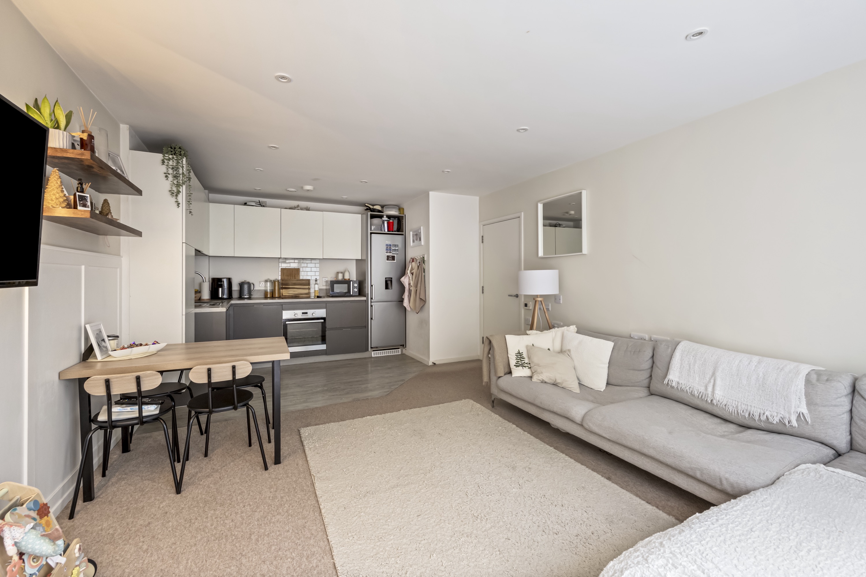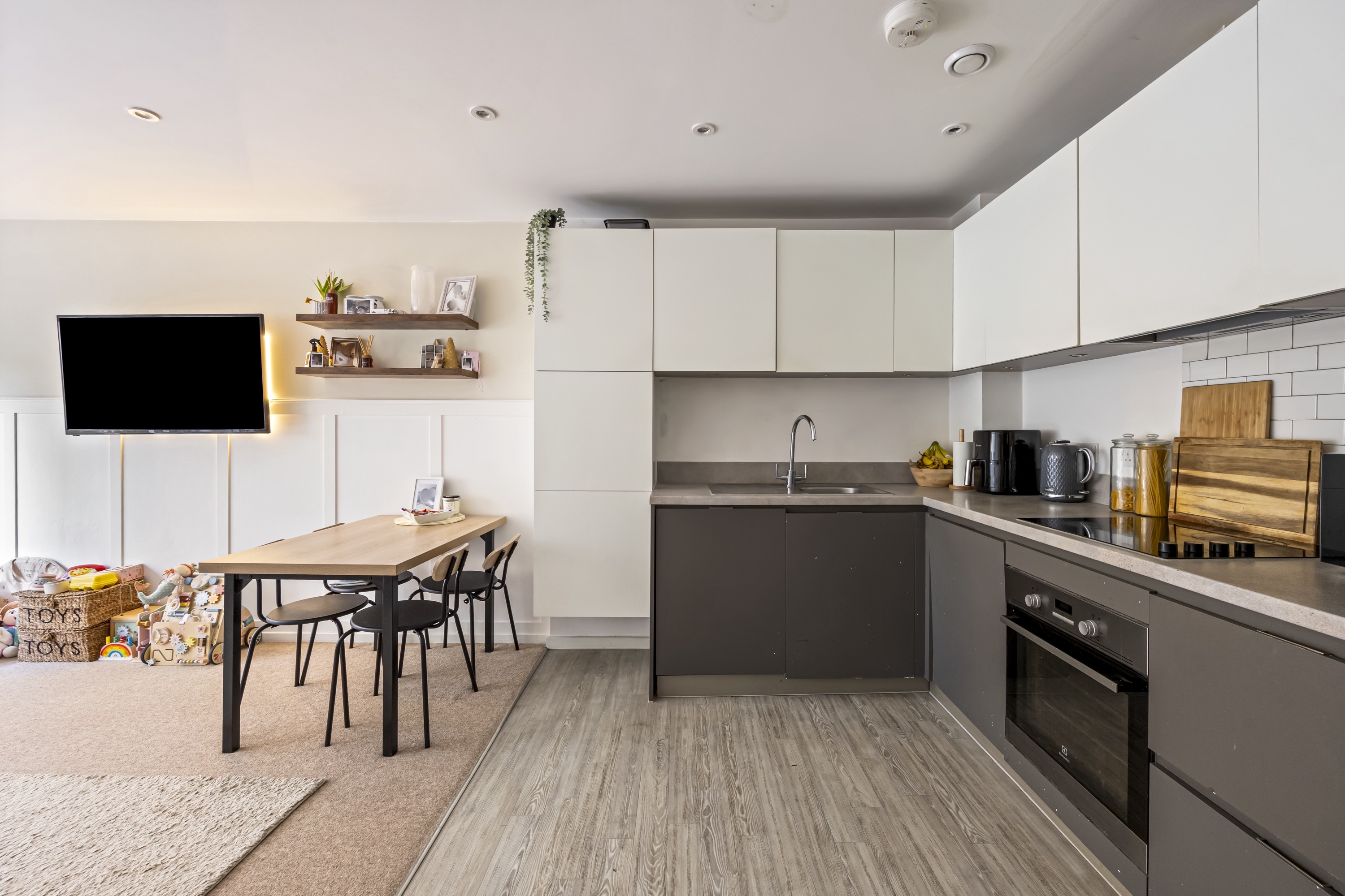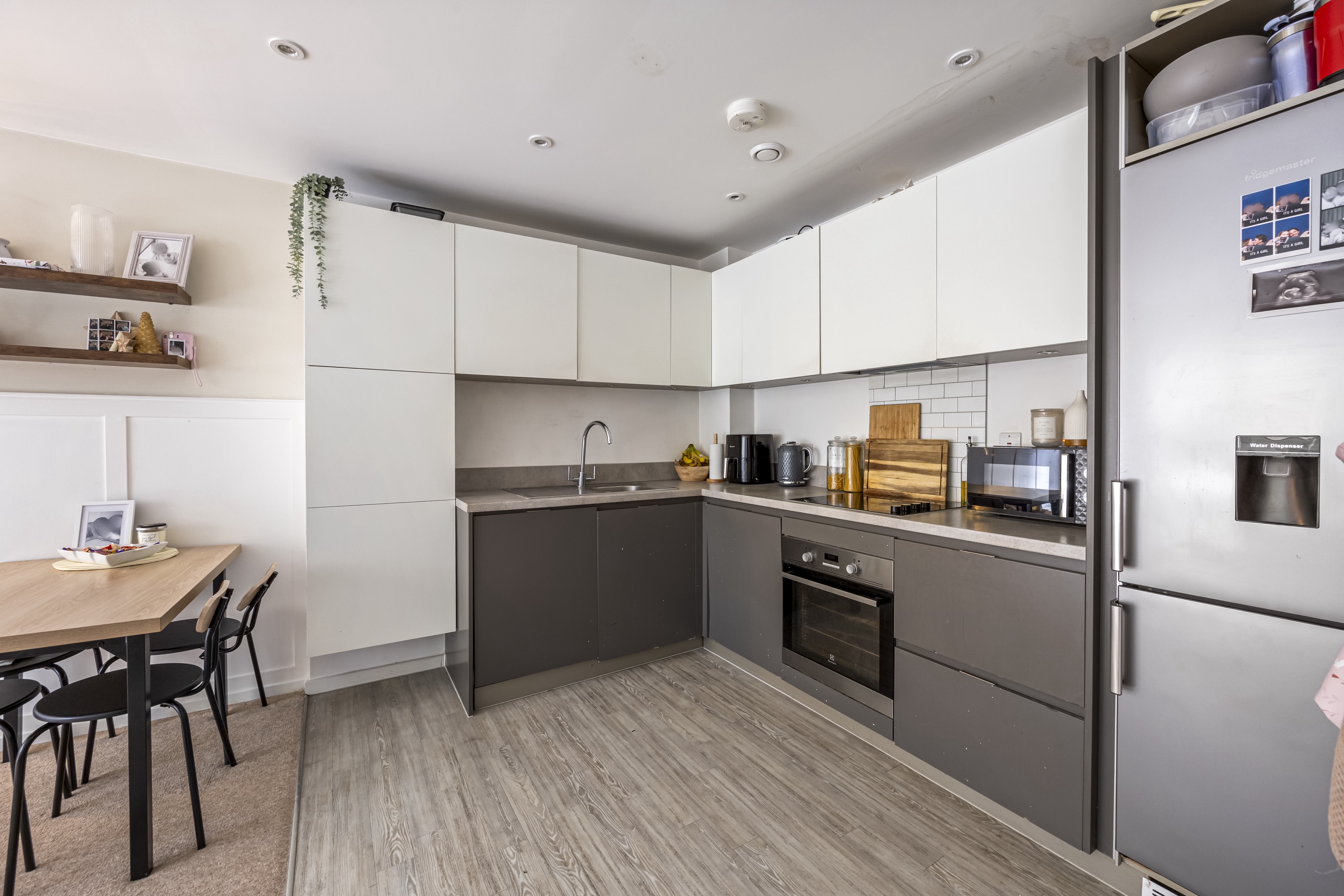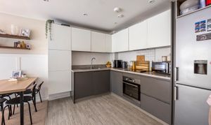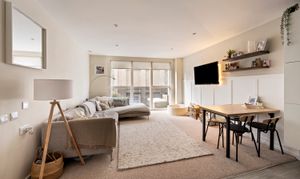Upon entry, residents are greeted by the spacious hallway providing access to all rooms as well as a handy storage cupboard for shoes and coats. Heading right, the open-plan kitchen / living area expands into a bright and sociable space with near full width / height windows allowing natural light to flow through - the South-facing balcony follows with space for a table and chairs. The kitchen itself is incredibly well-equipped with a variety of wall and base units, plenty of countertop surface and a range of integrated appliances.