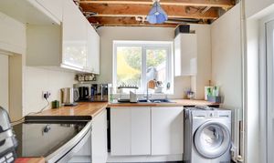 The kitchen is a good size with dual-aspect natural light from a window and door. It is fitted with a range of base and wall units, laminate worktops, and tiled flooring, with space for essential appliances such as an oven, washing machine, and fridge/freezer. This room could easily be redesigned or opened up into a contemporary open-plan layout.