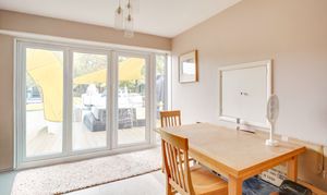 The open-plan lounge/dining room is spacious and inviting, with dual-aspect windows and French doors opening onto the garden. Neutral décor creates a versatile living space suitable for both relaxing and entertaining.