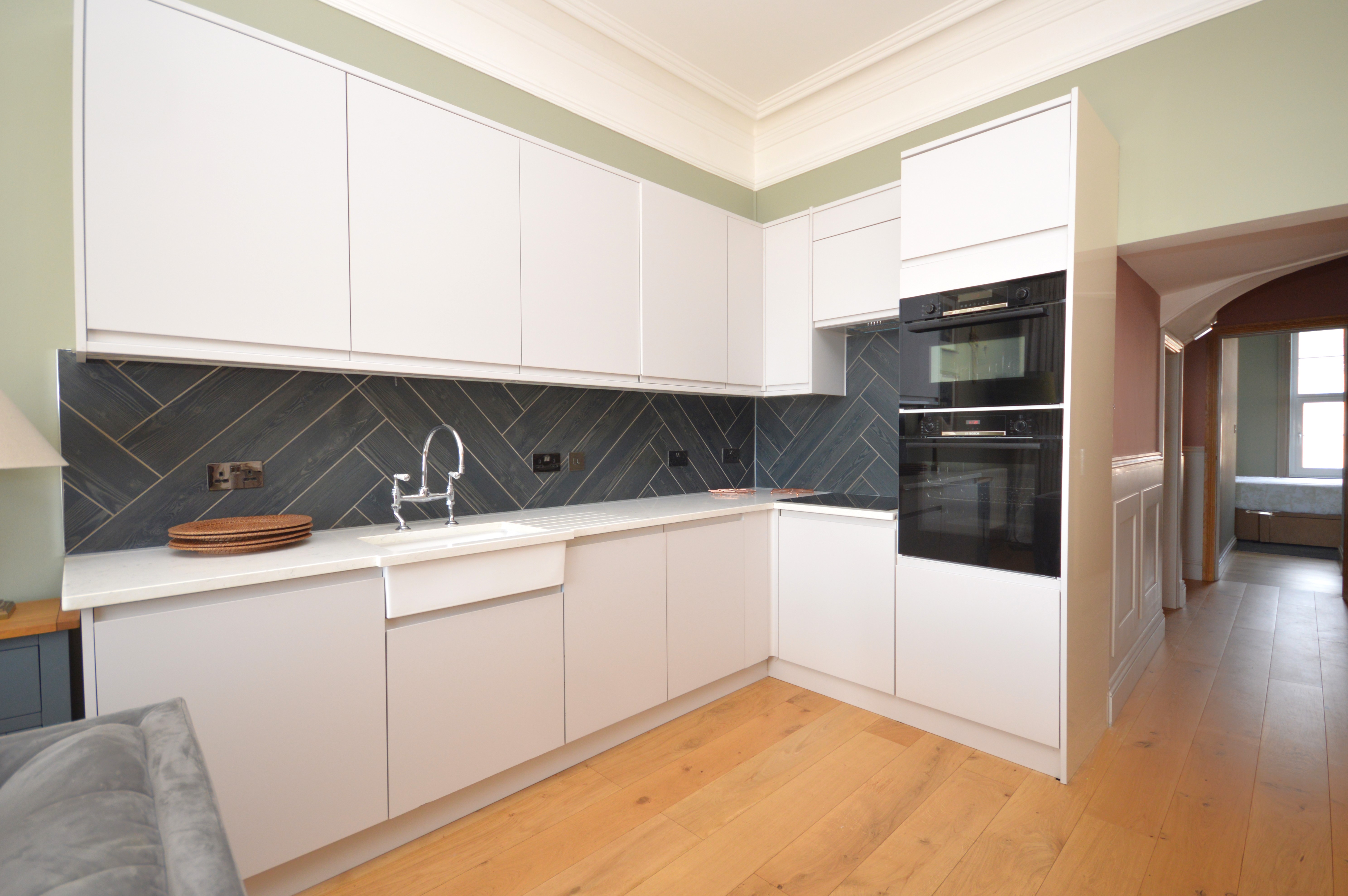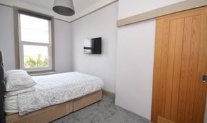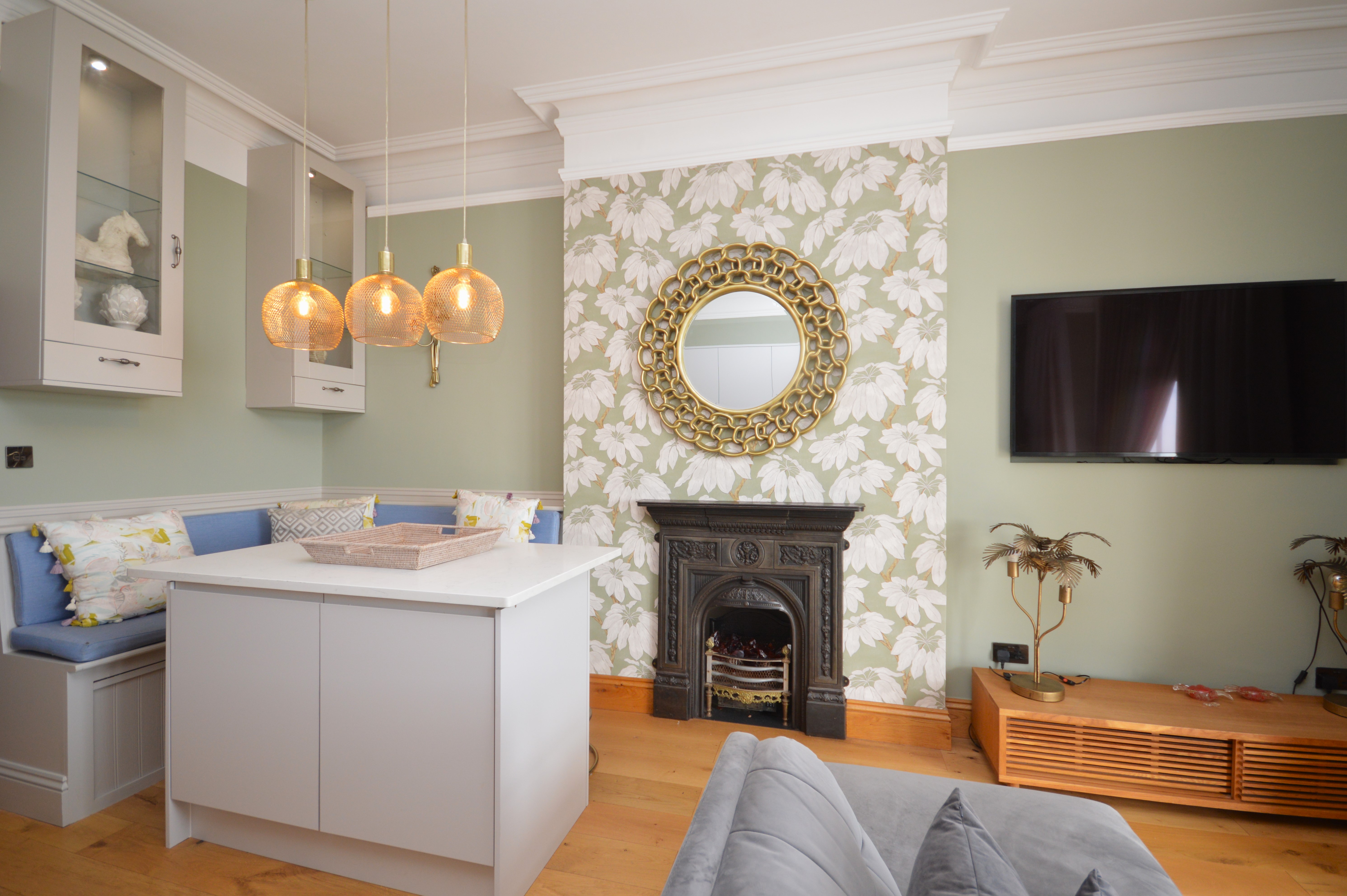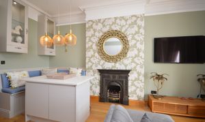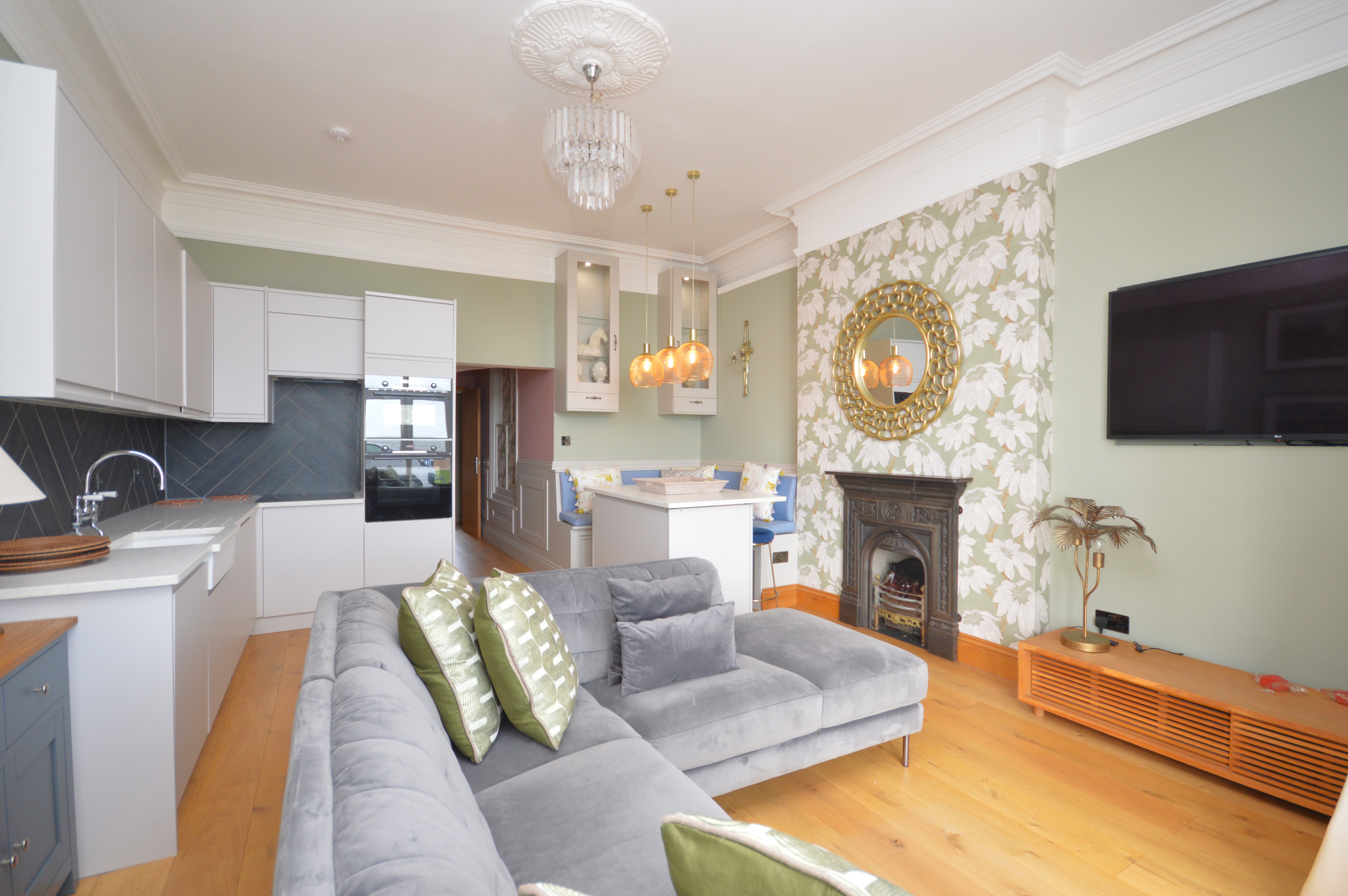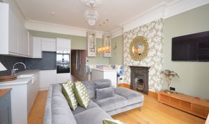 Large UPVC double glazed bay window with Stunning Sea view's. The Kitchen comprises of matching, white wall and base units, Belfast style sink, built in microwave, oven and dishwasher. Table/workbench with integrated fridge freezer and bespoke bench style seating. Additional over head cupboards. Engineered oak flooring, beautiful high ceiling with coving designer radiator and feature fireplace. Ceiling and wall lighting and wall TV housing.