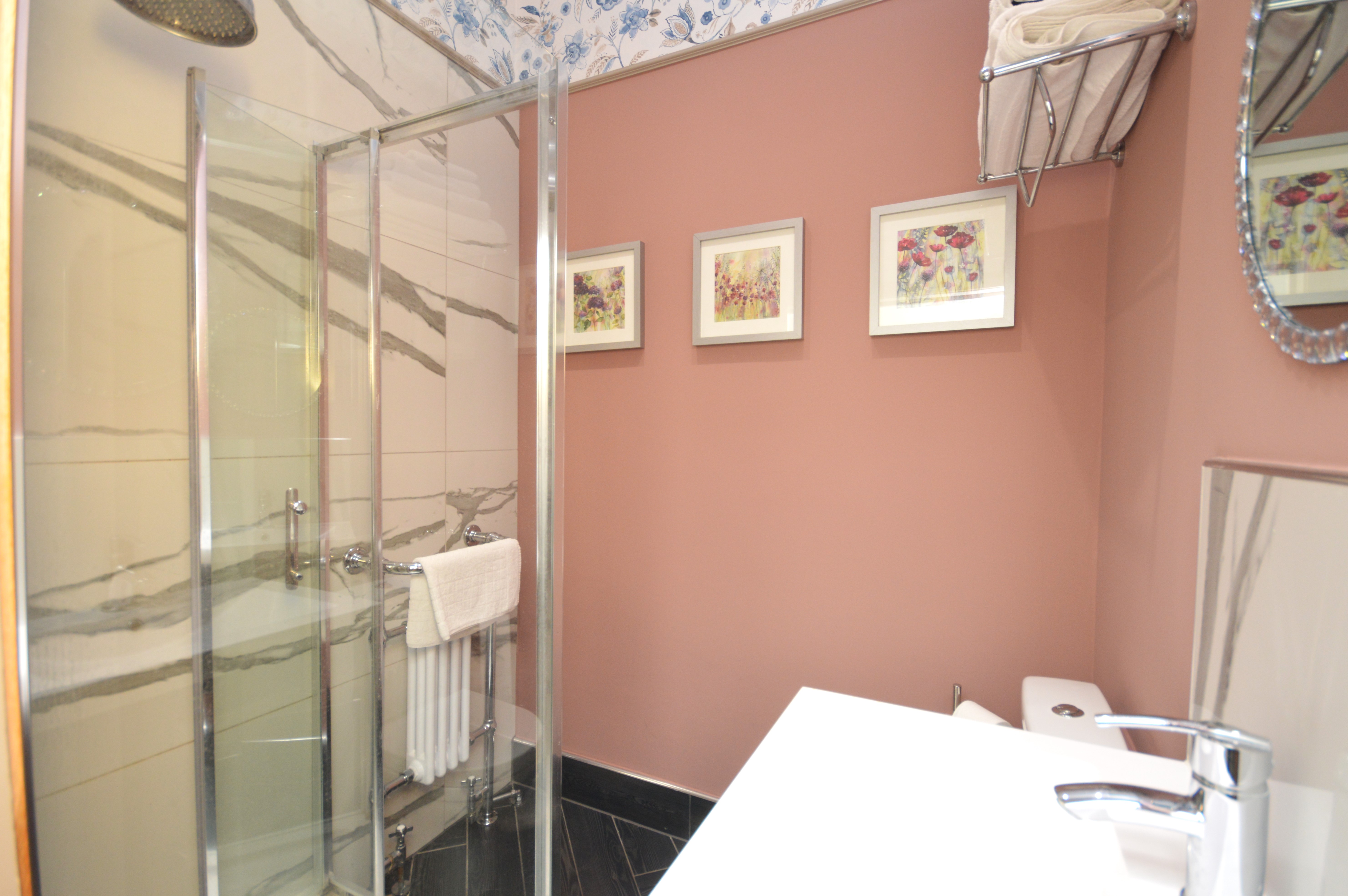 En-suite comprises of walk in shower, close coupled WC, hand basin and part tiled walls.