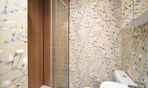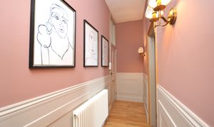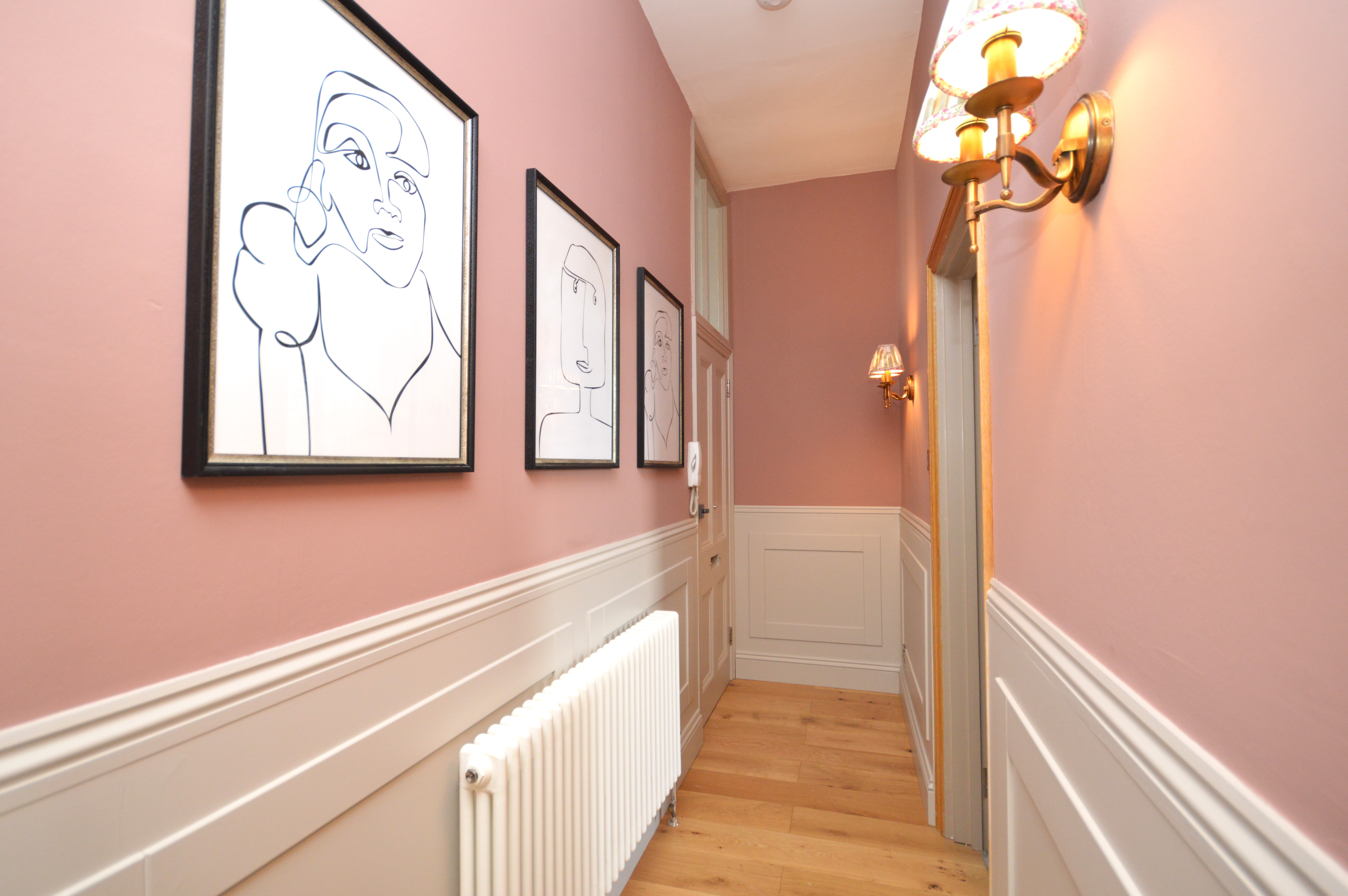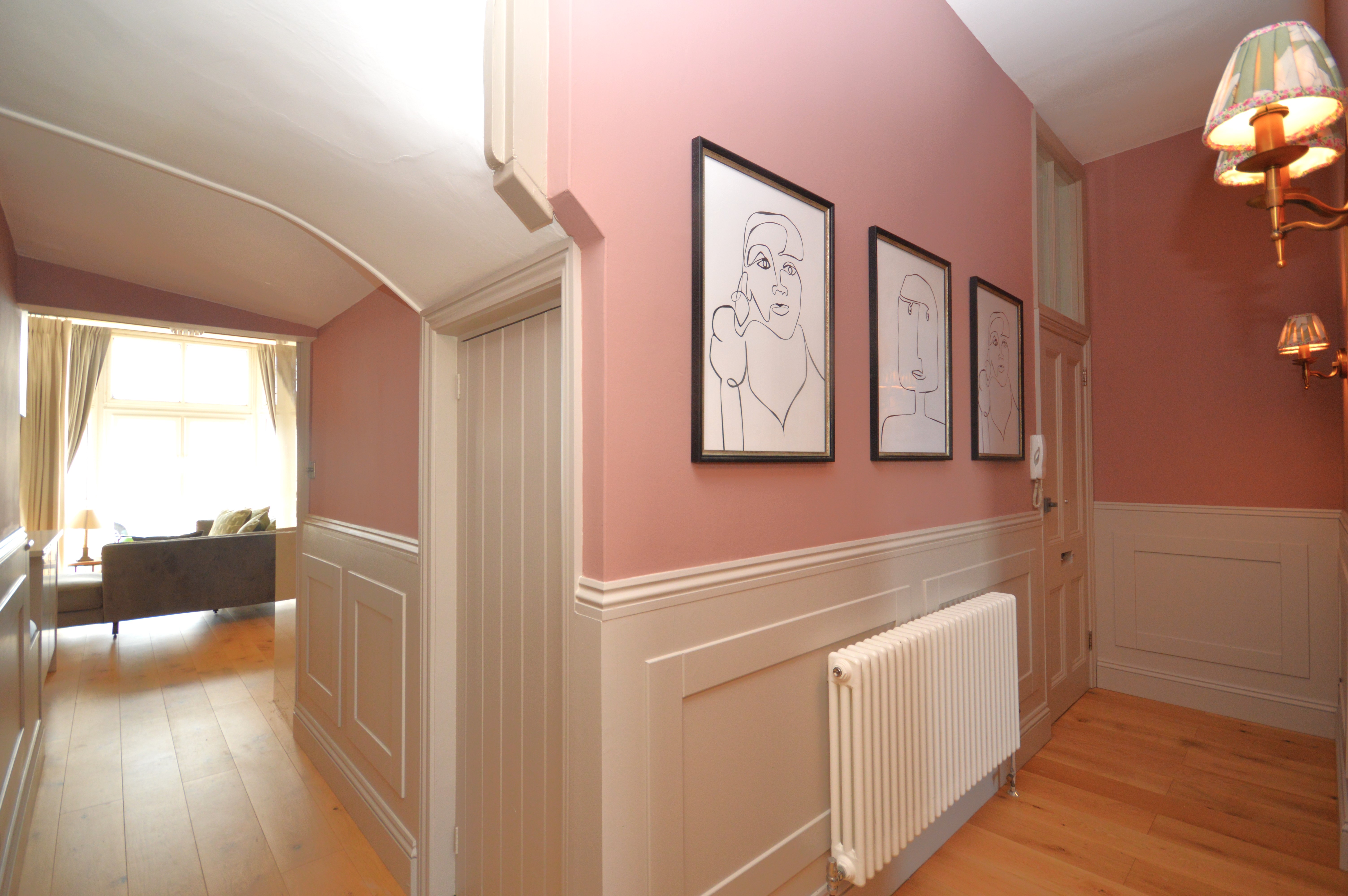 L - shaped entrance hall with solid, engineered oak flooring and designer radiator. There is decorative wood panelling on the walls, wall lights and a wall mounted phone entry system. Solid wooden front door. Storage cupboard which can house a washing machine. Doors leading to :-