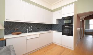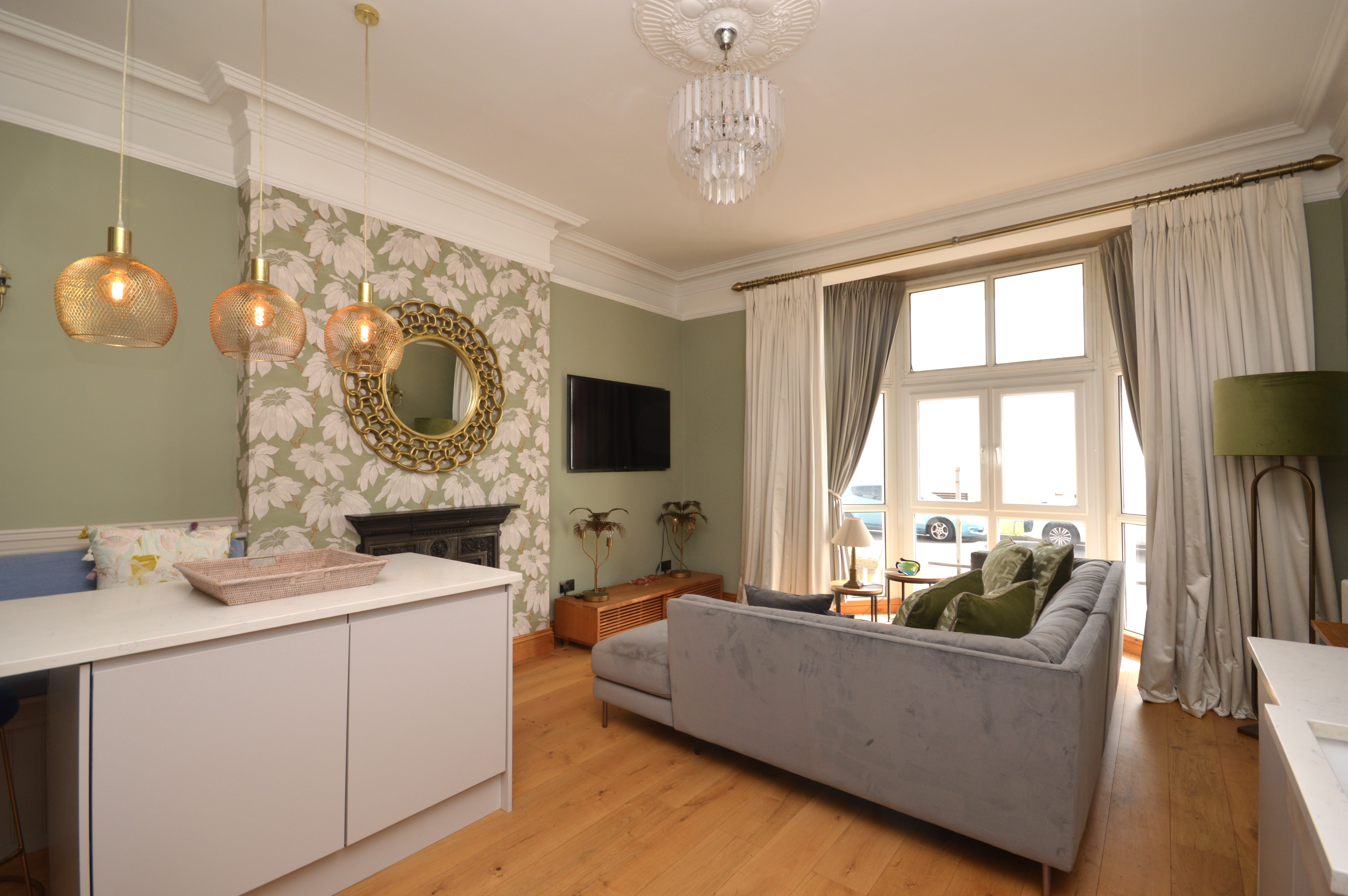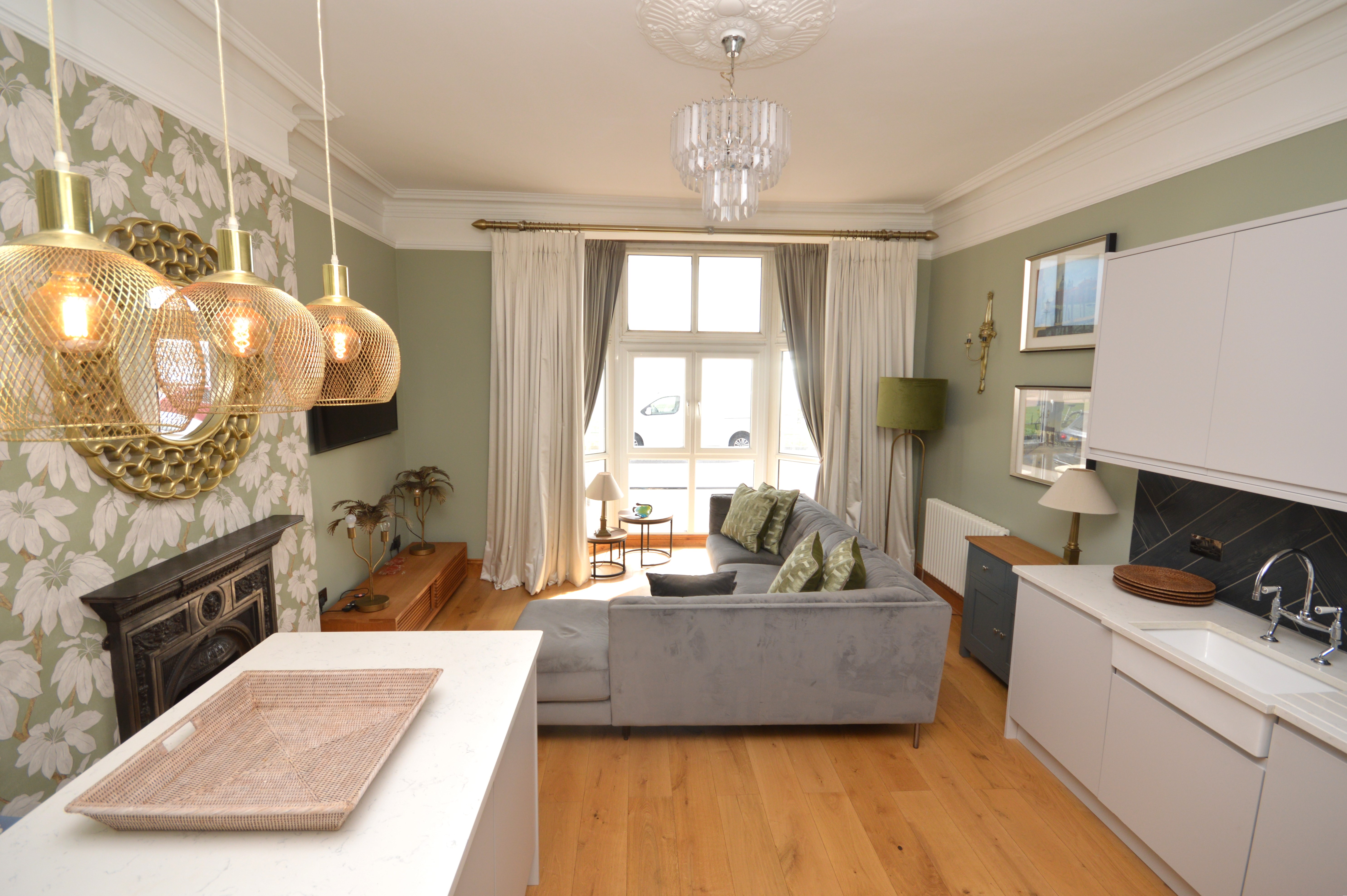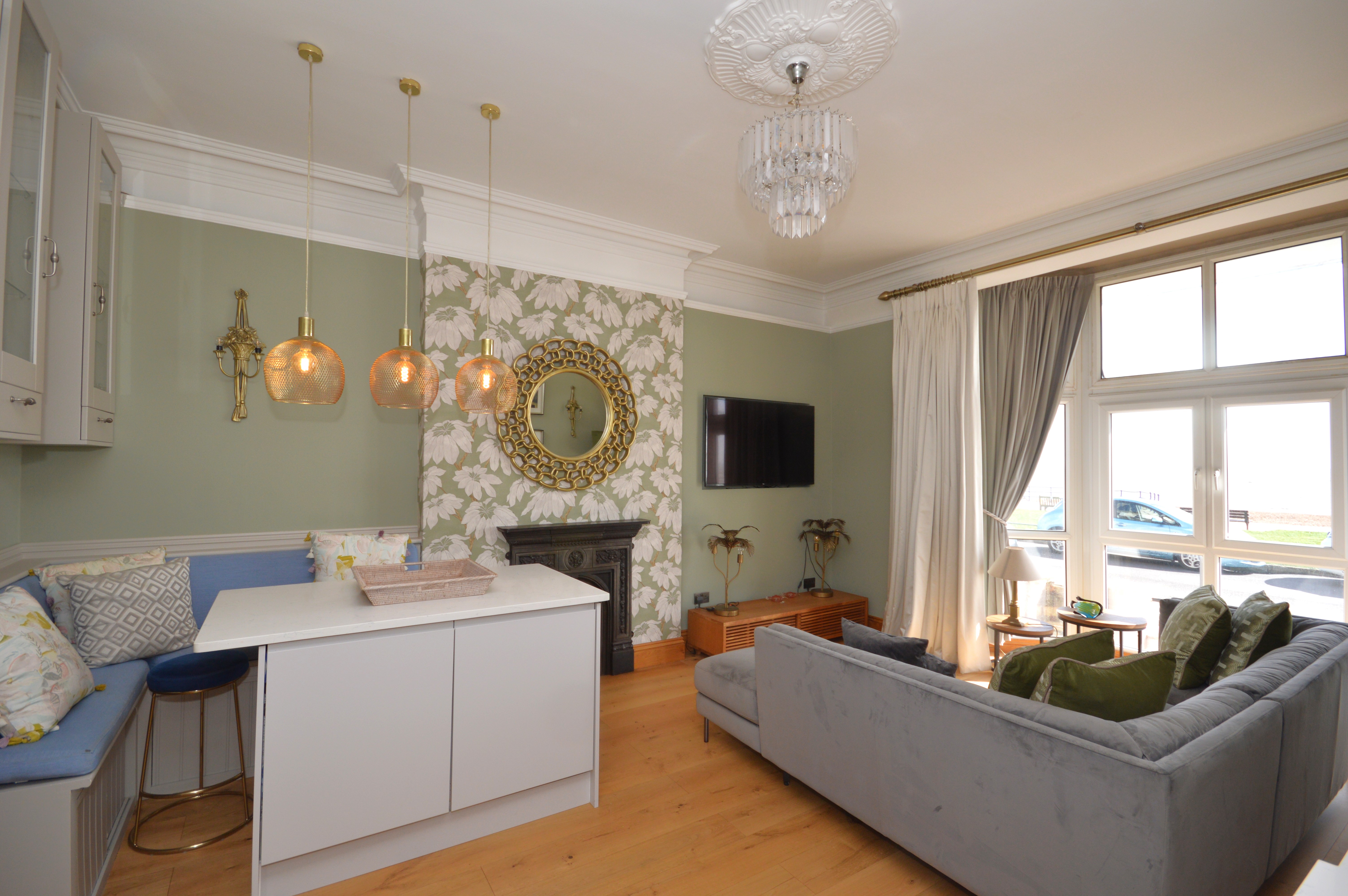 The classic lounge overlooks the sea with a large picture window but ensures privacy. This room also incorporates a new, fully fitted kitchen, with additional bespoke, dining area. The ground floor location ensures easy access to the property and a car free promenade.