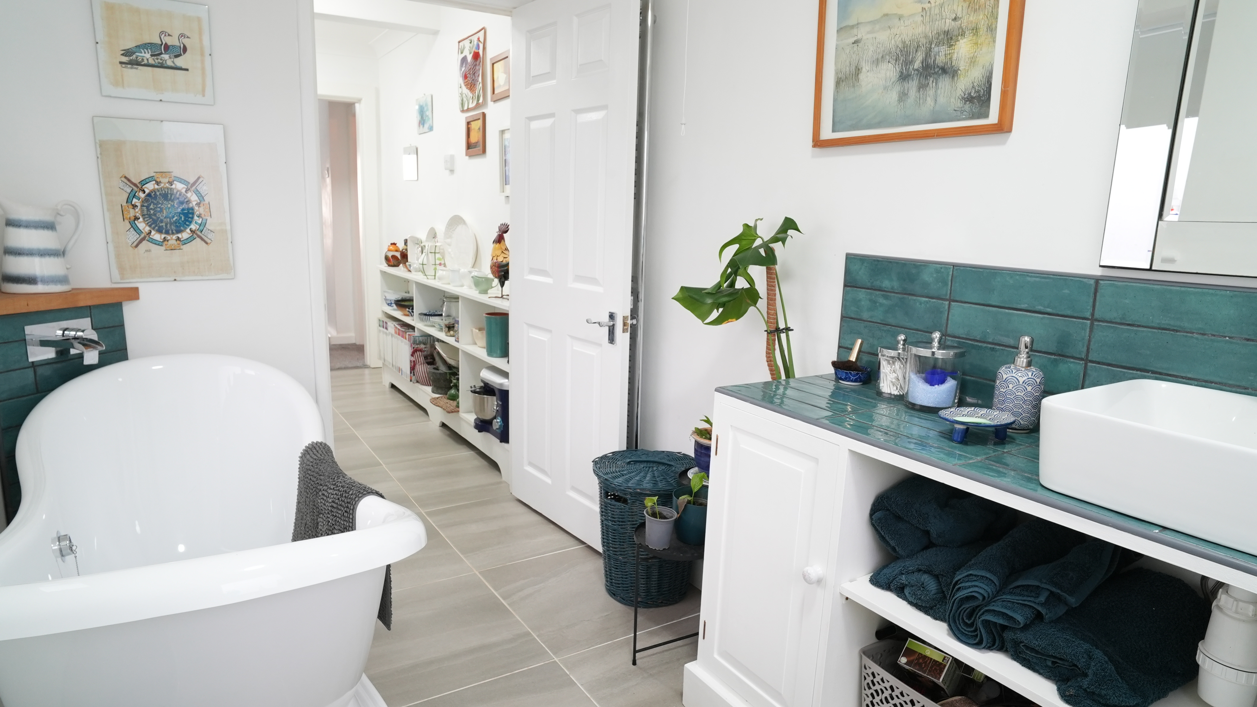 With tiled flooring, free standing bath, wash basin on vanity unit with tiled top and splashback.