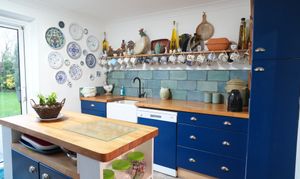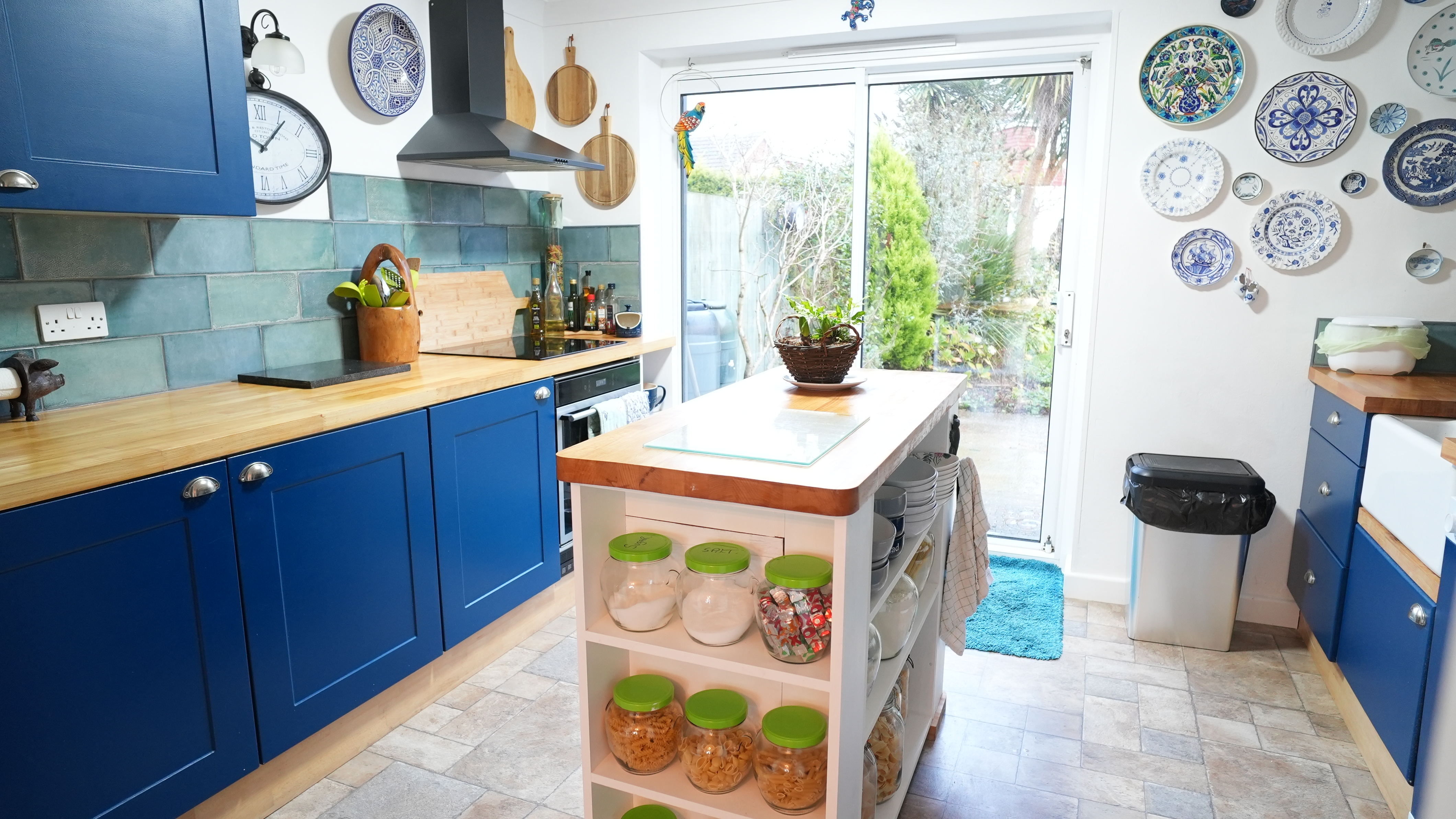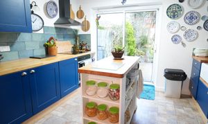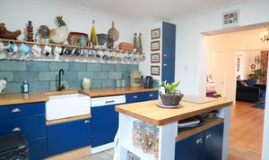 With laminate floor, Shaker style doors, wood worktop, Belfast sink, integrated oven, hob and dishwasher, extractor fan, cooks island, sliding patio doors to the garden, and tiled splashbacks.