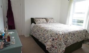 With laminate flooring, archway leading to kitchen and living room, and radiator.
