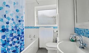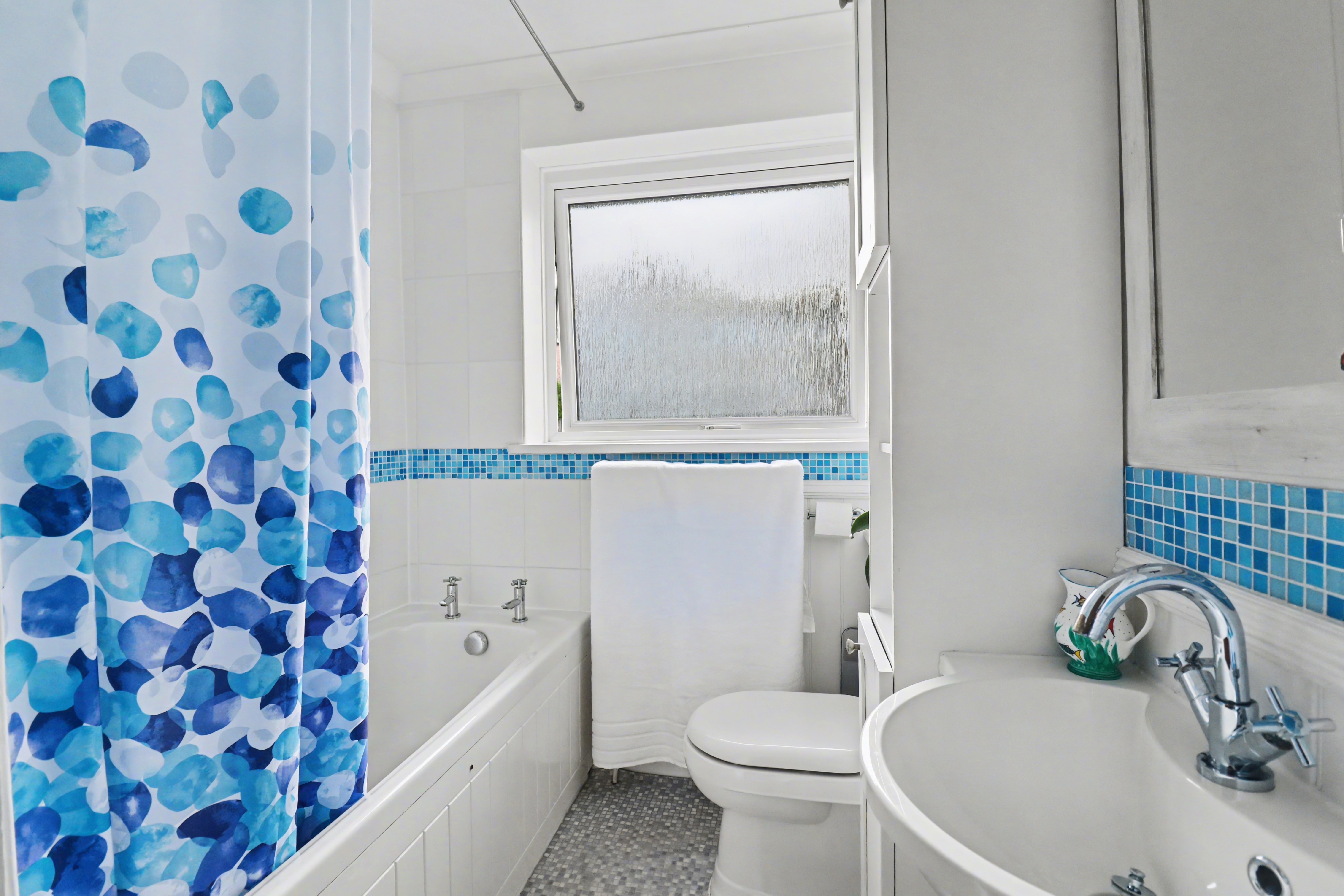 The modern family bathroom comprises a panel enclosed bath with shower over, wash hand basin, WC and a window to the rear.